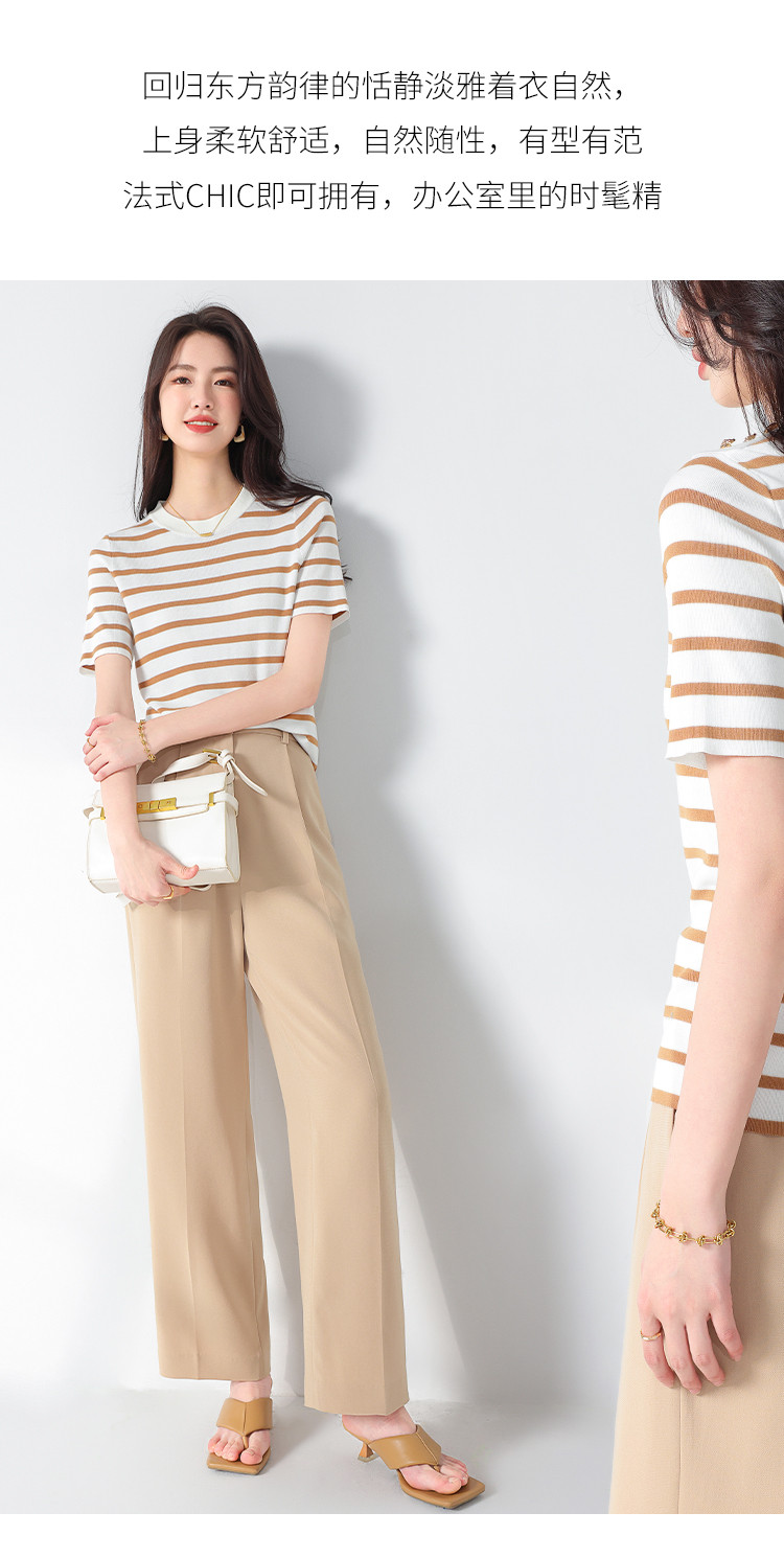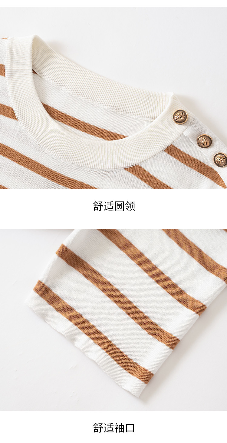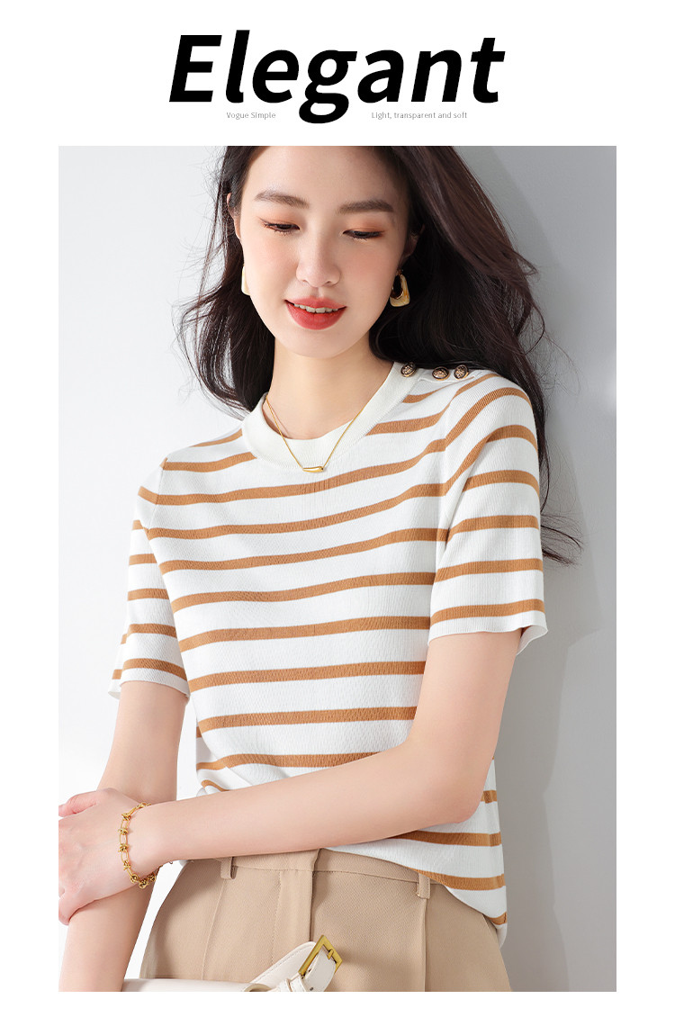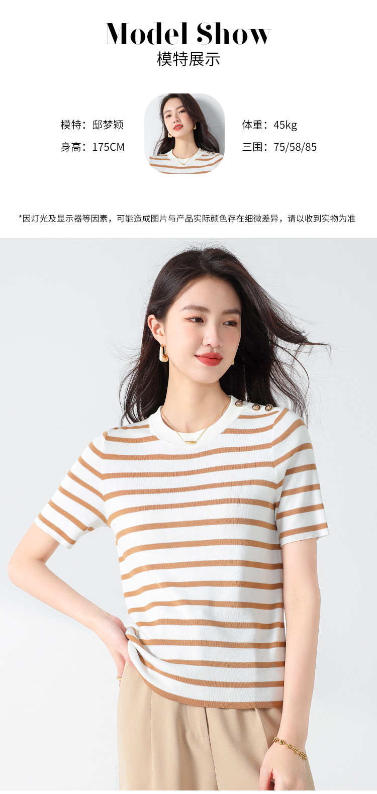【含桑蚕丝】夏经典条纹撞色圆领短袖T恤女针织打底衫 875347