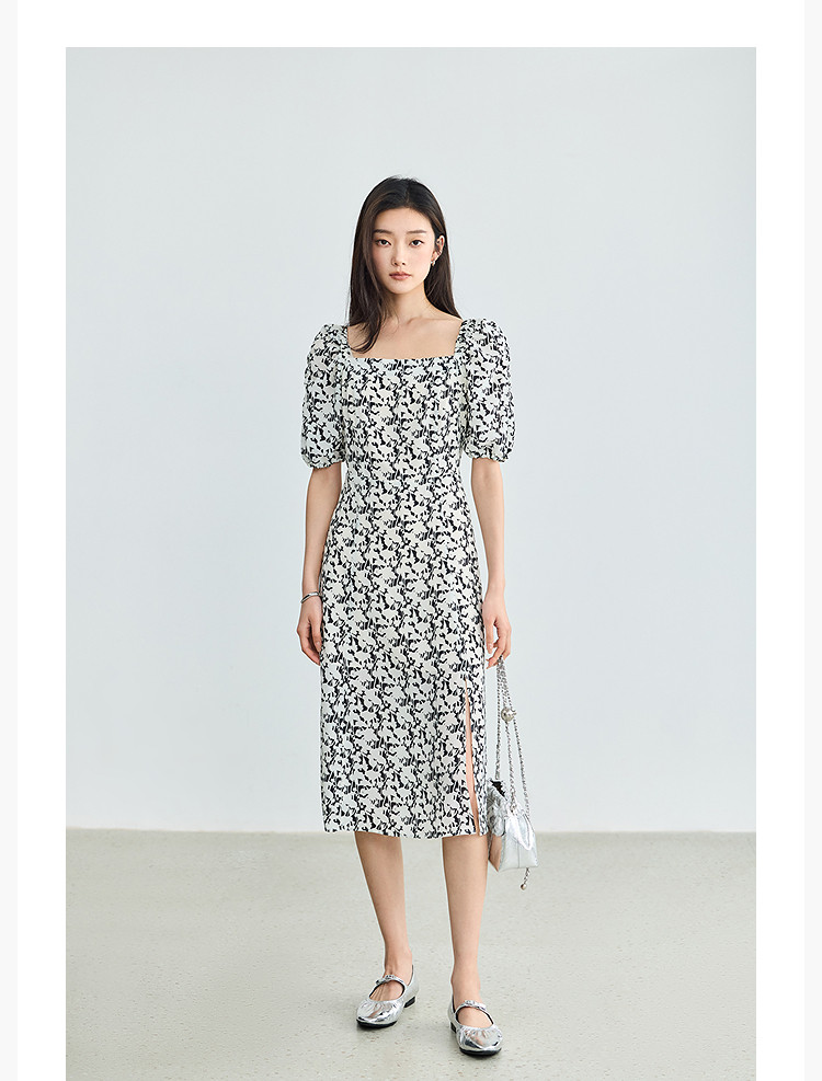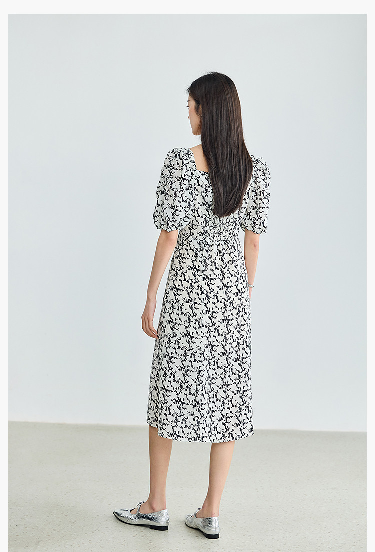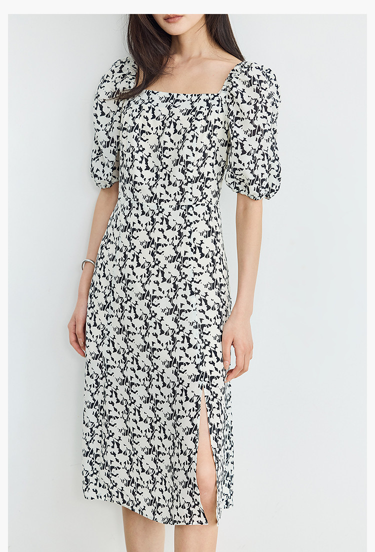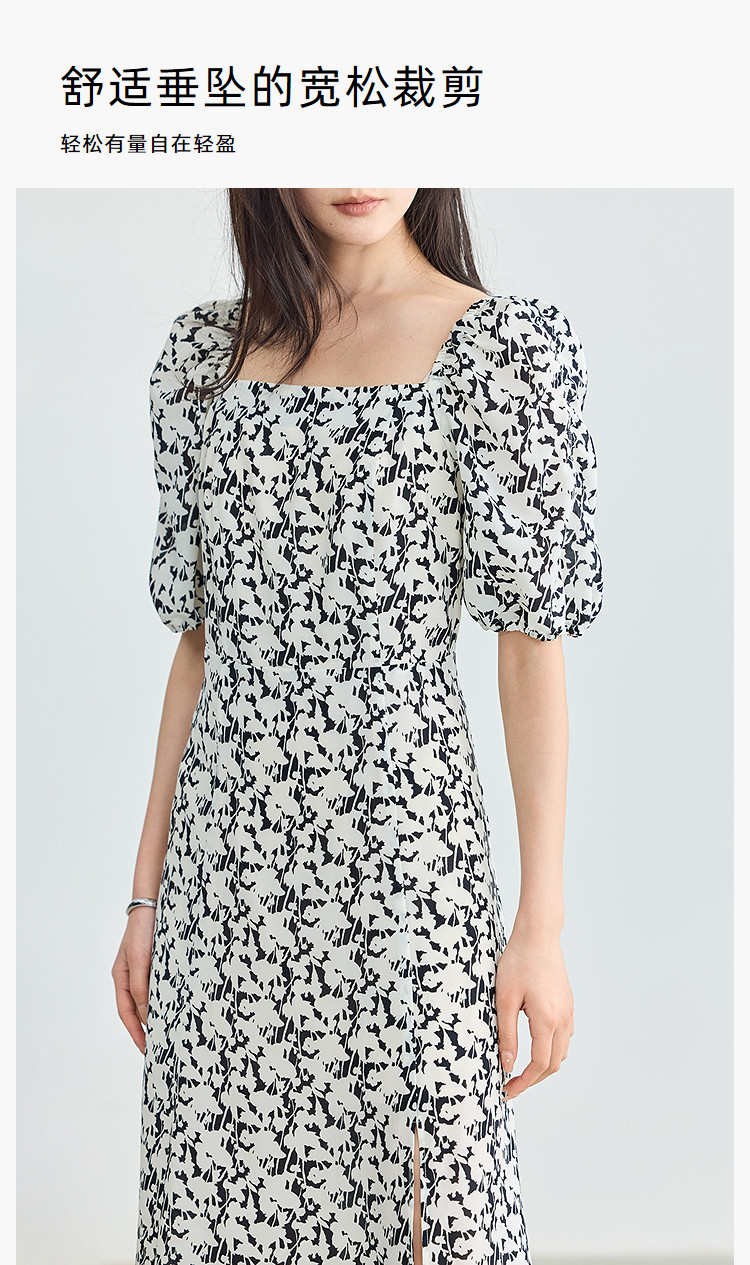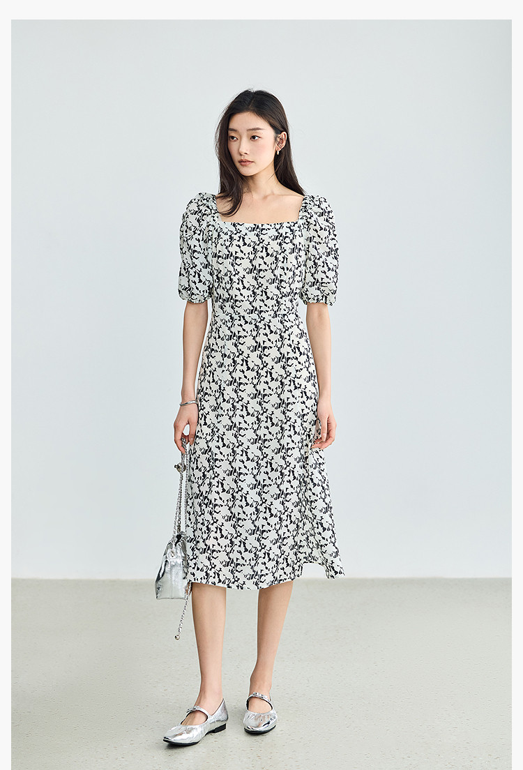 夏季浪漫气质印花法式复古方领通勤长款高腰连衣裙 337627
