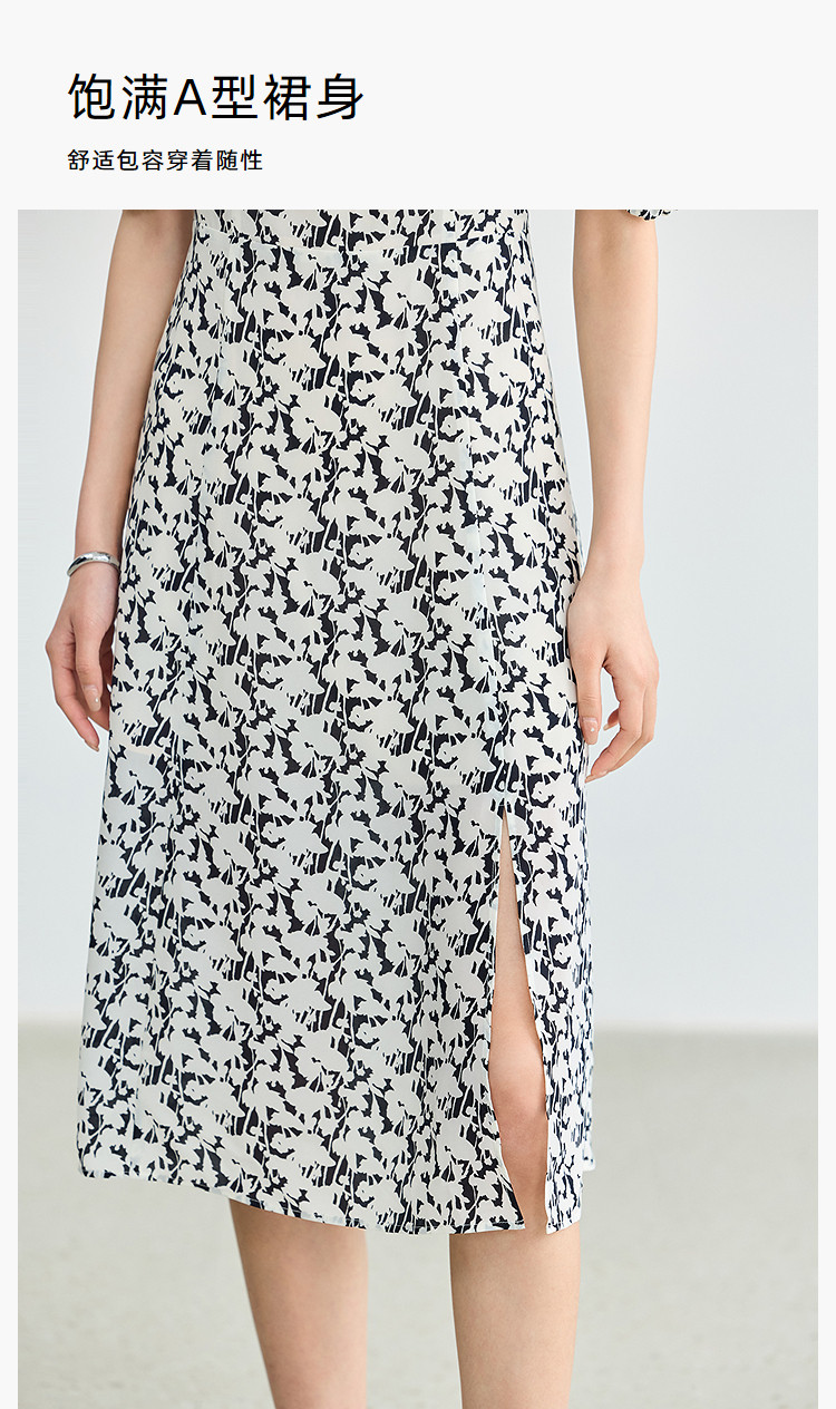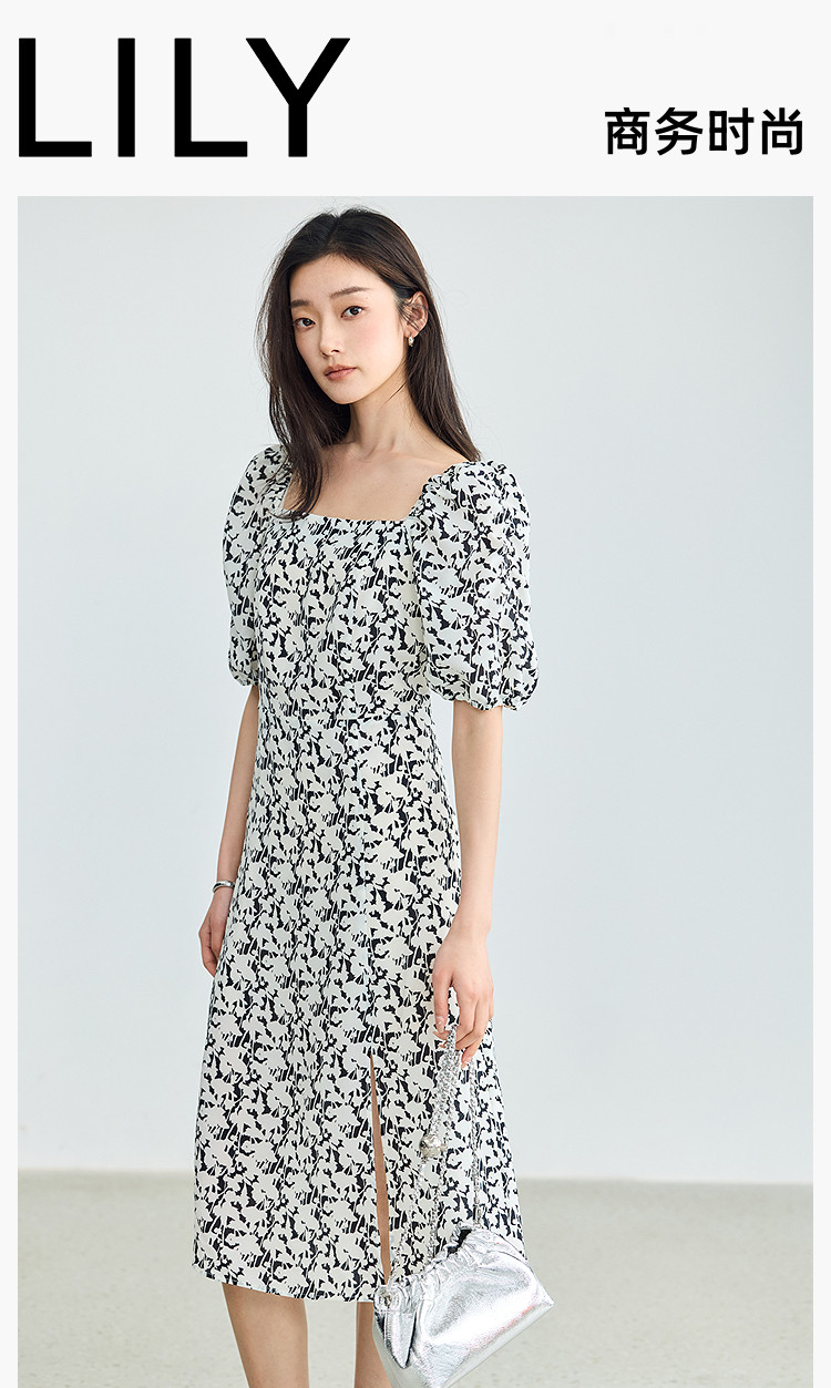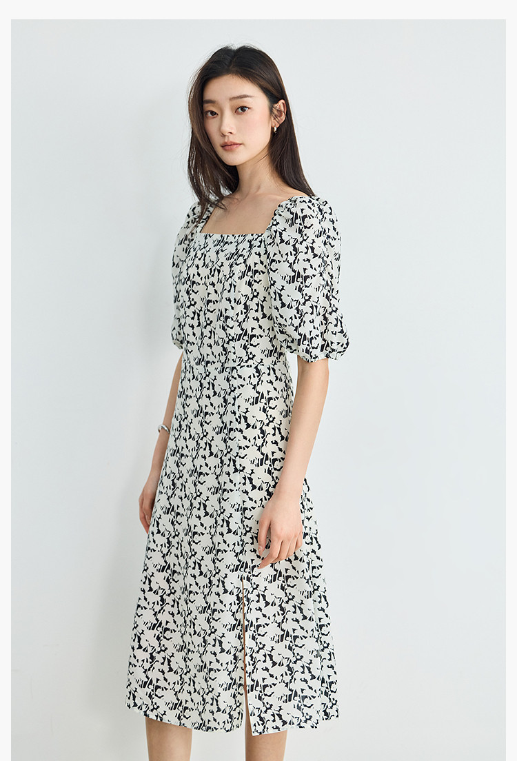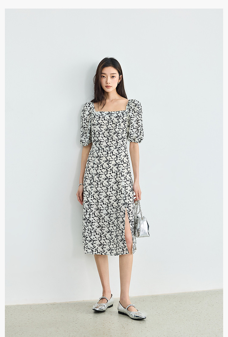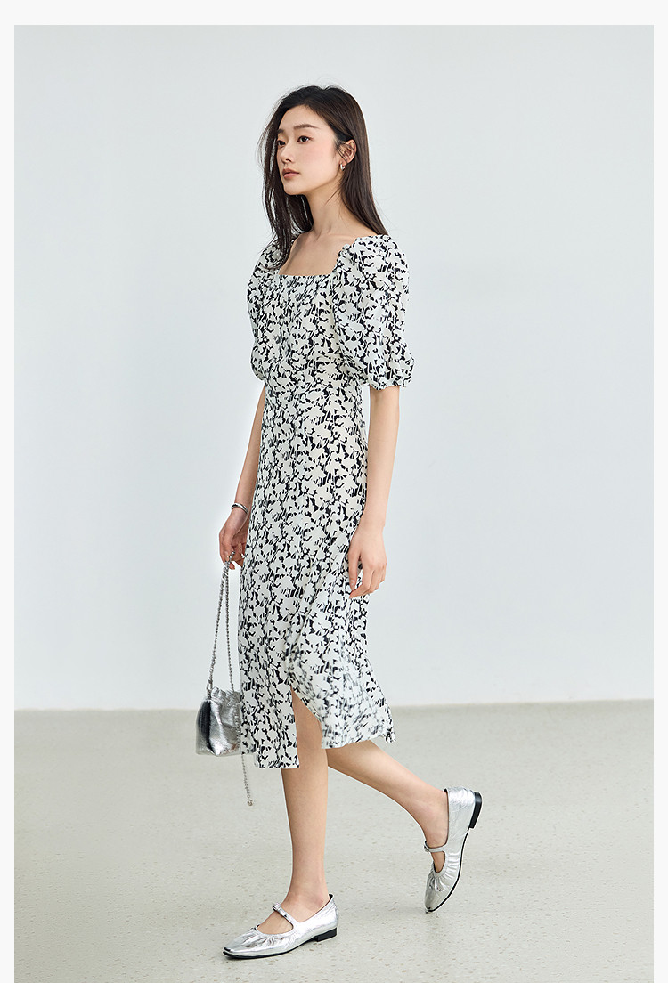 夏季浪漫气质印花法式复古方领通勤长款高腰连衣裙 337627