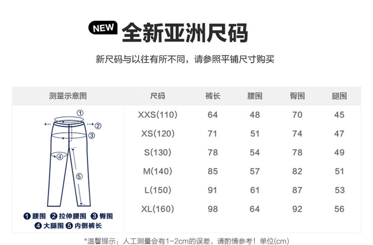 | 尺码 | 身高(cm) | 腰围(cm) | 裤长(cm) | 臀围(cm) | 适合年龄 | 号型 |