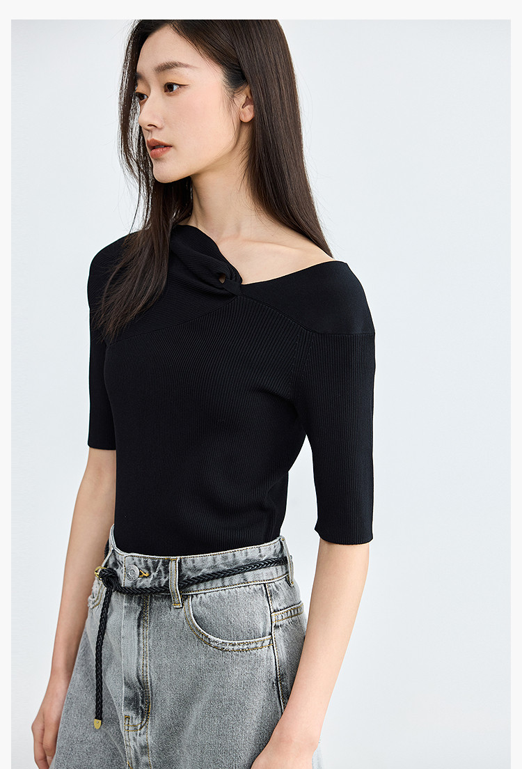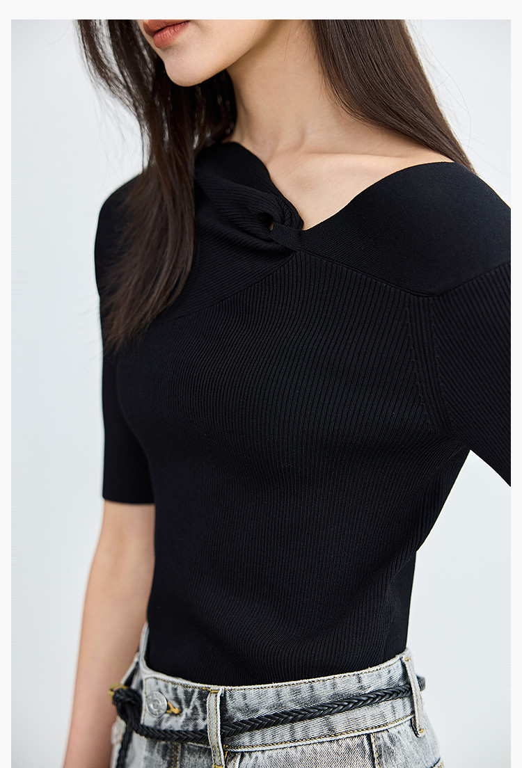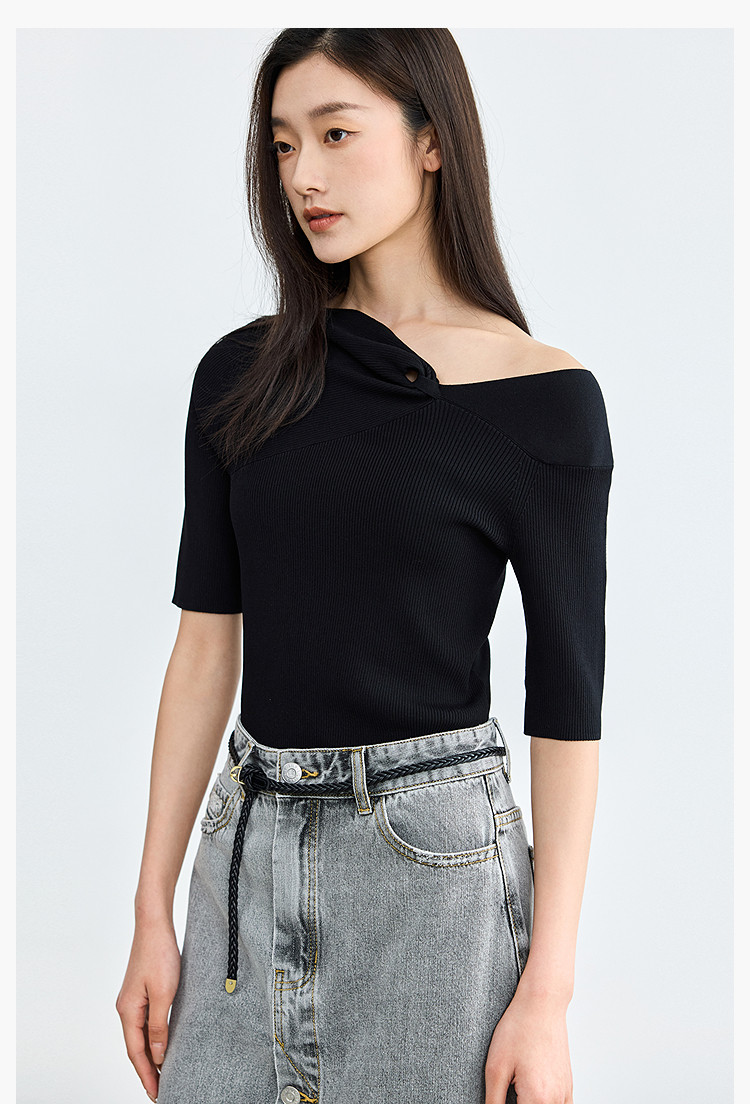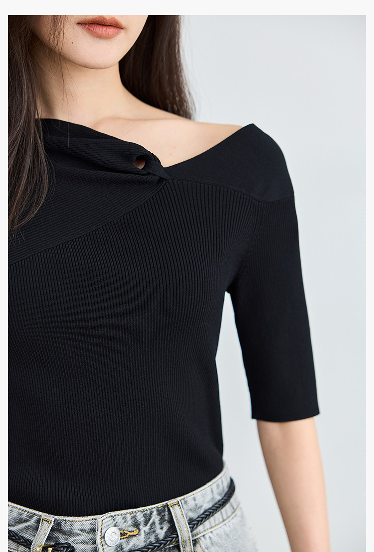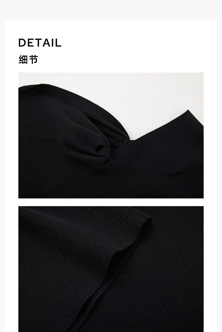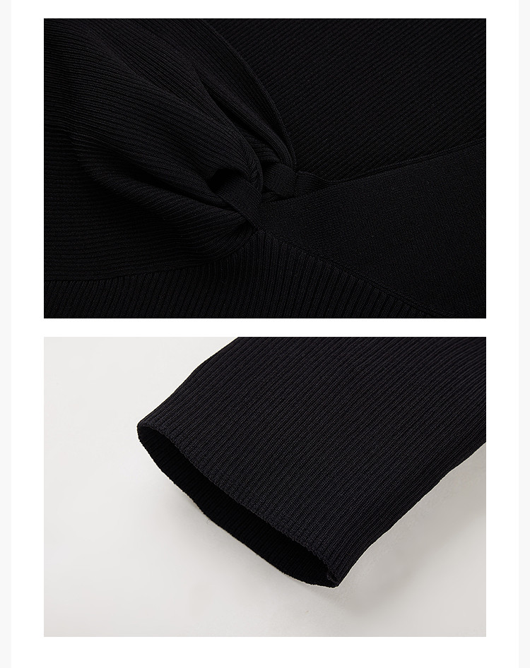 商品名称:【春季】设计感扭结露肩时尚气质黑色修身针织衫 093979