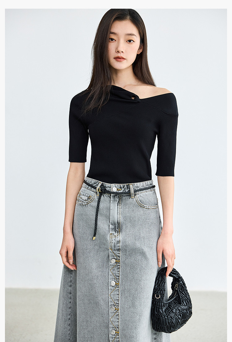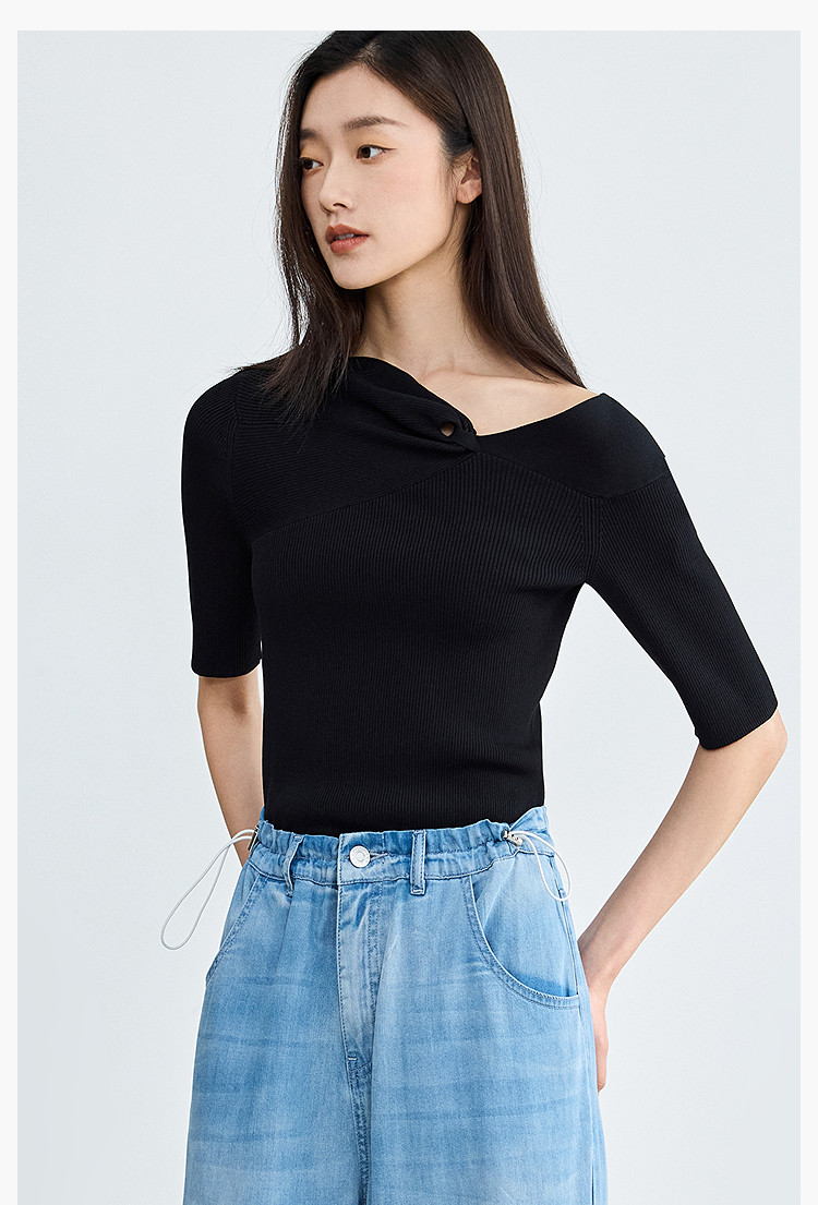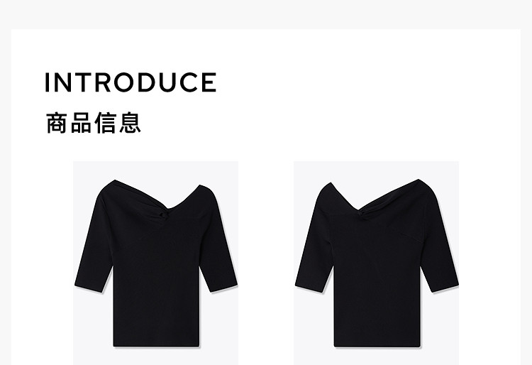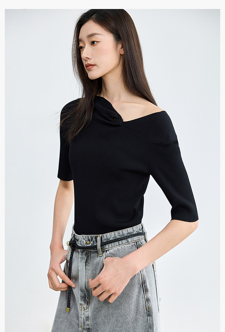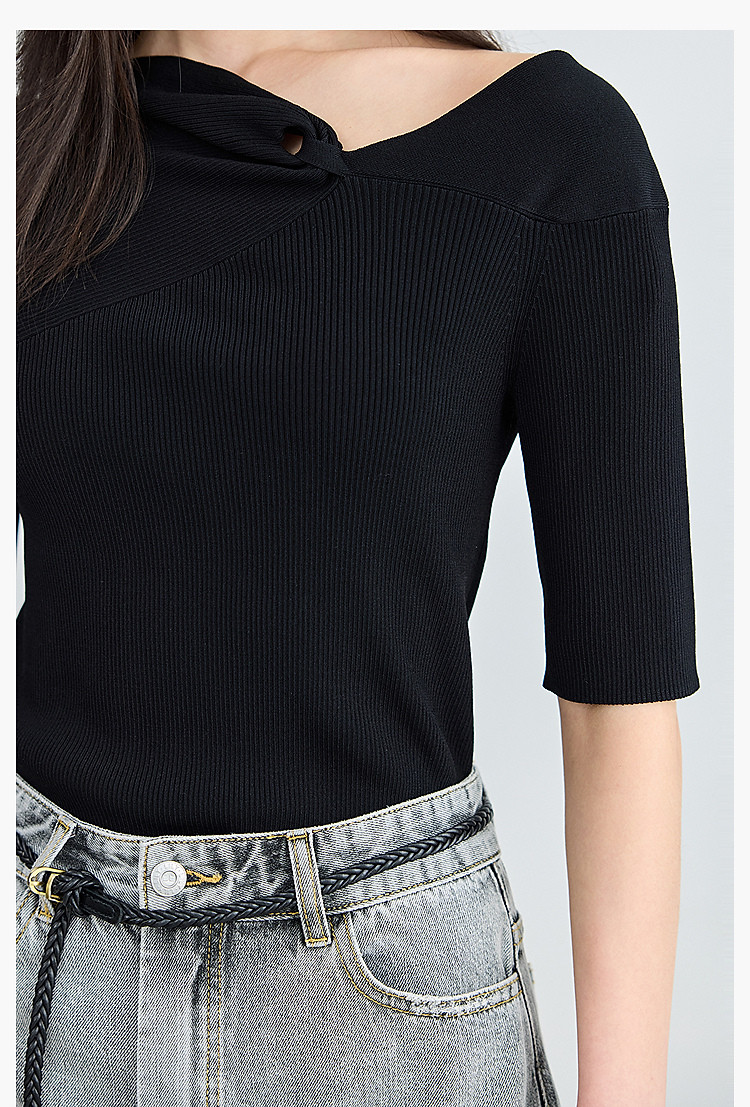 商品名称:【春季】设计感扭结露肩时尚气质黑色修身针织衫 093979