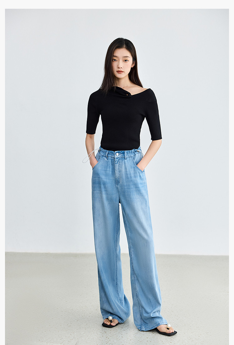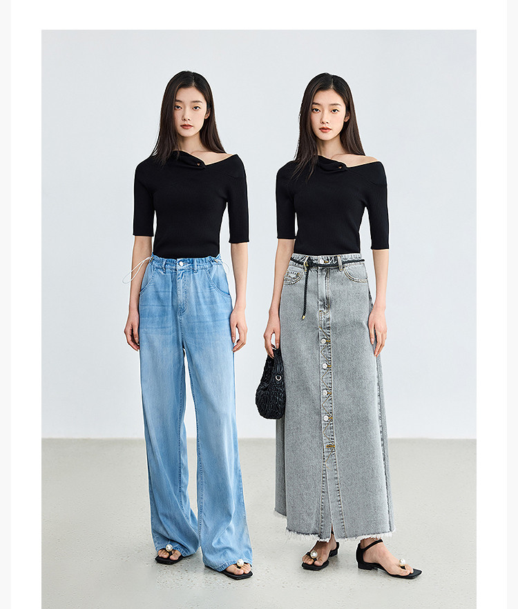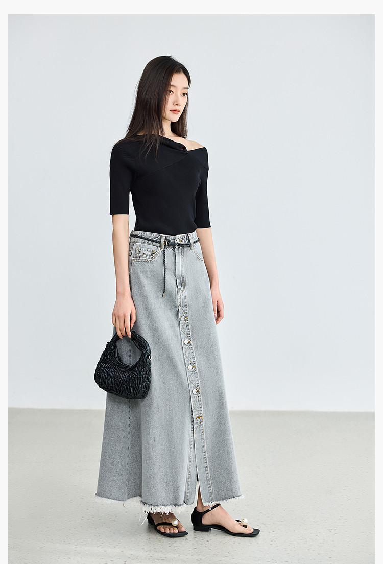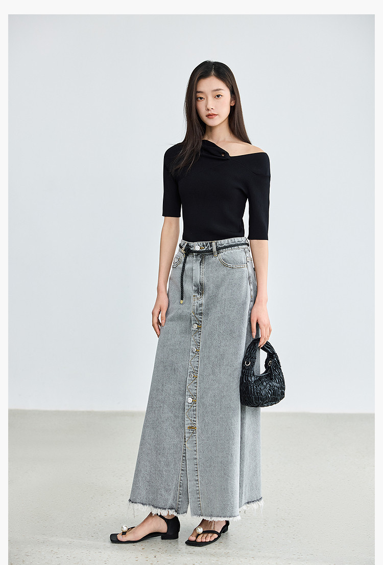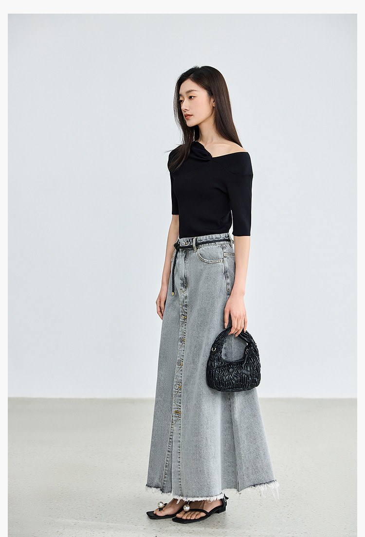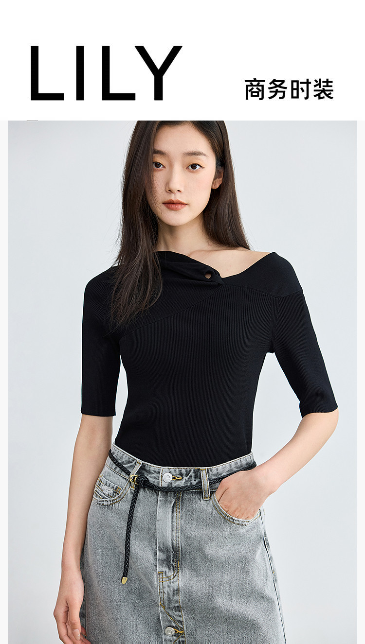 商品名称:【春季】设计感扭结露肩时尚气质黑色修身针织衫 093979