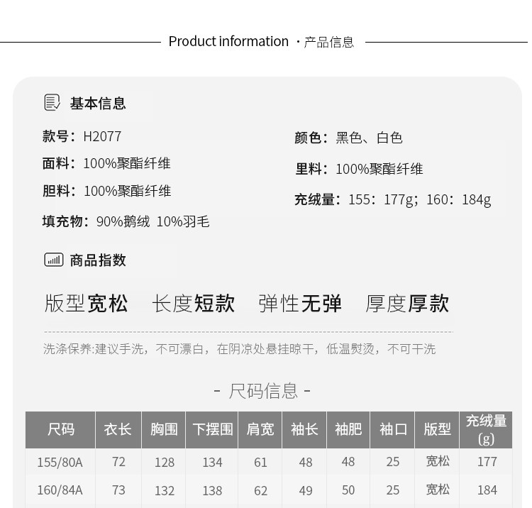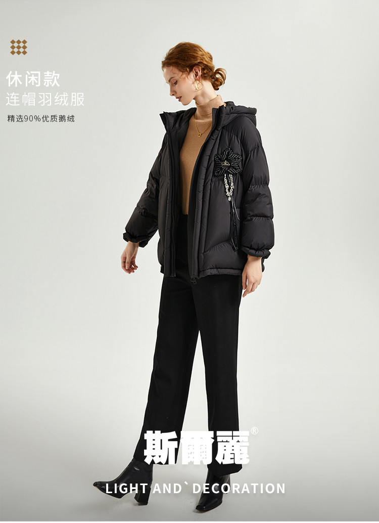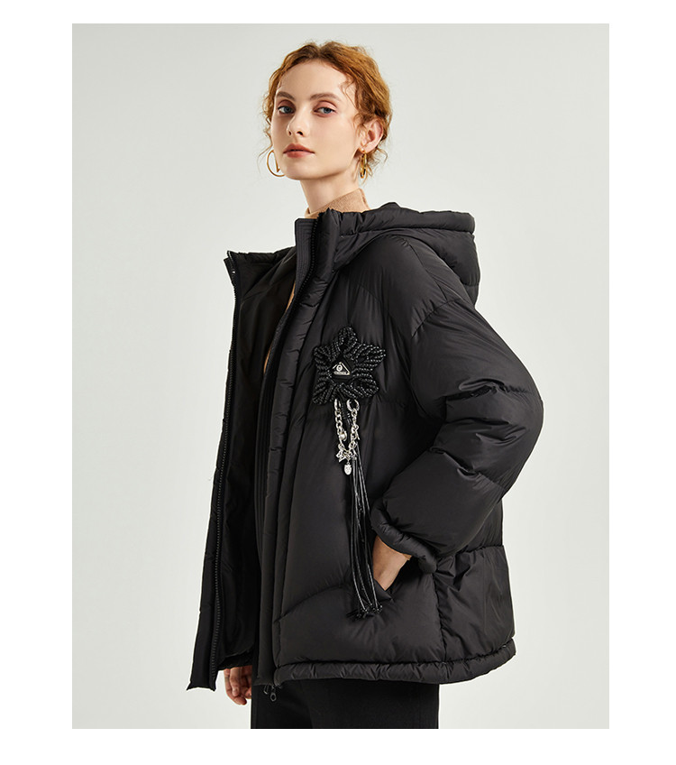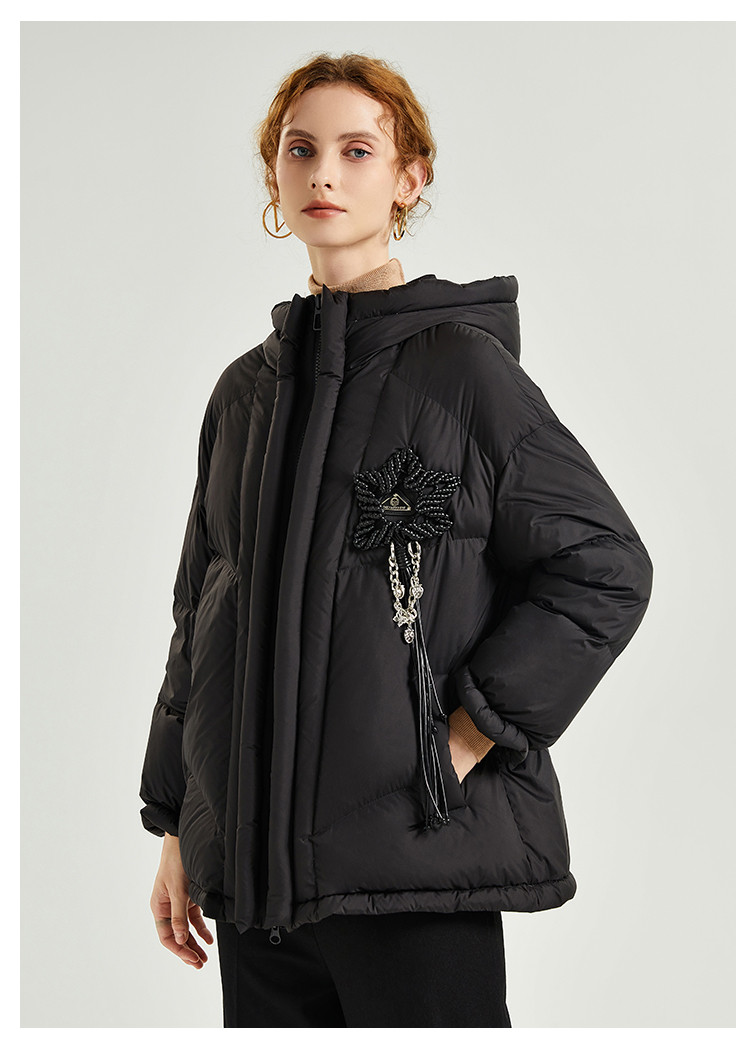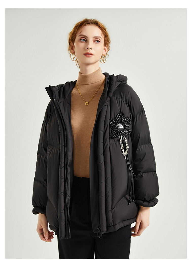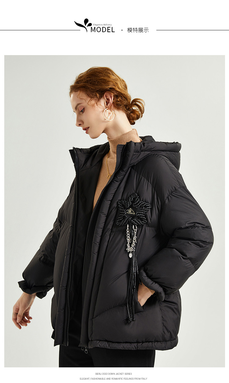 商品名称:【鹅绒】厚款保暖连帽女士短款宽松休闲泡芙羽绒服 875871