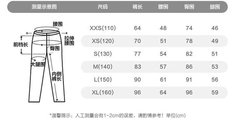 | 尺码 | 身高(cm) | 腰围(cm) | 裤长(cm) | 臀围(cm) | 适合年龄 | 号型 |