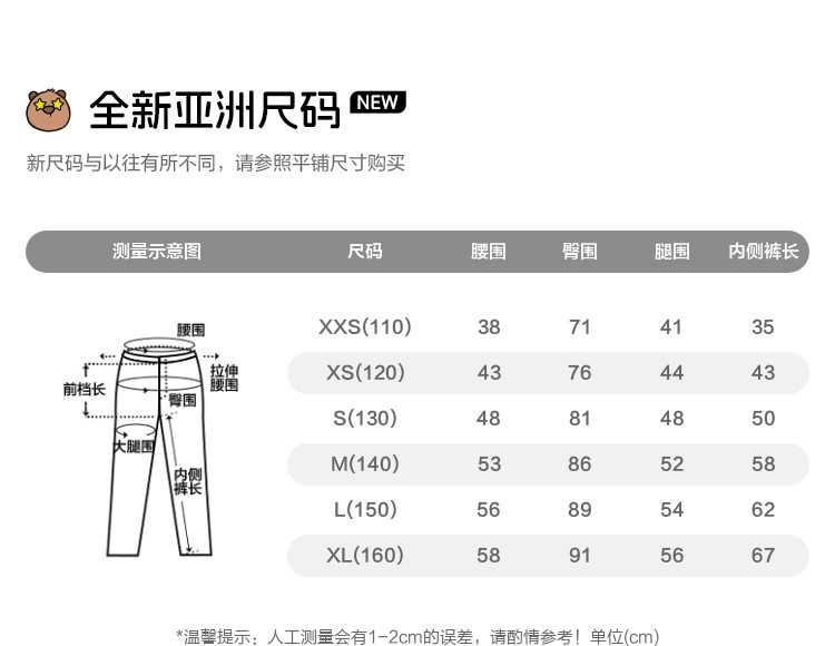 | 尺码 | 身高(cm) | 腰围(cm) | 裤长(cm) | 臀围(cm) | 适合年龄 | 号型 |