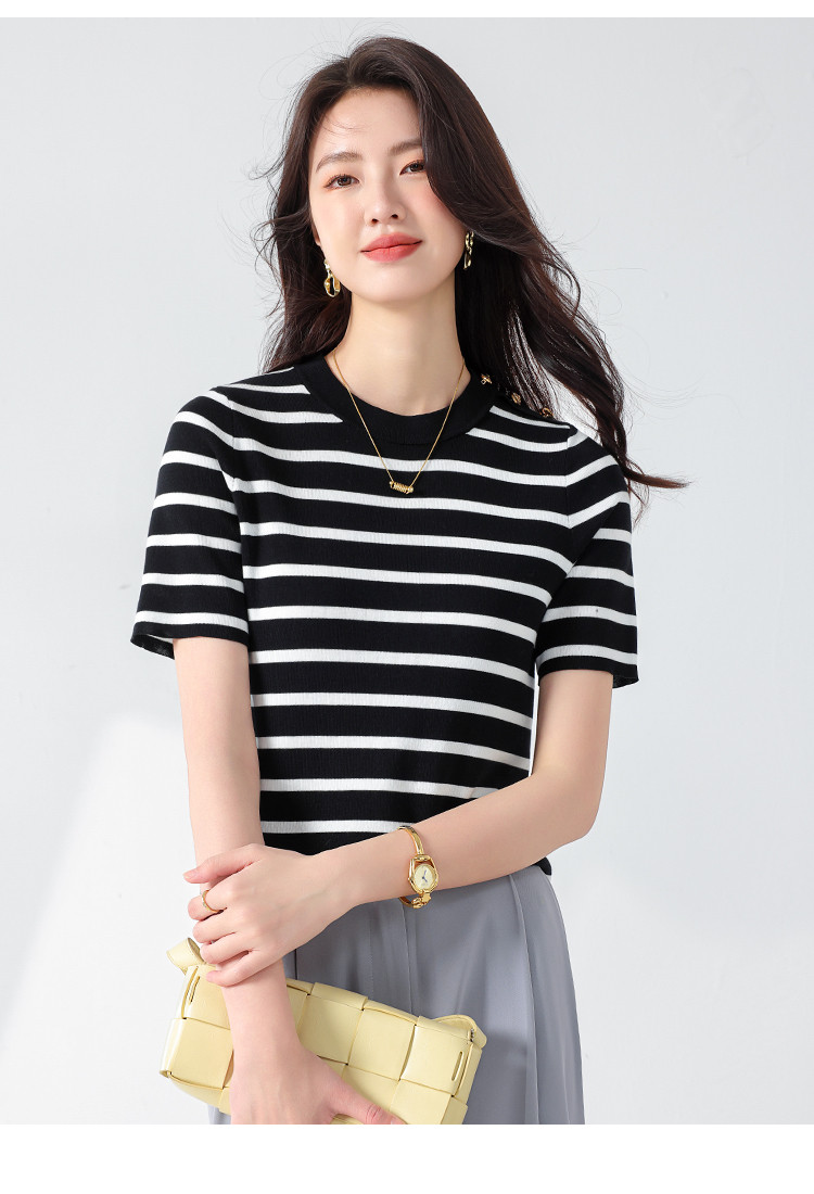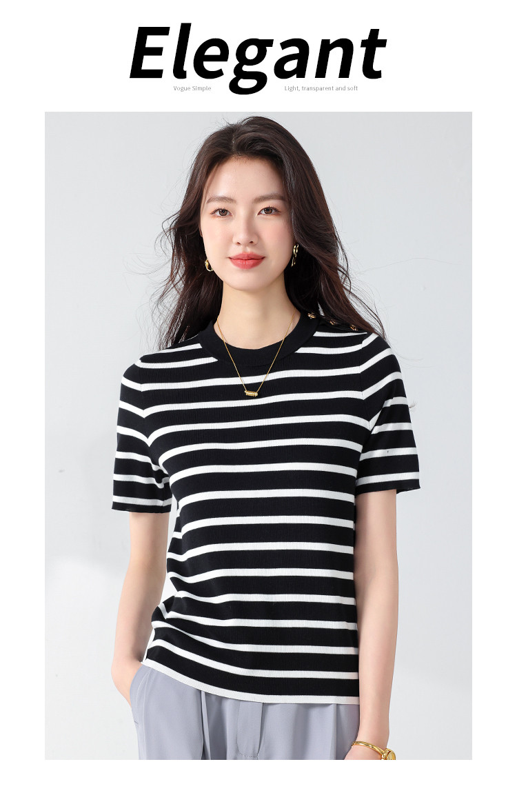【含桑蚕丝】夏经典条纹撞色圆领短袖T恤女针织打底衫 899923