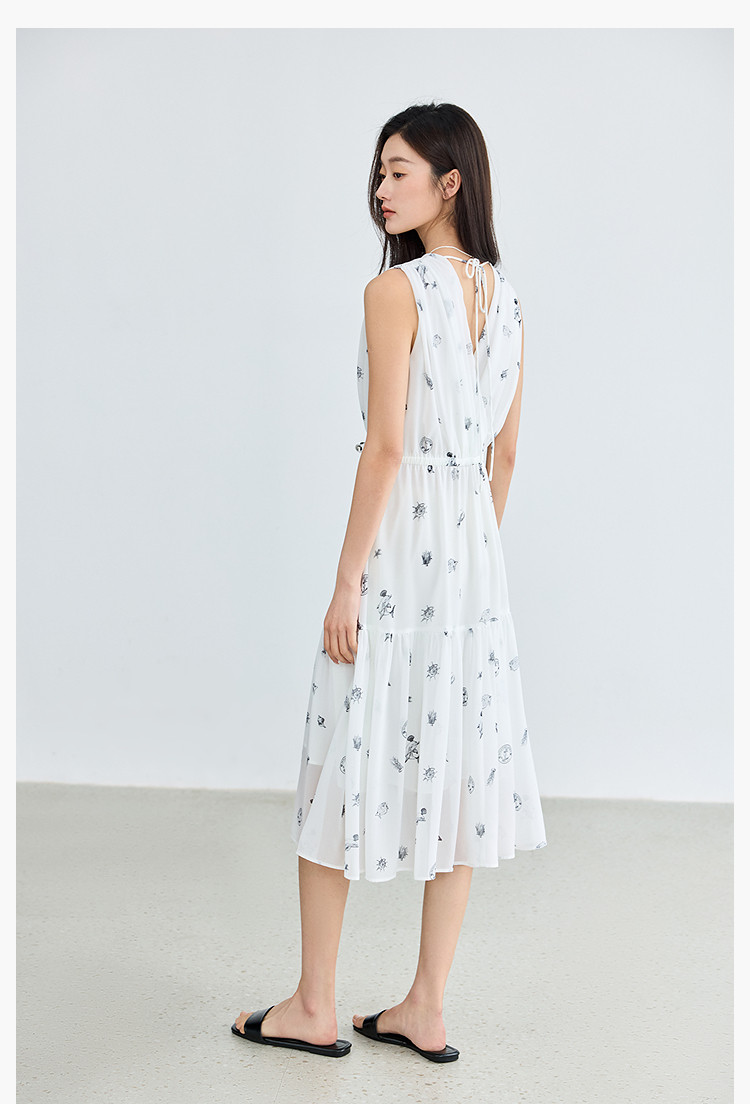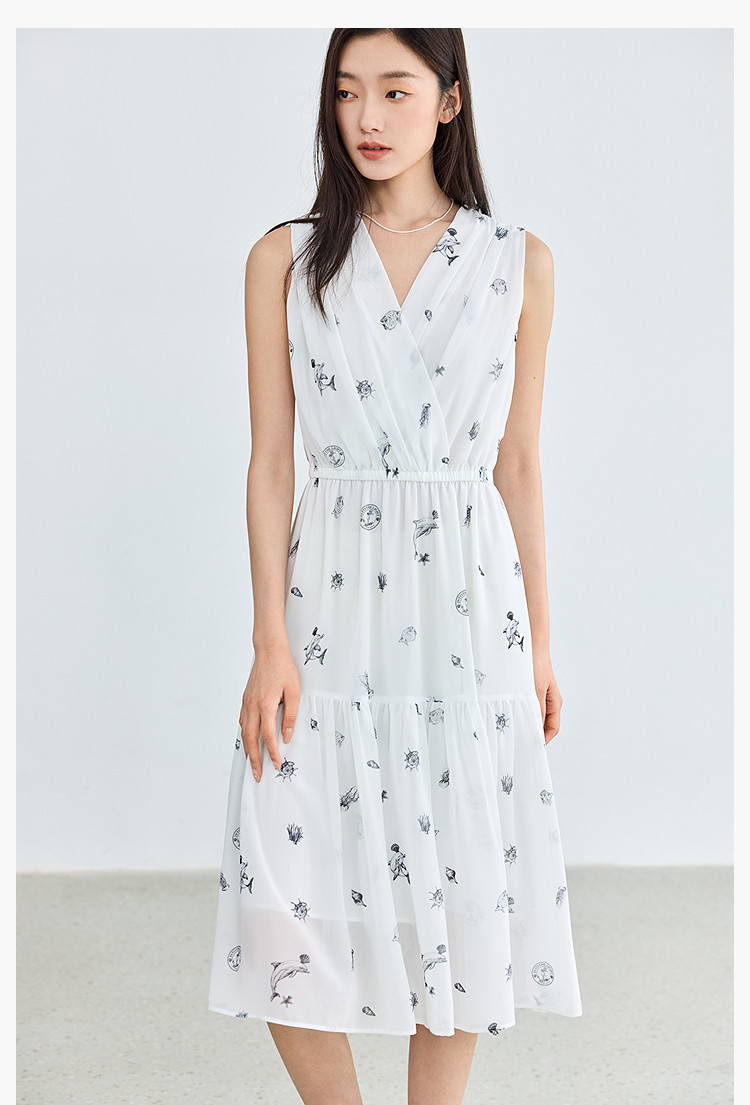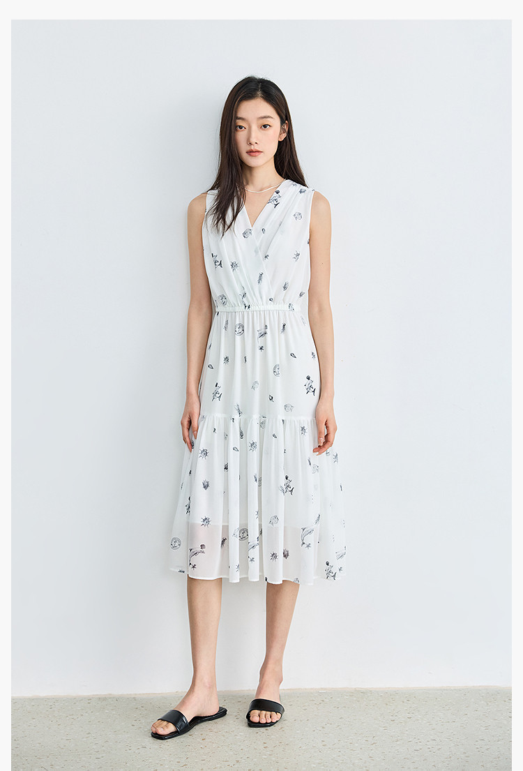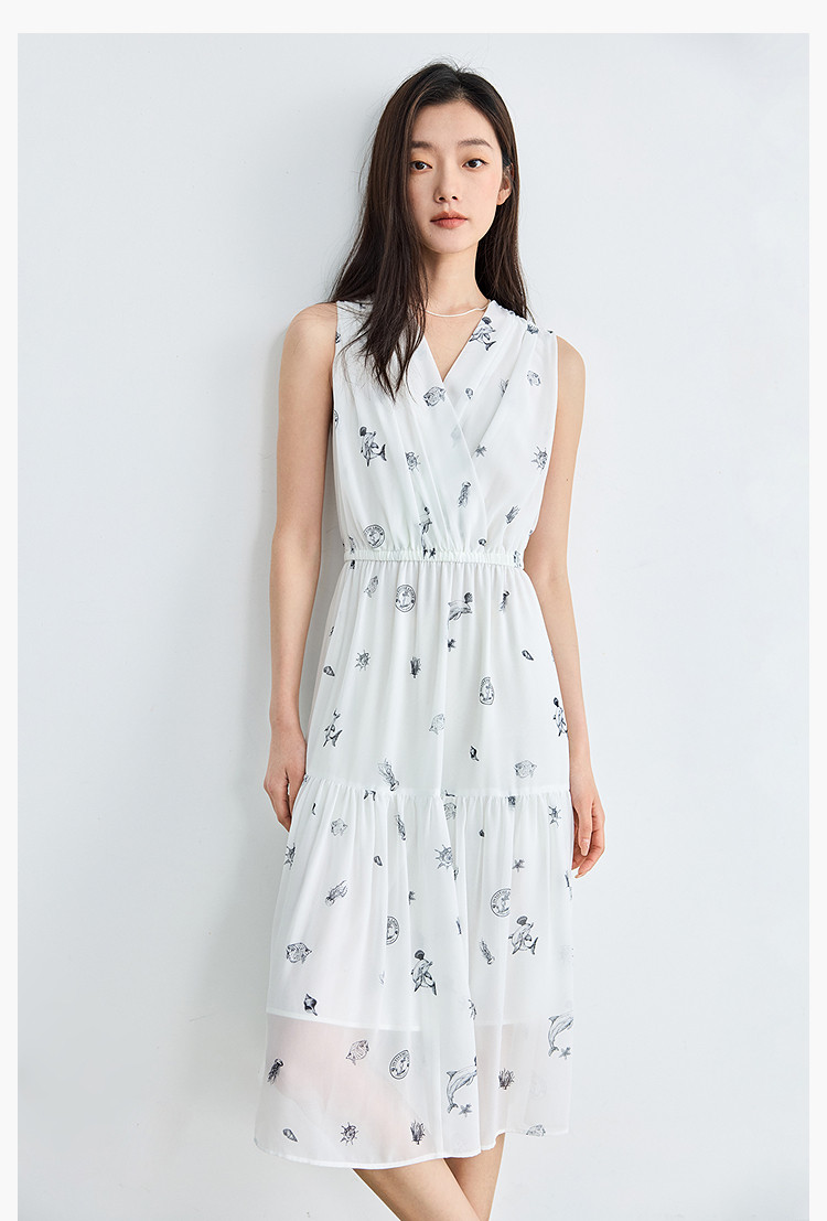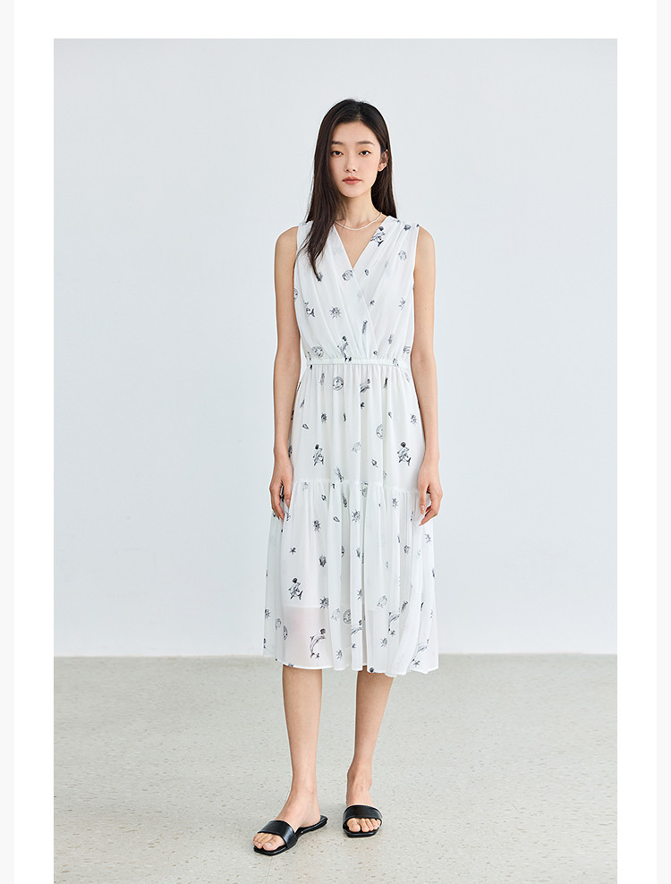 夏款小白裙女复古优雅V领无袖印花收腰拼接式茶歇裙连衣裙女 139035
