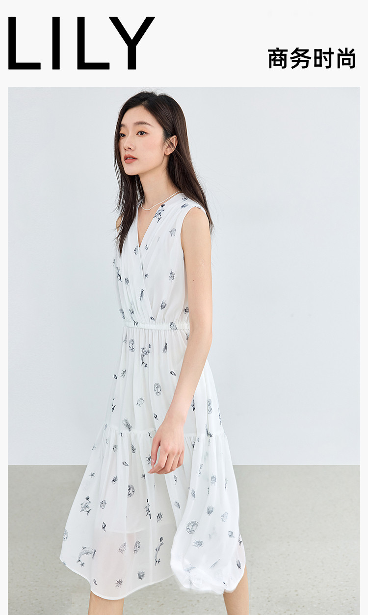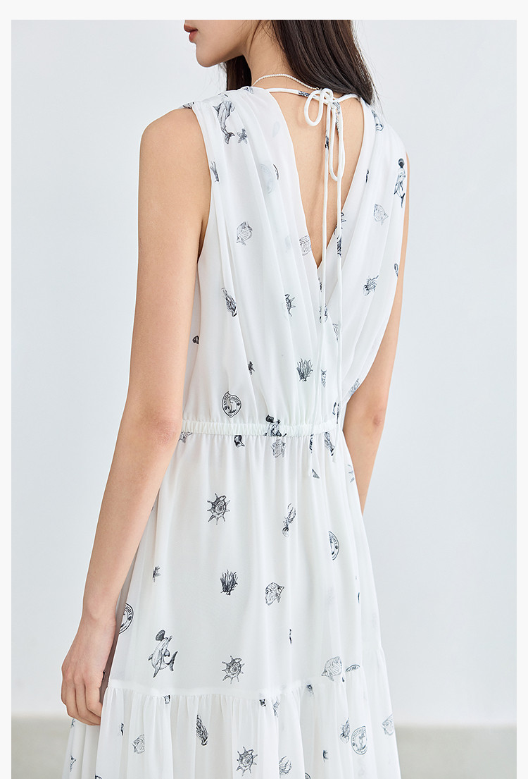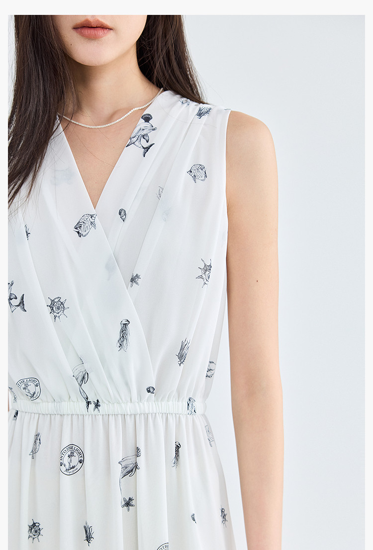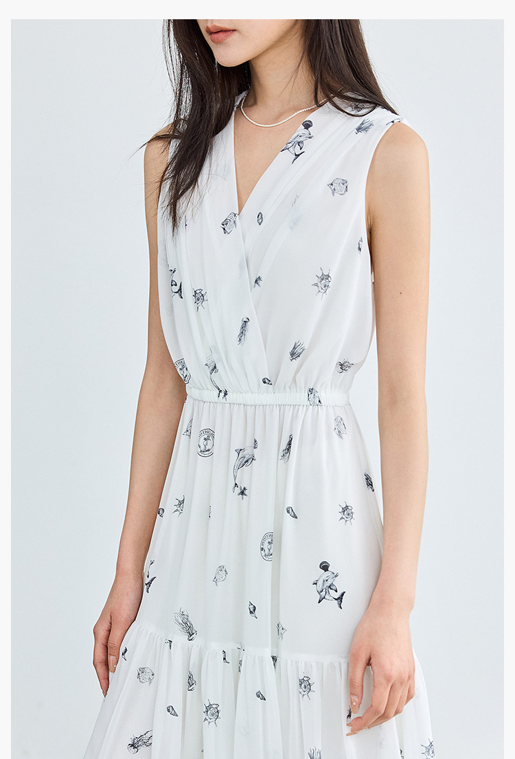 夏款小白裙女复古优雅V领无袖印花收腰拼接式茶歇裙连衣裙女 139035