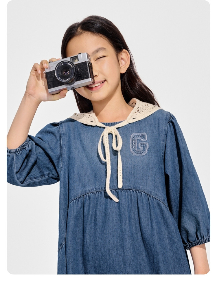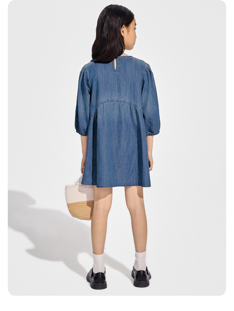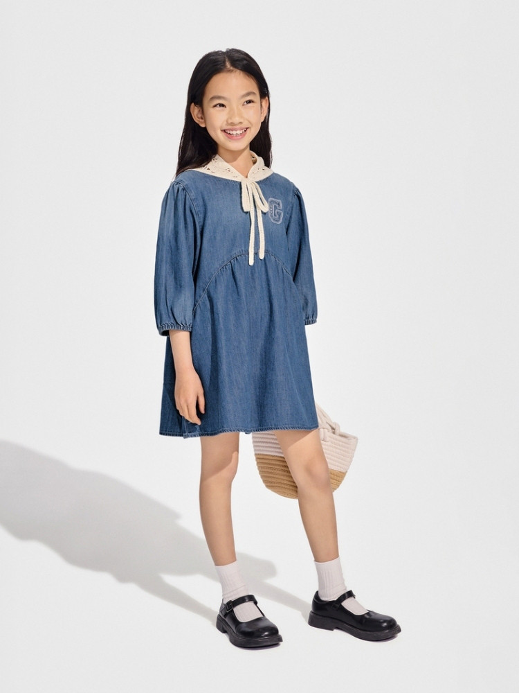 Gap女童2024春秋季贴布绣logo八分袖轻薄牛仔连衣裙A字裙890490 895130