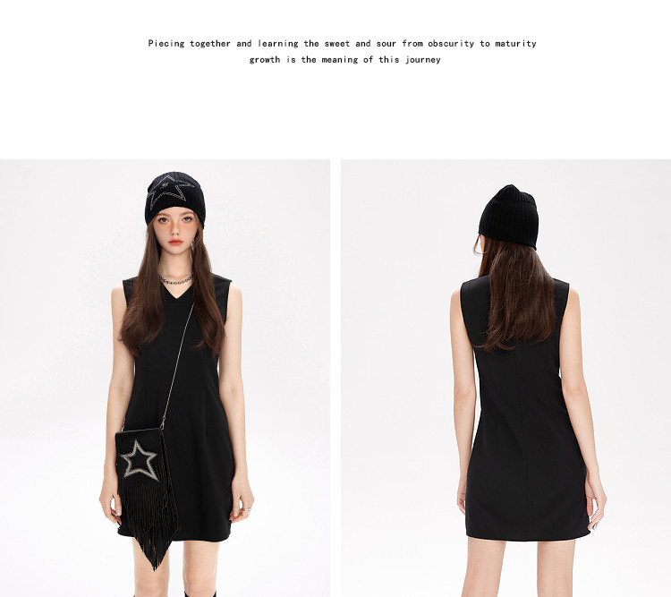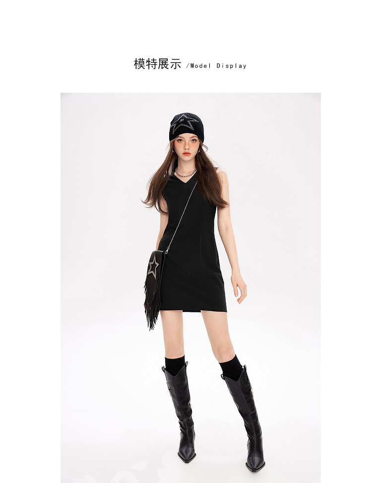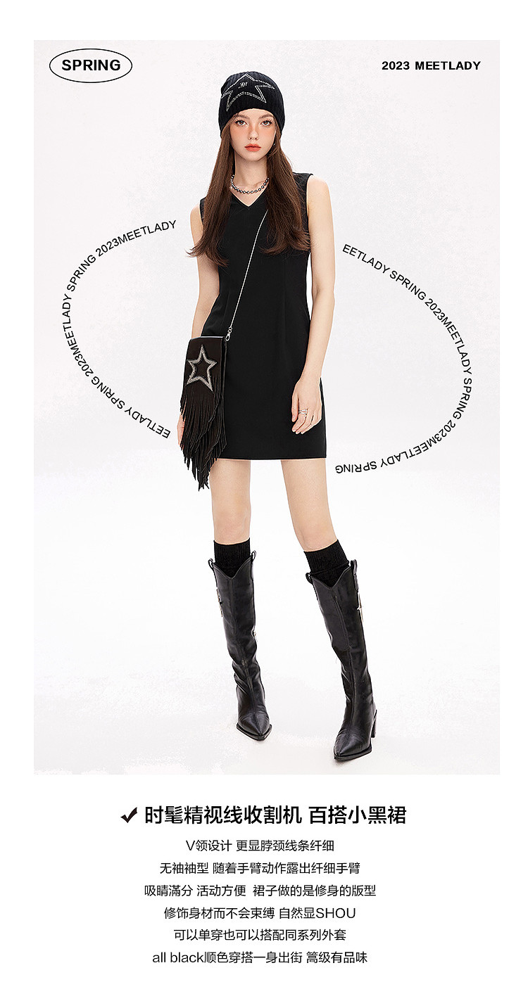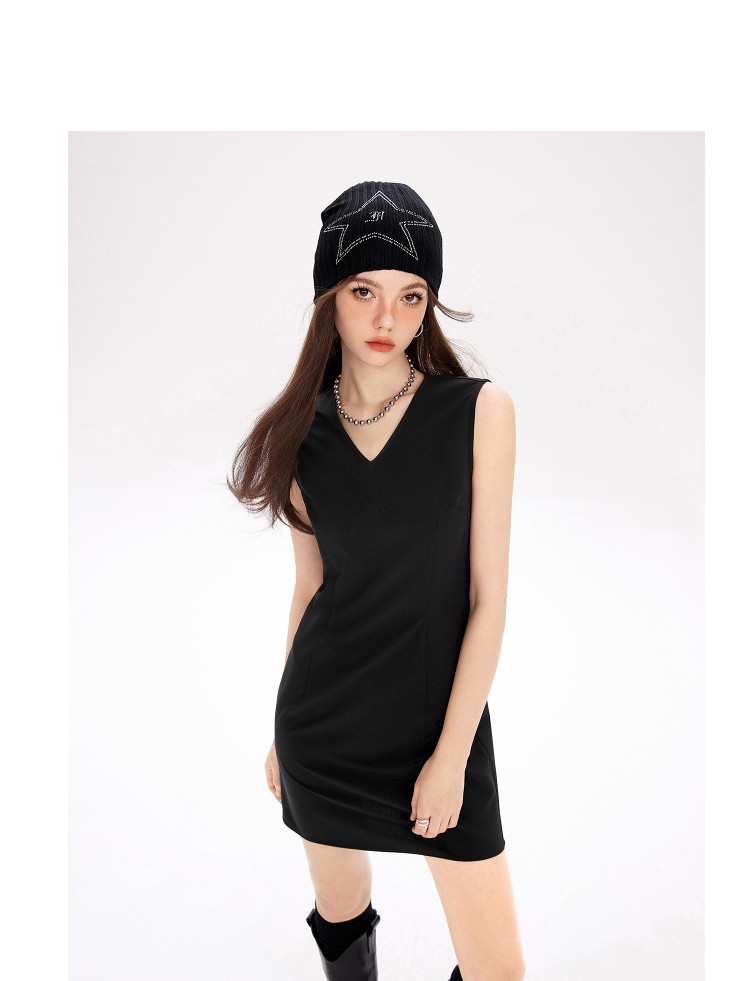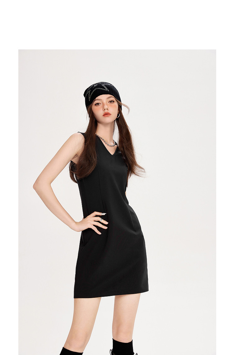 商品名称:24秋季高级v领无袖连衣裙女设计感小众收腰内搭裙 966036