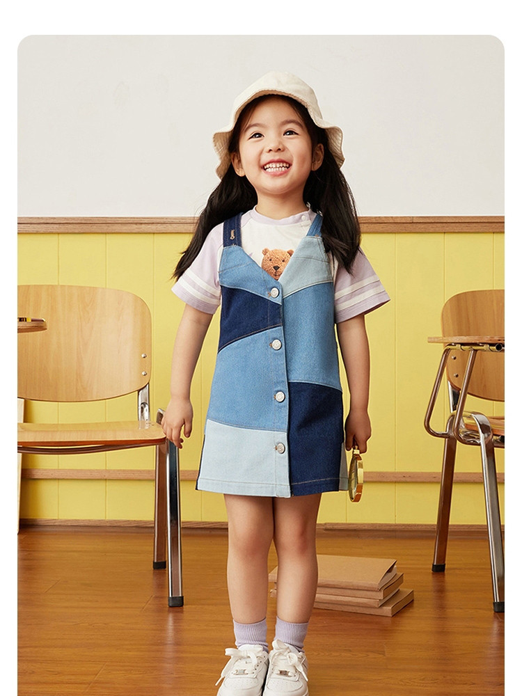 Gap女幼童2024春秋季撞色拼接牛仔背带裙儿童装连衣裙890346 499738