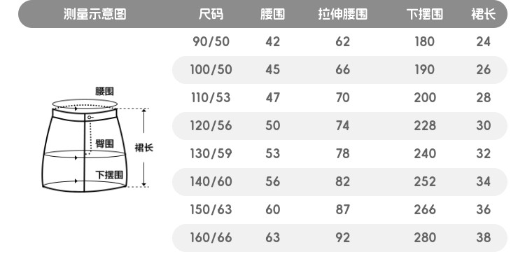 | 尺码 | 裙长(cm) | 身高(cm) | 腰围(cm) | 适合年龄 | 号型 |