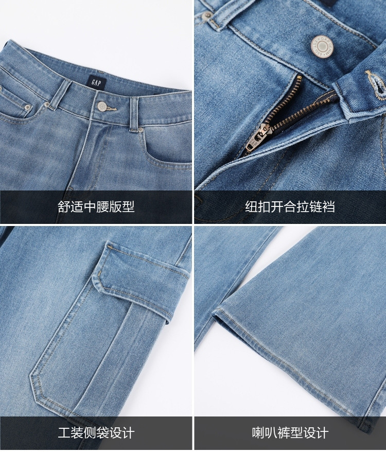 Gap女装春夏美式复古中腰喇叭裤工装水洗牛仔裤873057 612570