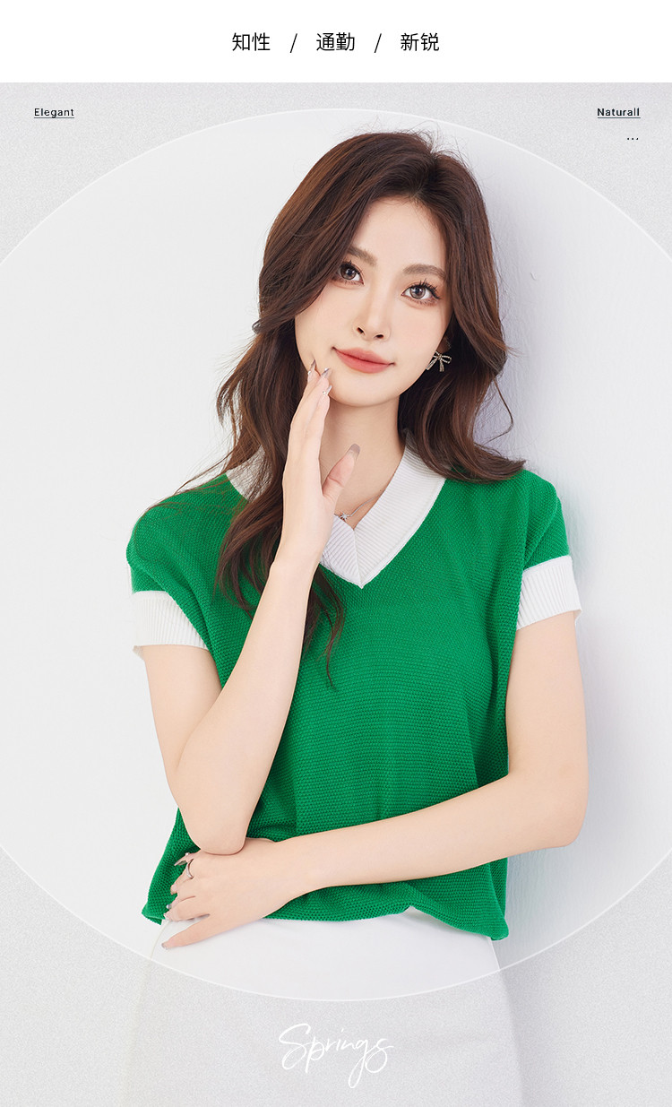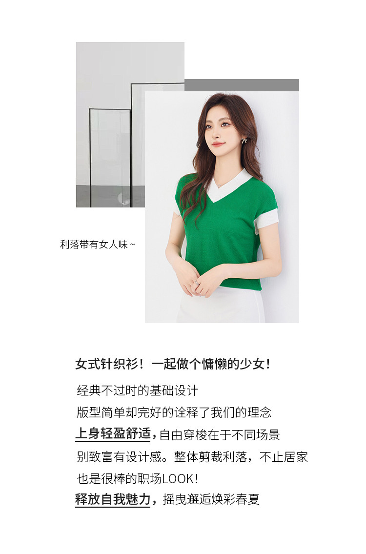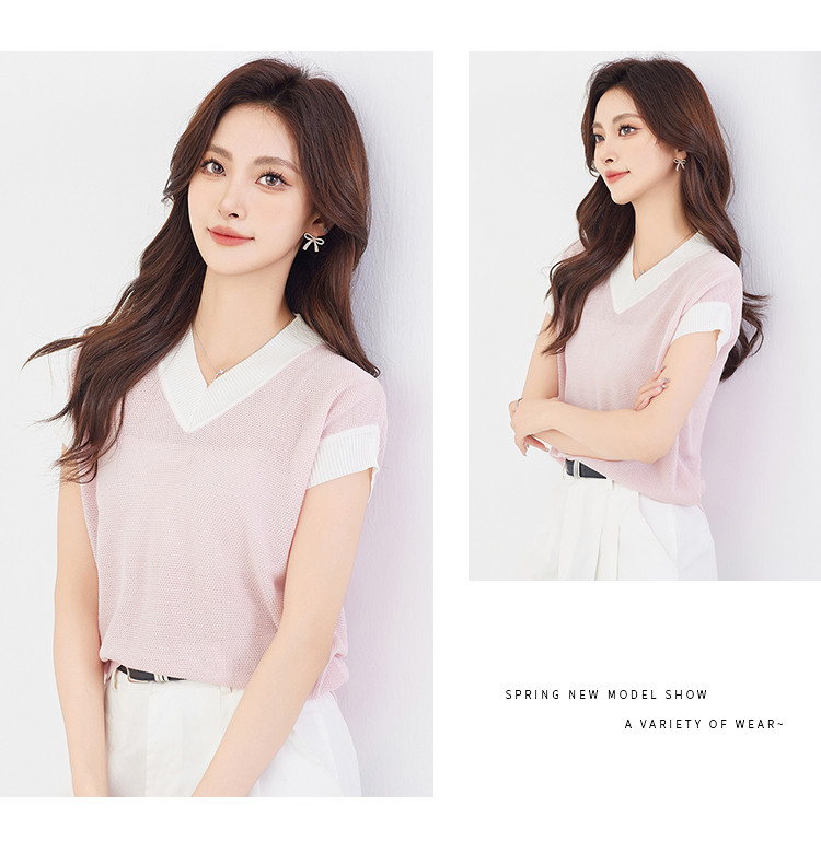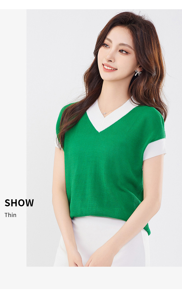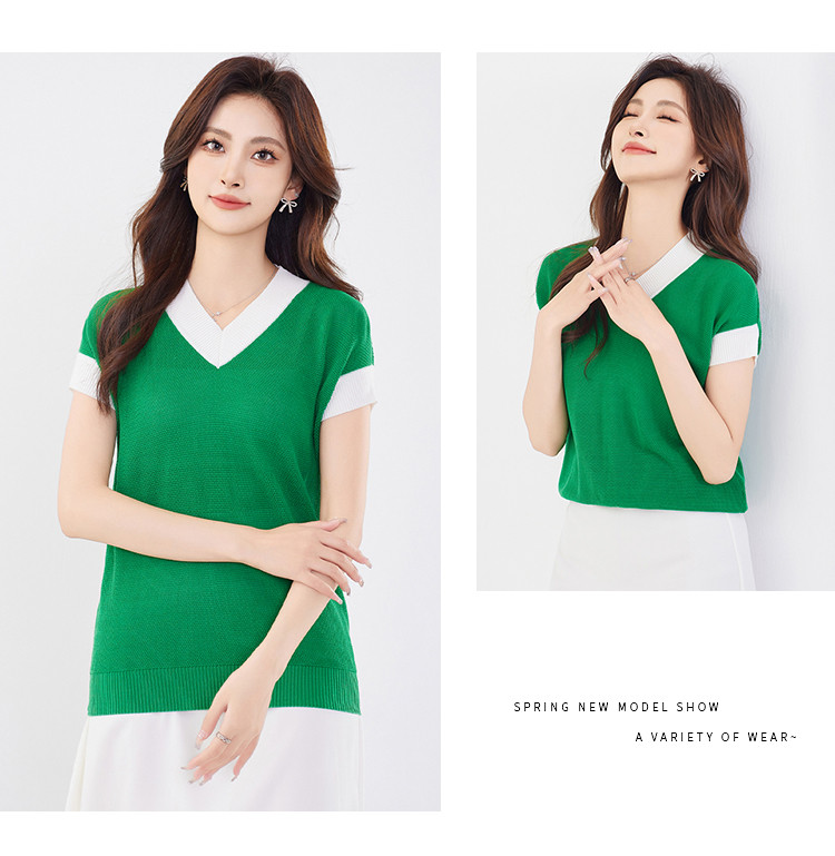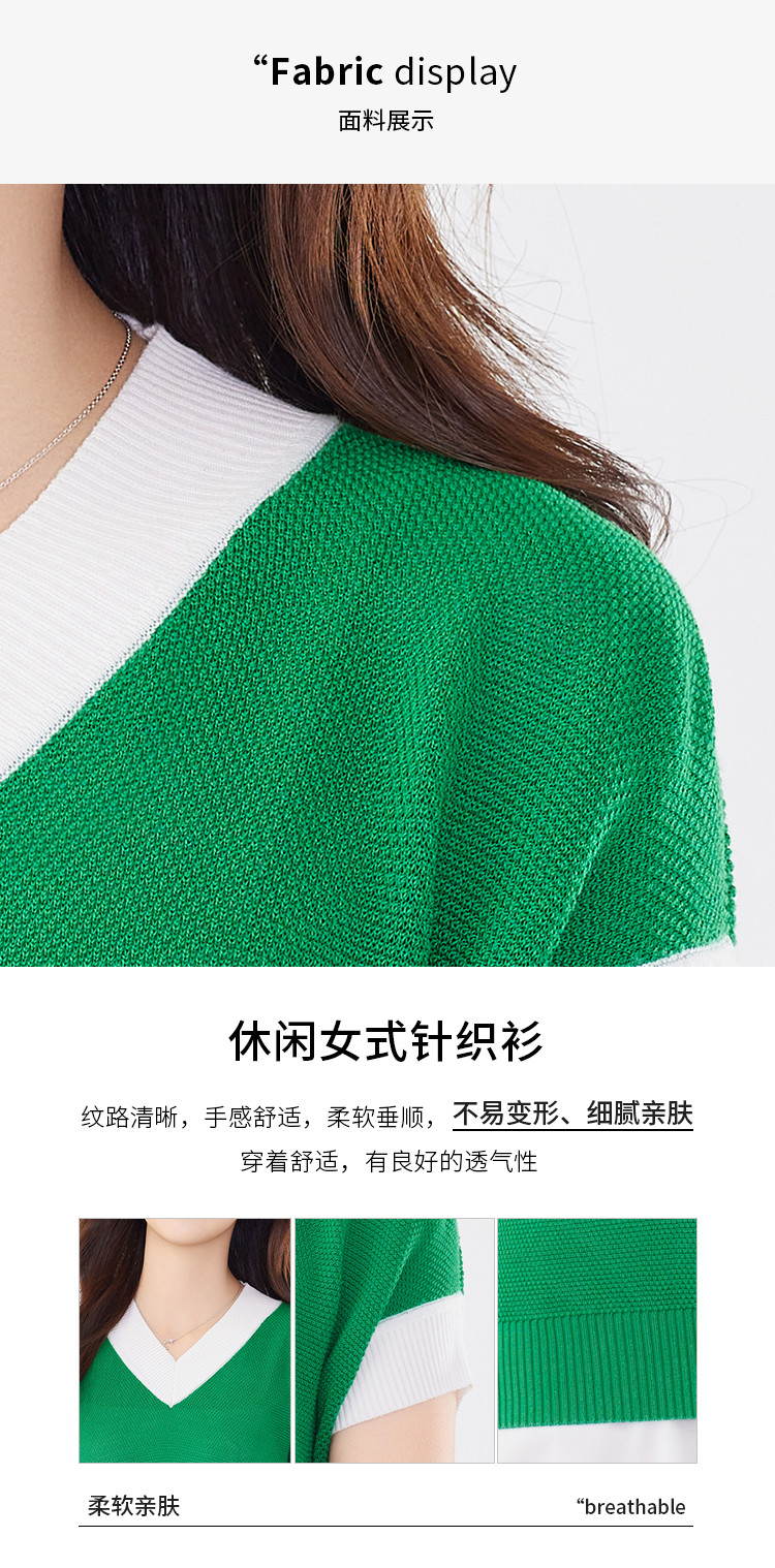 商品名称:【100%莱赛尔】气质V领撞色针织衫女简约高级感休闲百搭短袖 902239