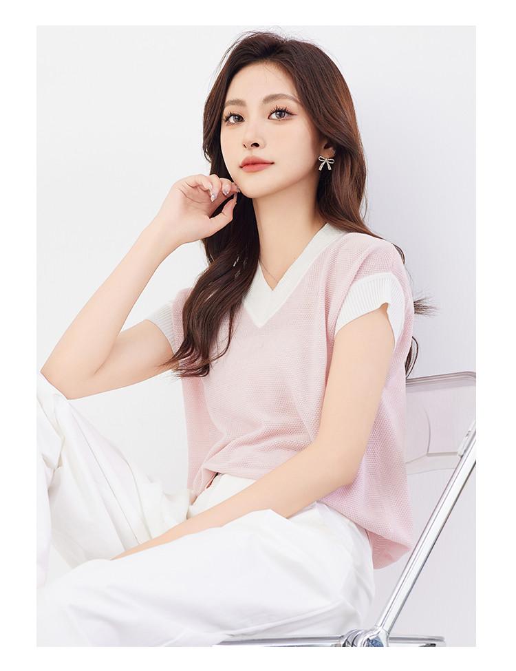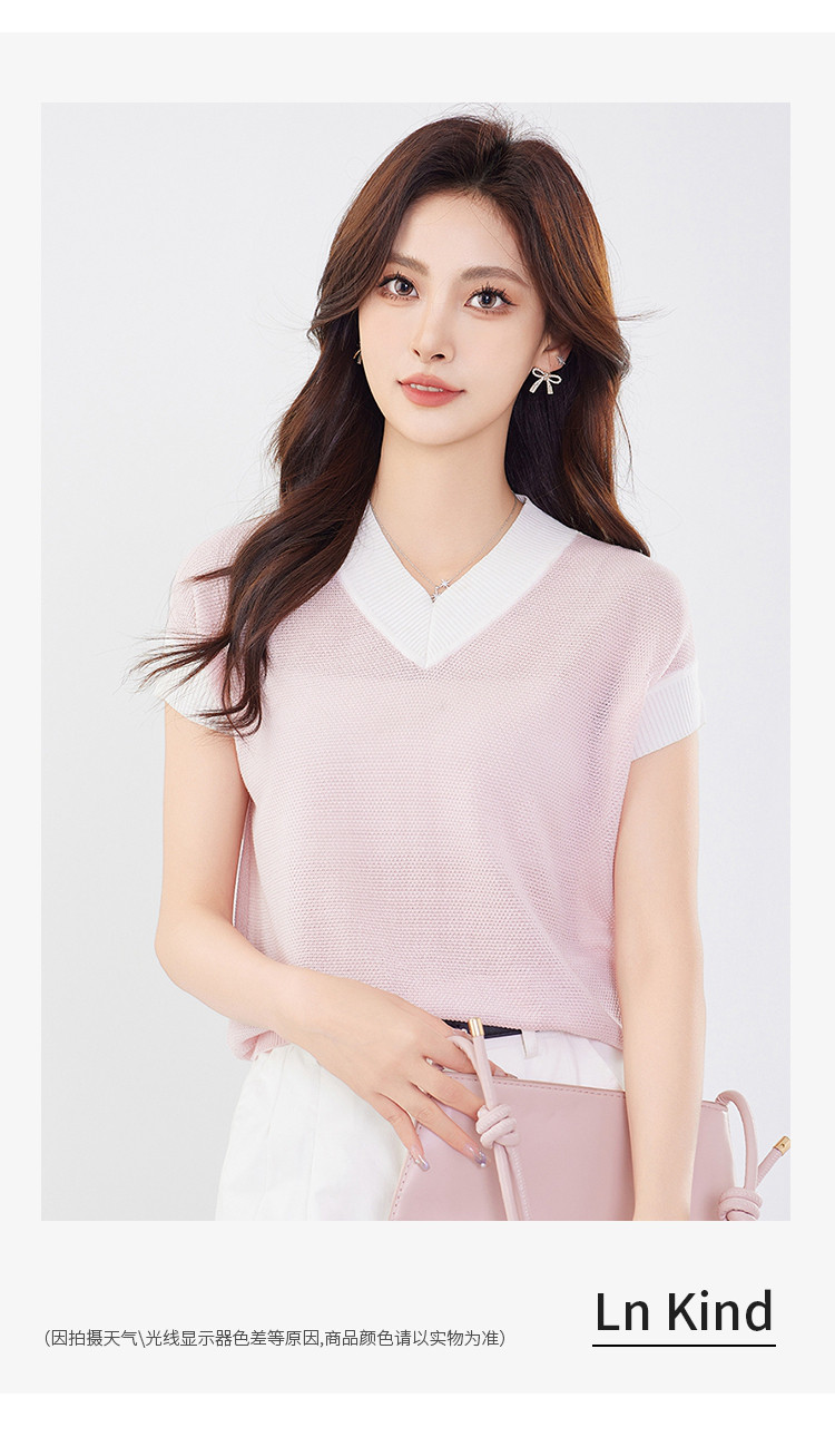 【100%莱赛尔】气质V领撞色针织衫女简约高级感休闲百搭短袖 902239