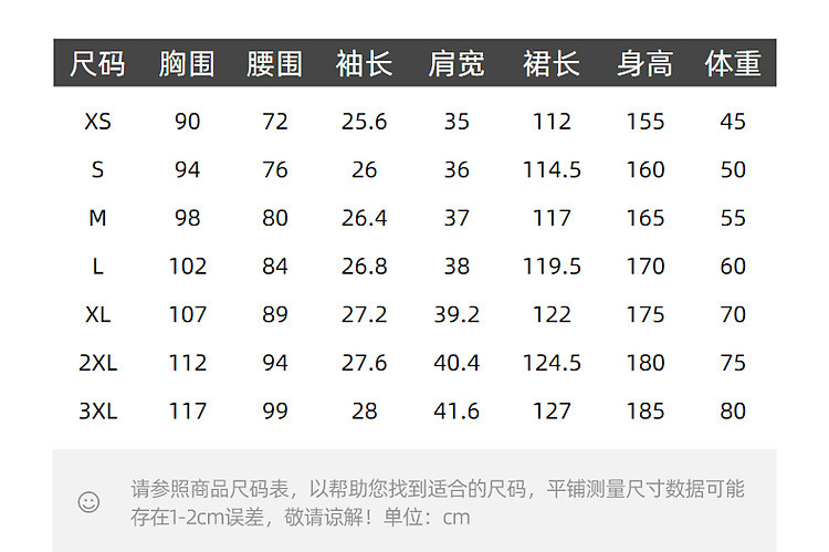 | 尺码 | 裙长(cm) | 肩宽(cm) | 腰围(cm) | 袖长(cm) | 胸围(cm) | 号型 |