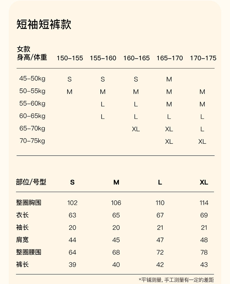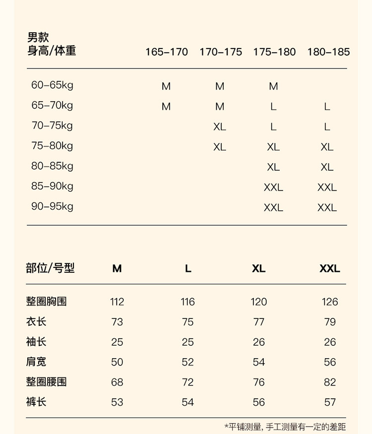| 尺码 | 衣长(cm) | 肩宽(cm) | 腰围(cm) | 裤长(cm) | 袖长(cm) | 胸围(cm) | 号型 |