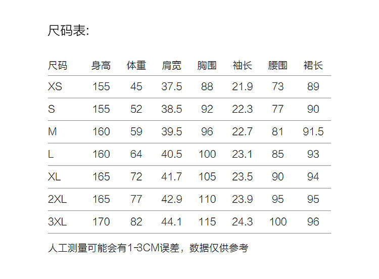 | 尺码 | 裙长(cm) | 肩宽(cm) | 腰围(cm) | 袖长(cm) | 胸围(cm) | 号型 |