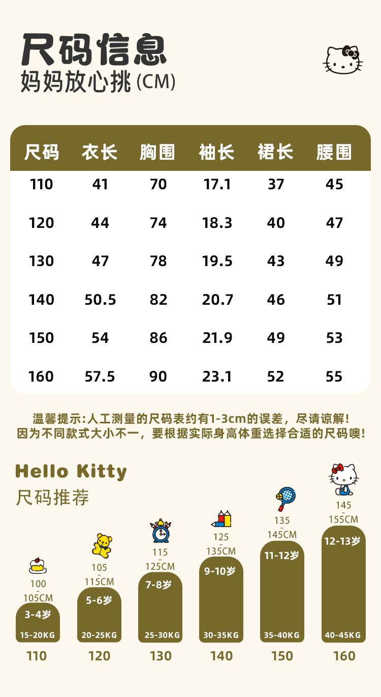 | 尺码 | 衣长(cm) | 裙长(cm) | 身高(cm) | 腰围(cm) | 袖长(cm) | 适合年龄 | 胸围(cm) | 号型 |
