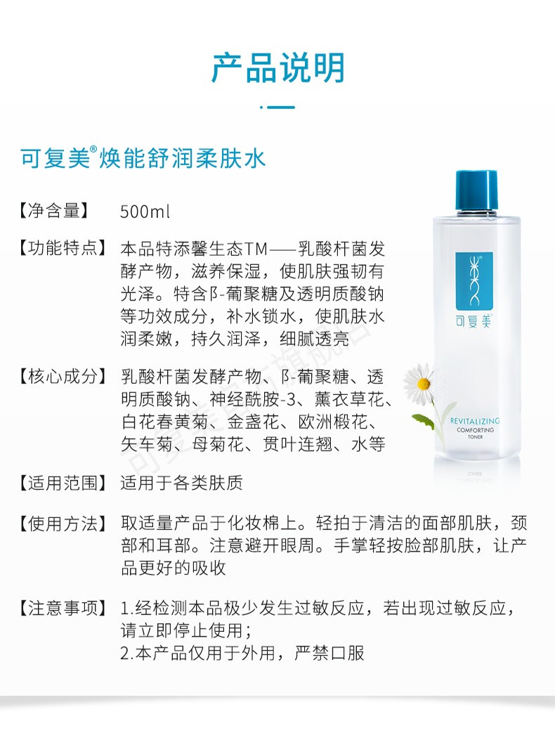 商品名称:可复美 焕能舒润柔肤水爽肤水 500ml 安心湿敷 补水敏感肌