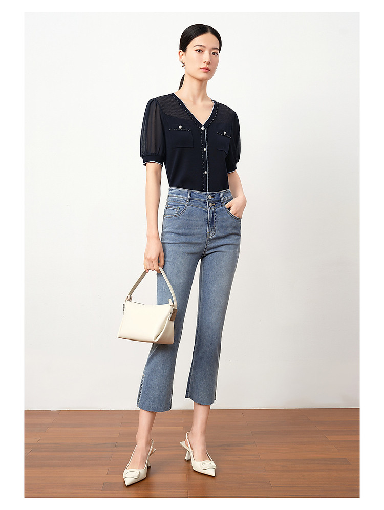 商场同款JZ玖姿轻熟V领雪纺拼接套头针织衫夏季JWDX31218 499468