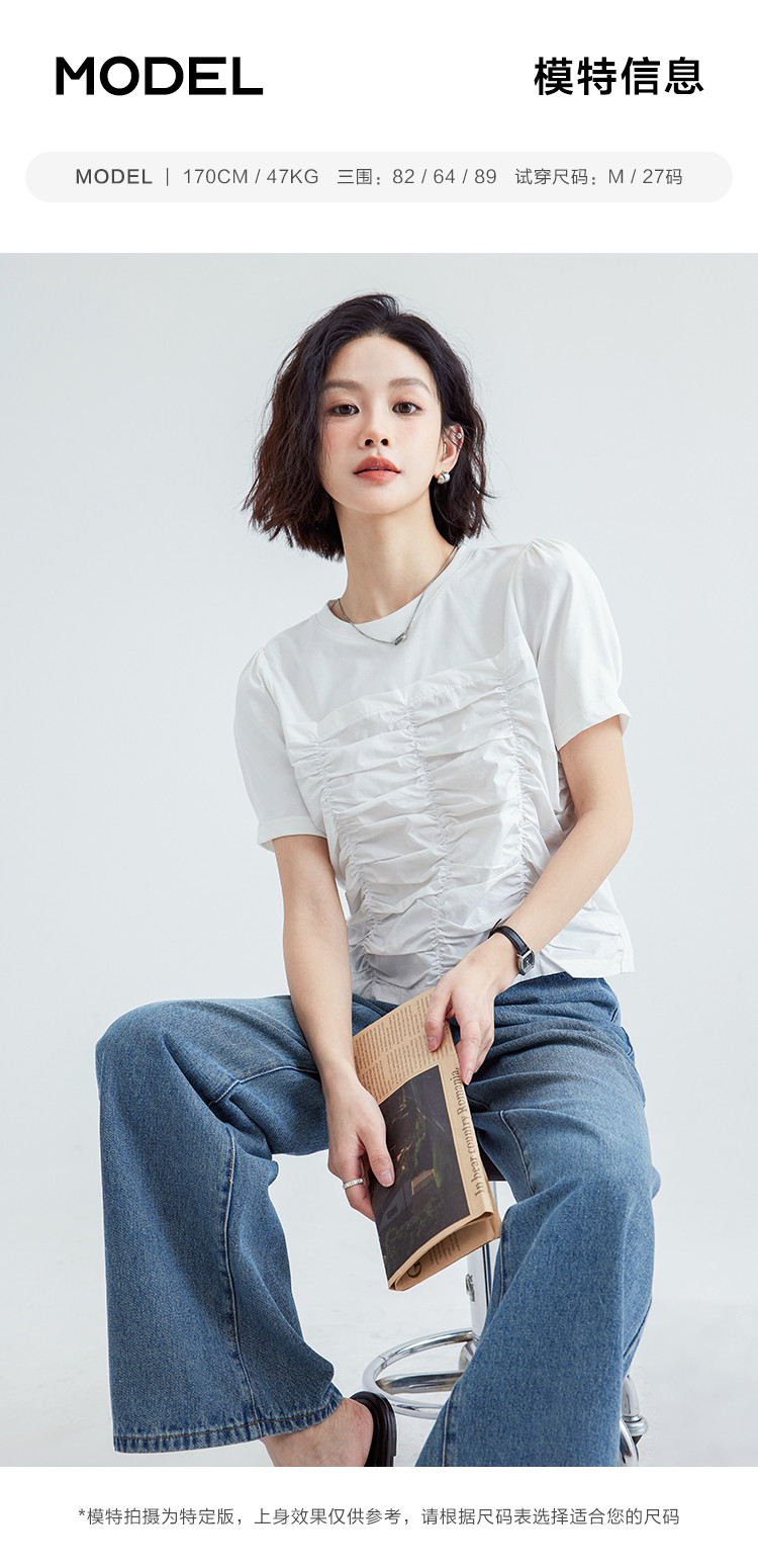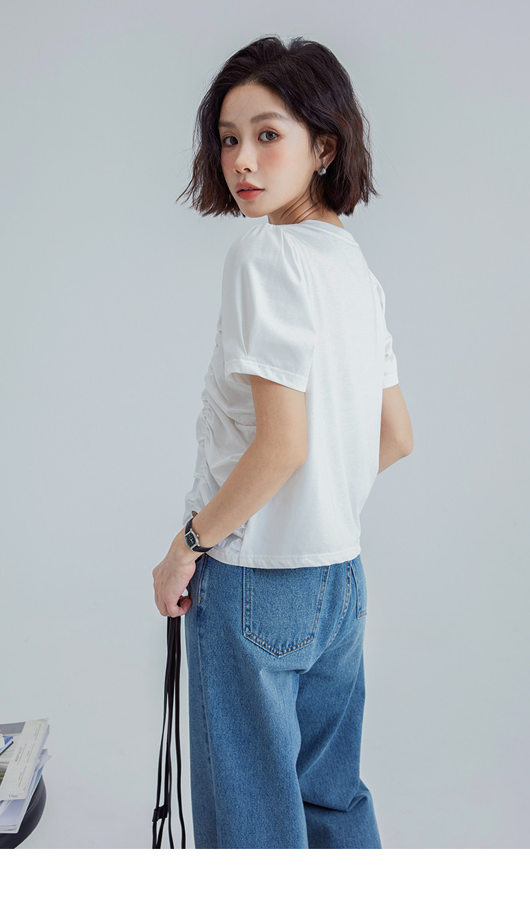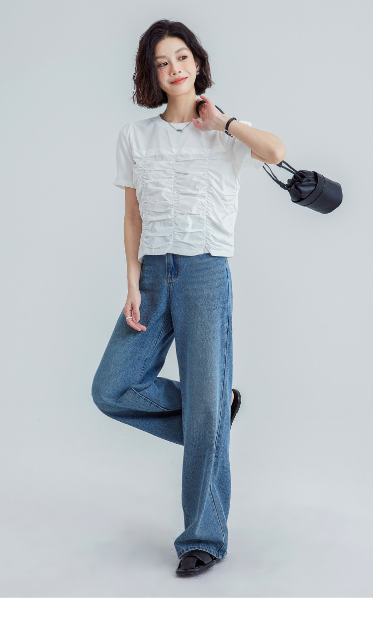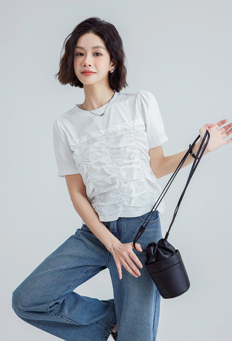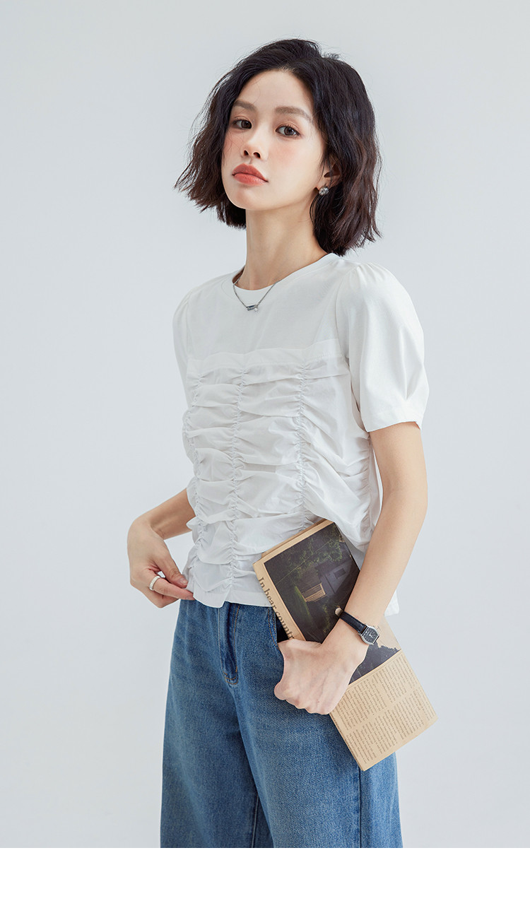 【清爽感白T】夏款时髦不撞款造型感捏褶轻薄透气短袖女 669762