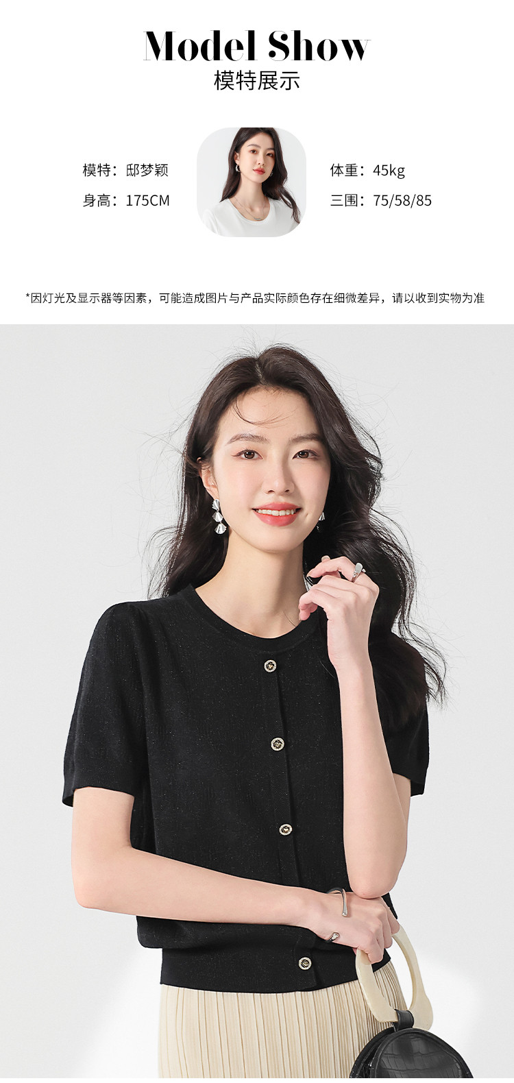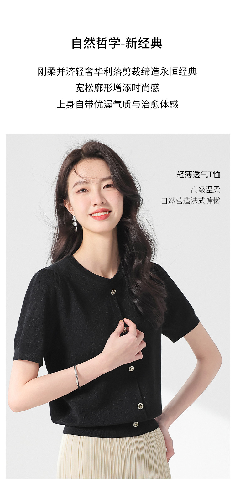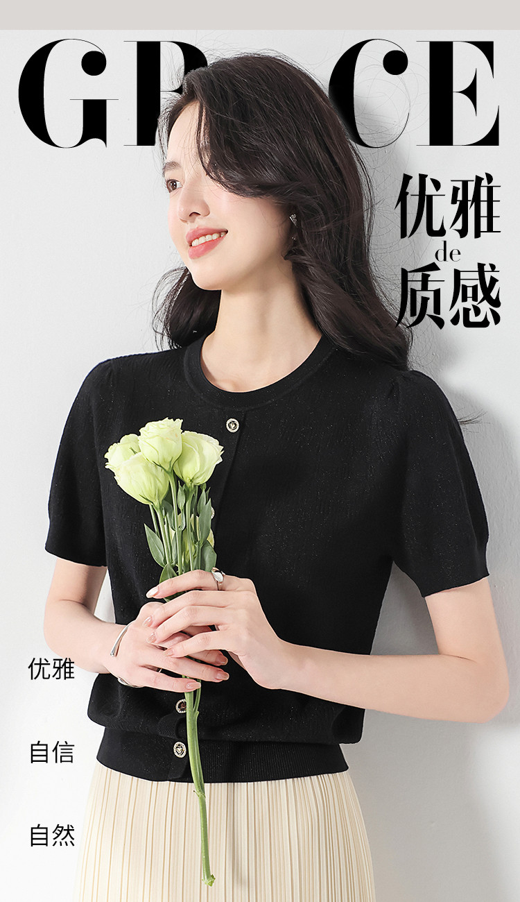 商品名称:夏款轻薄纯色提花含桑蚕丝针织衫女开衫打底假开衫短袖T恤 207635
