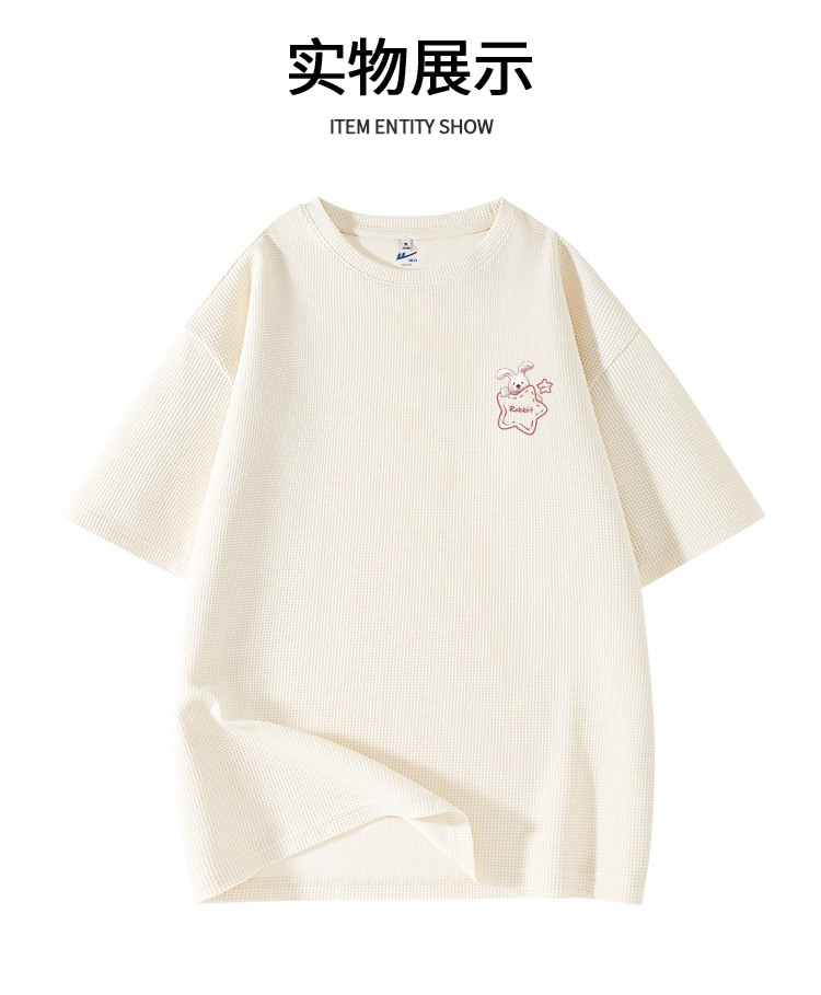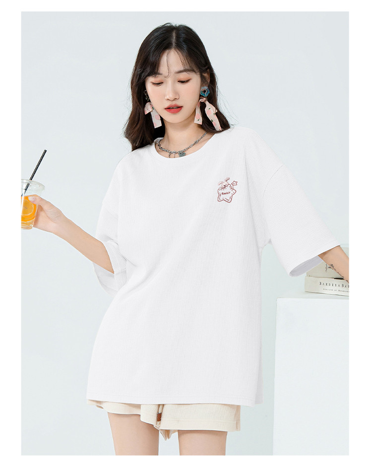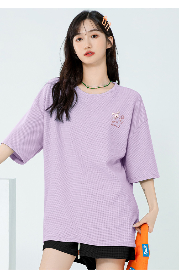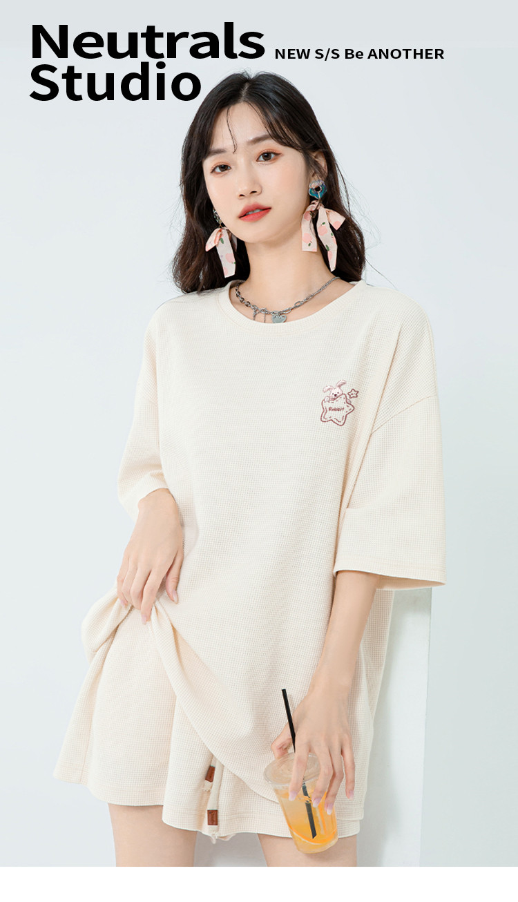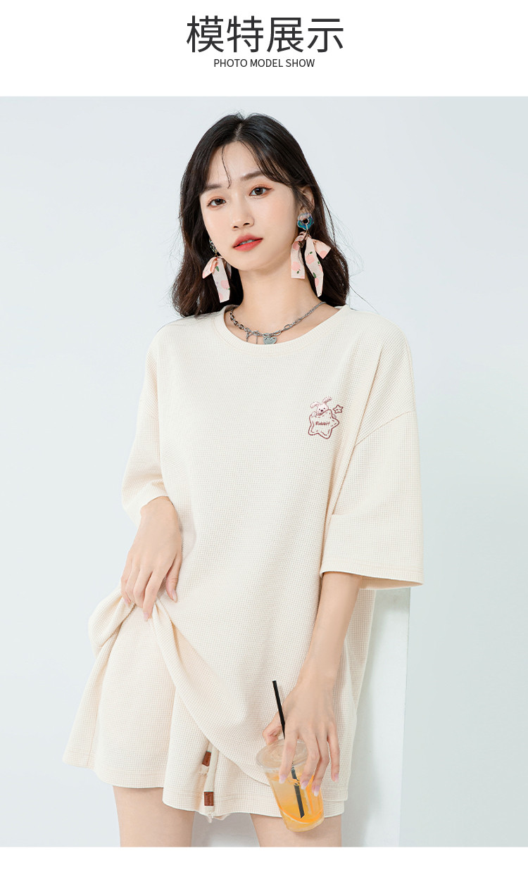 商品名称:【女装】华夫格运动套装女夏季宽松重磅中长T三分短裤两件套 669907