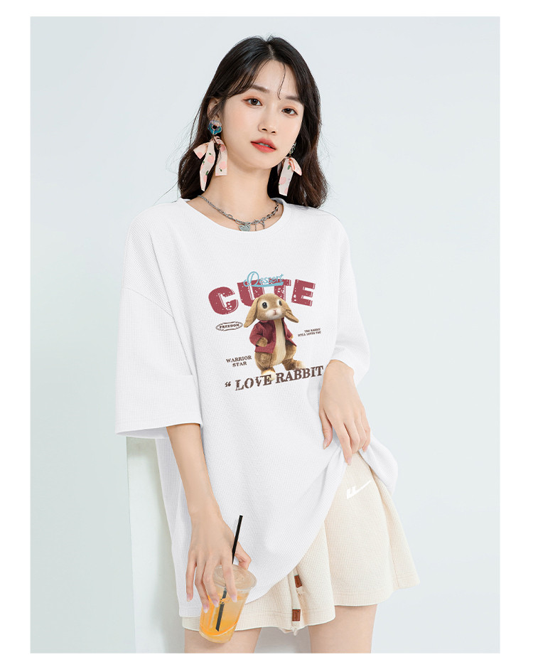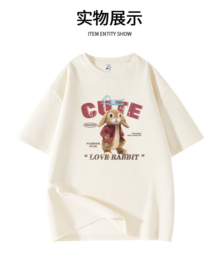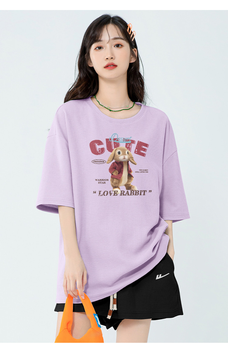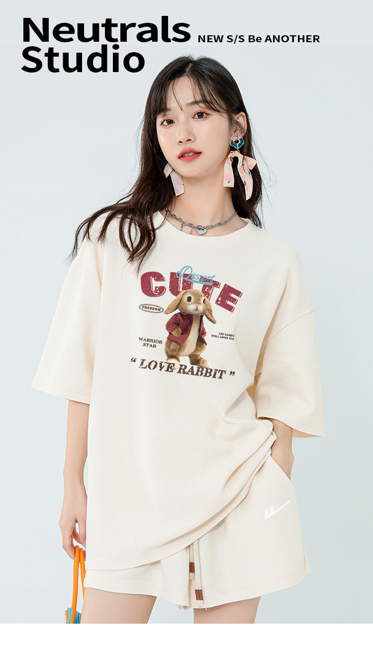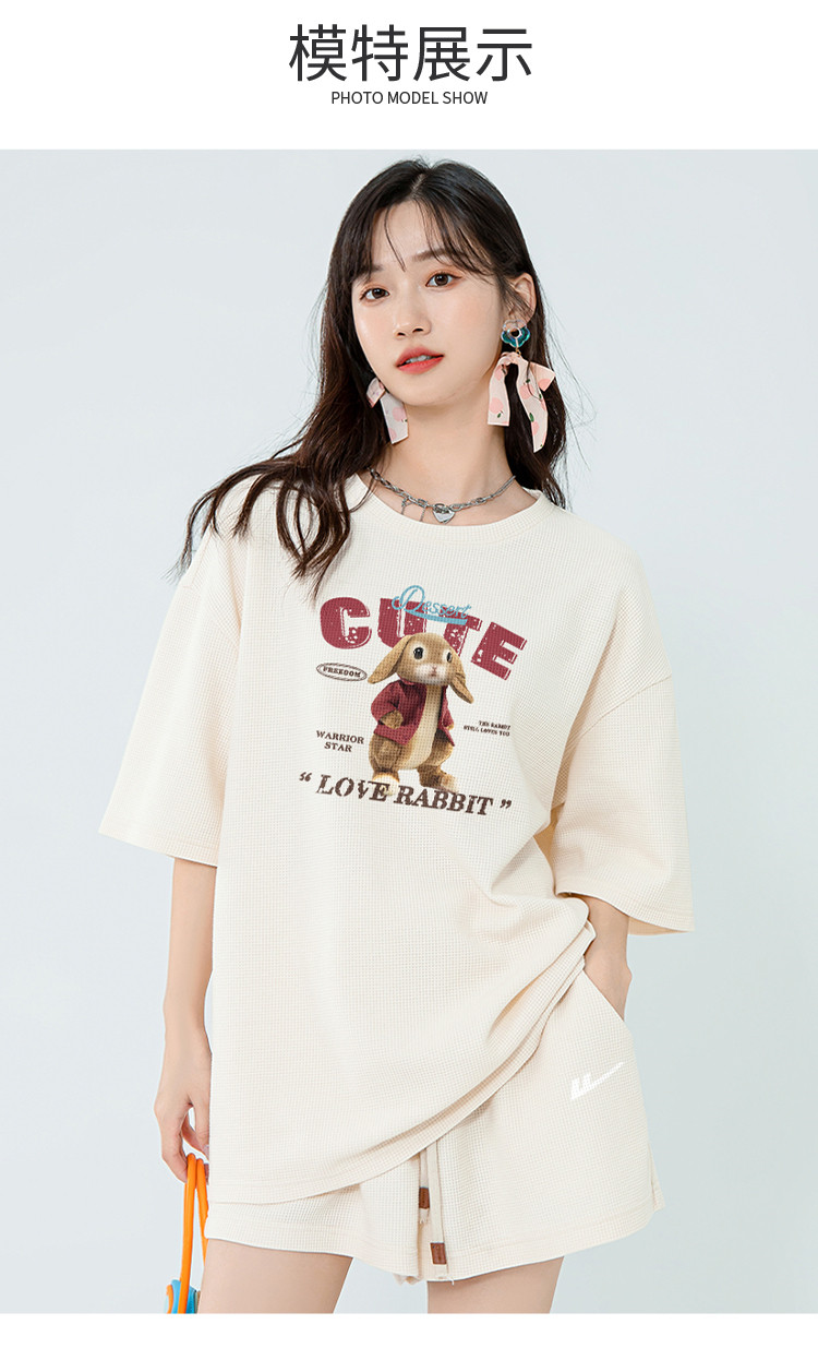 商品名称:【女装】华夫格运动套装女夏季新款宽松重磅中长T三分短裤两件套 653523