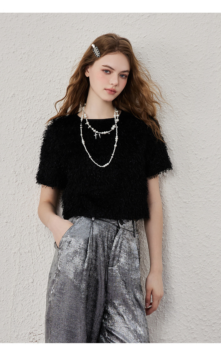 个性简约毛毛面料品质感女式T恤夏季休闲气质短袖上衣 417821