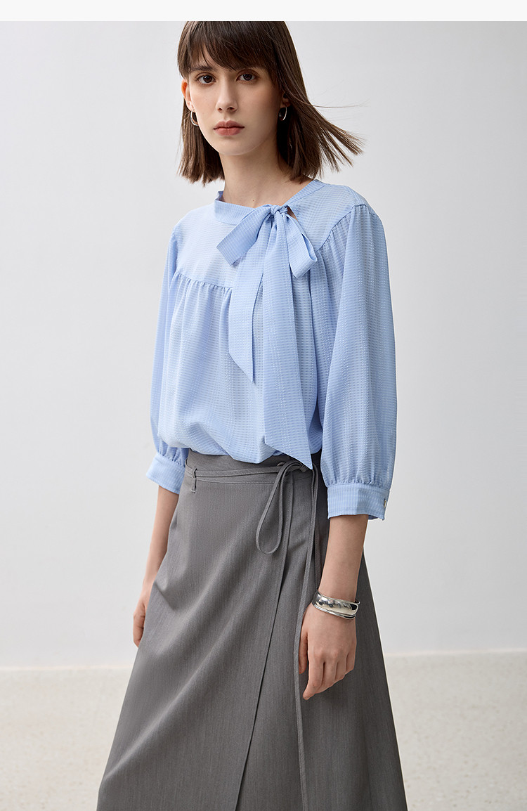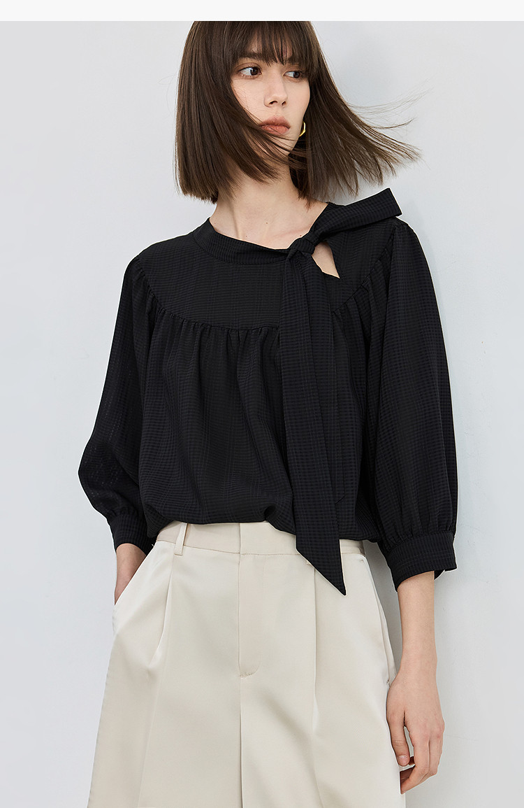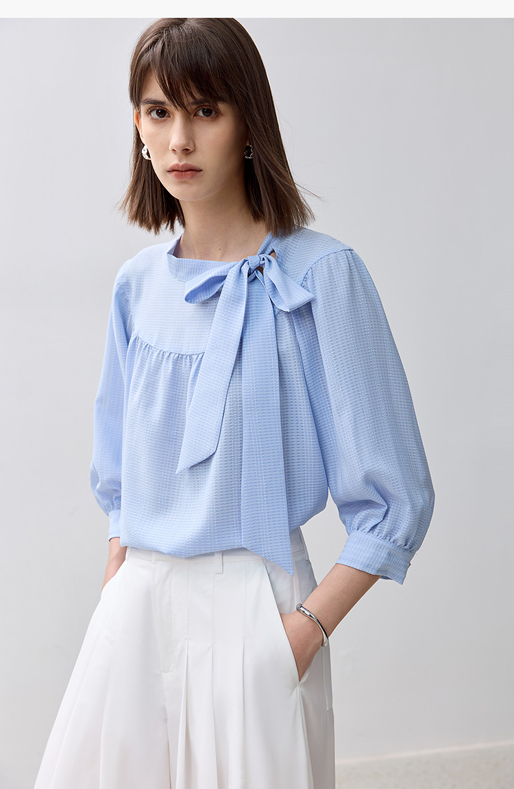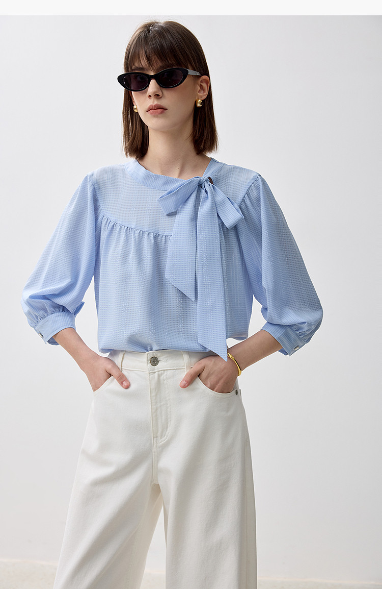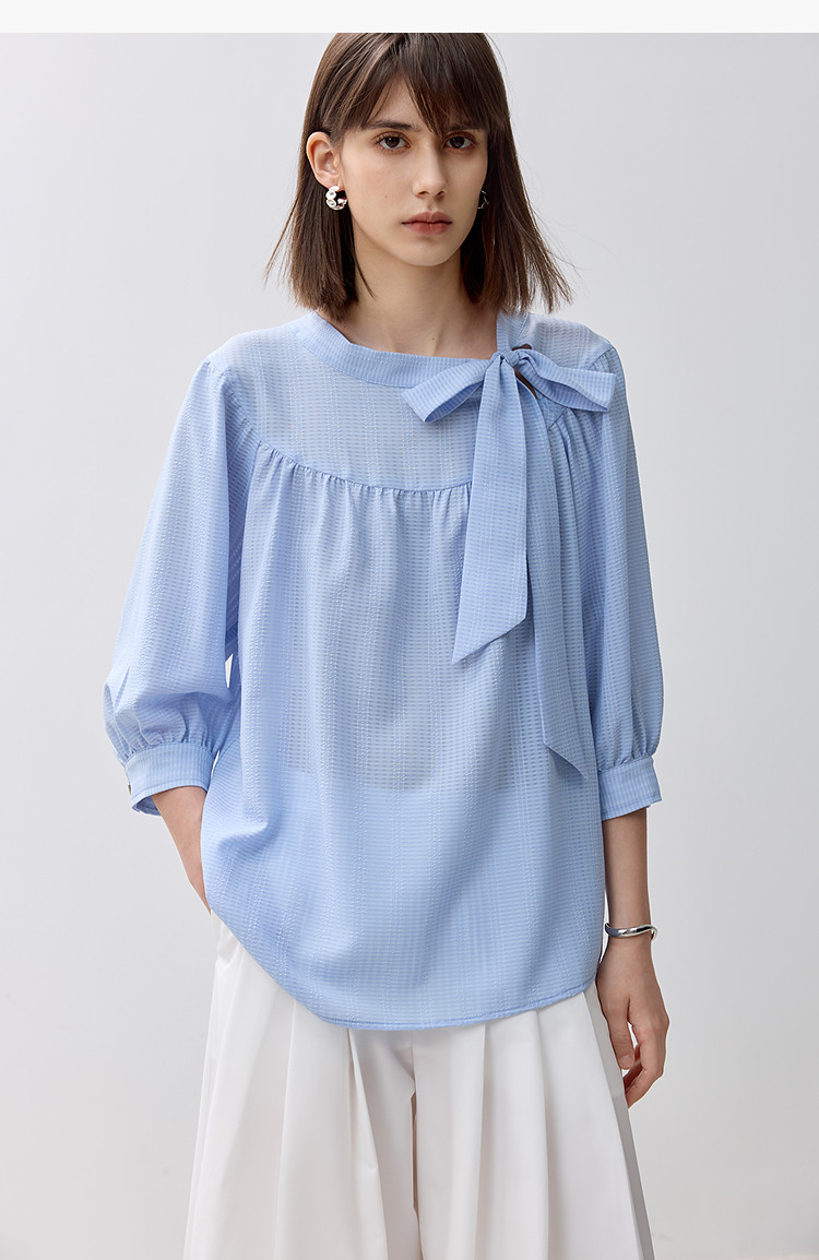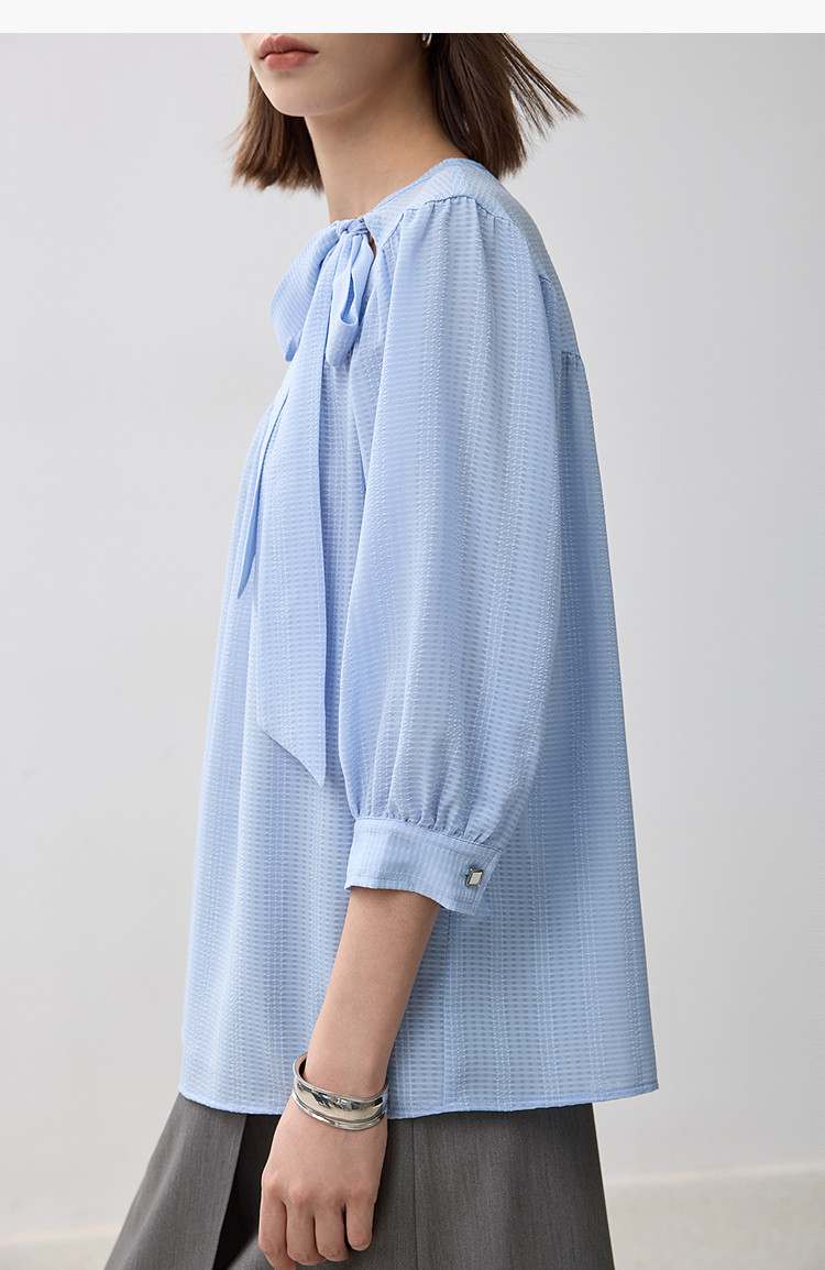 商品名称:春季衬衫抽褶法式飘带领海边度假风上衣泡泡袖宽松雪纺衫 577307
