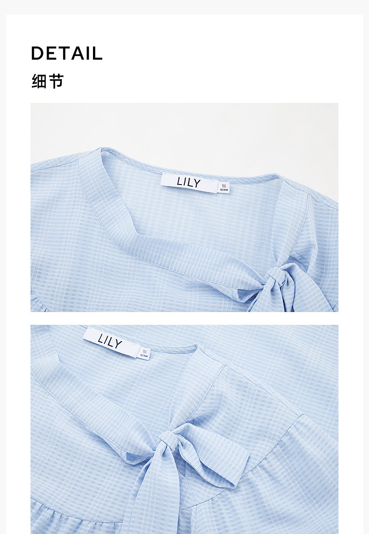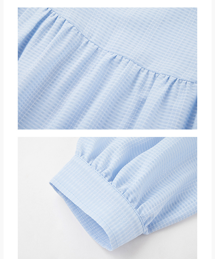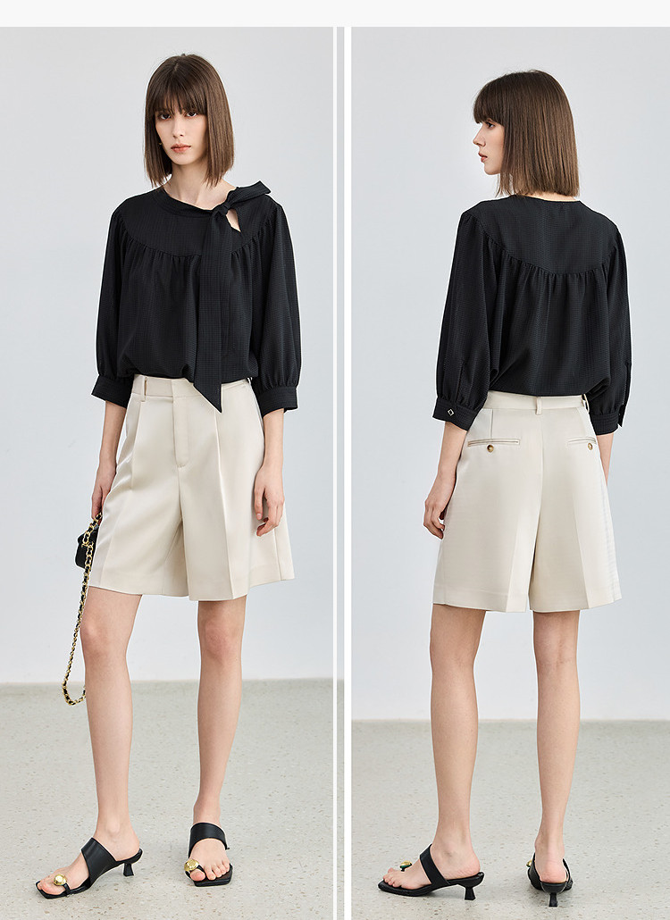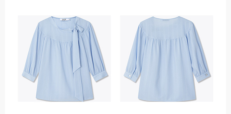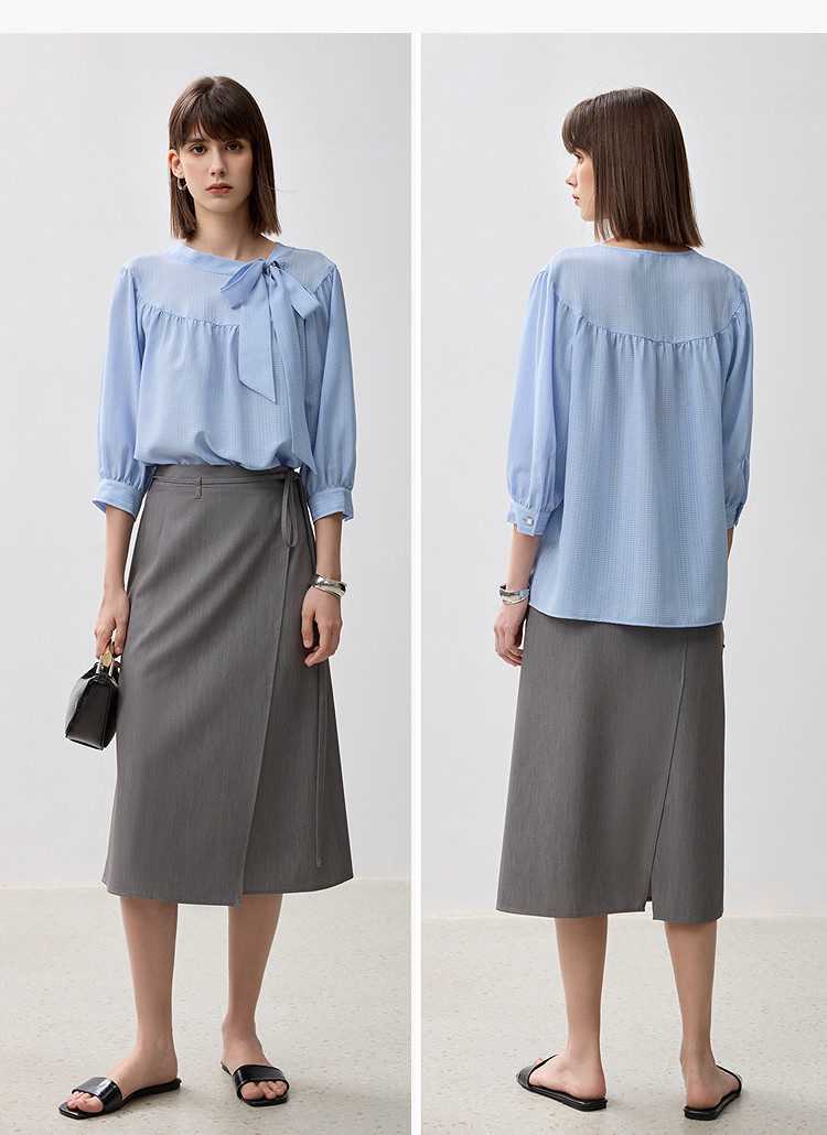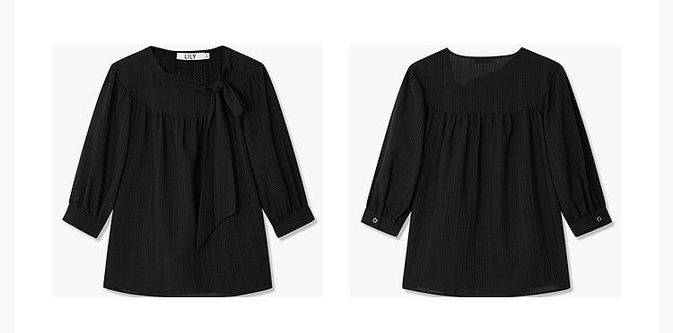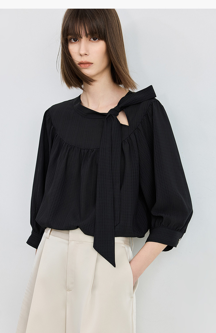 商品名称:春季衬衫抽褶法式飘带领海边度假风上衣泡泡袖宽松雪纺衫 577307