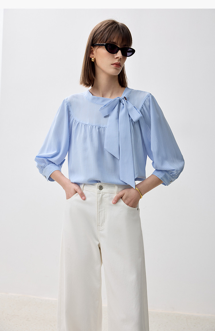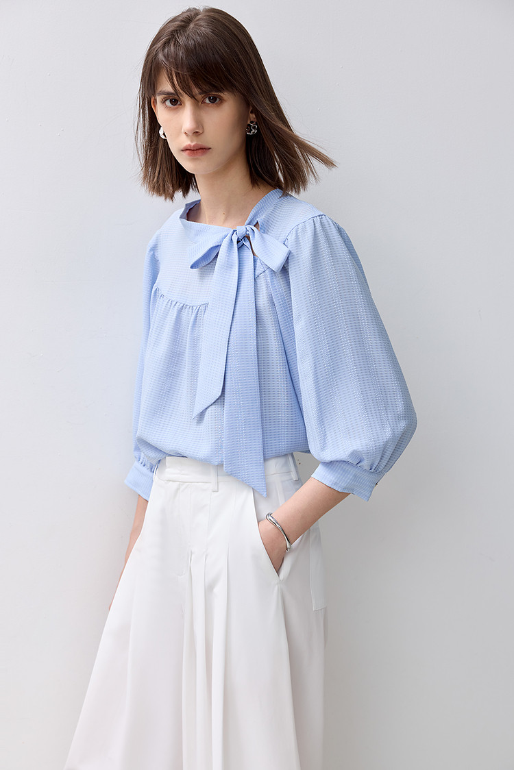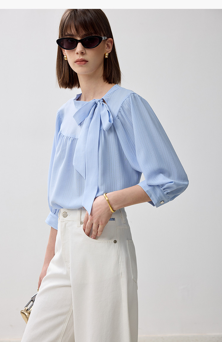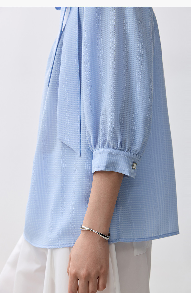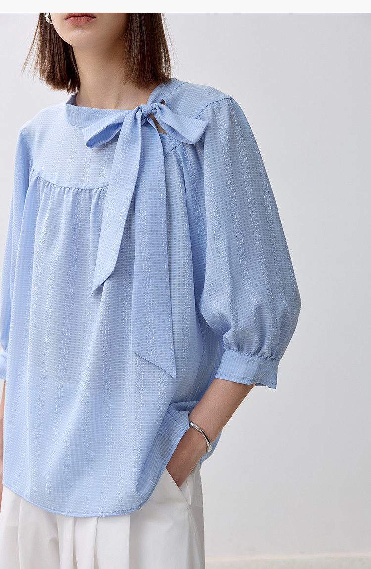 春季衬衫抽褶法式飘带领海边度假风上衣泡泡袖宽松雪纺衫 577307