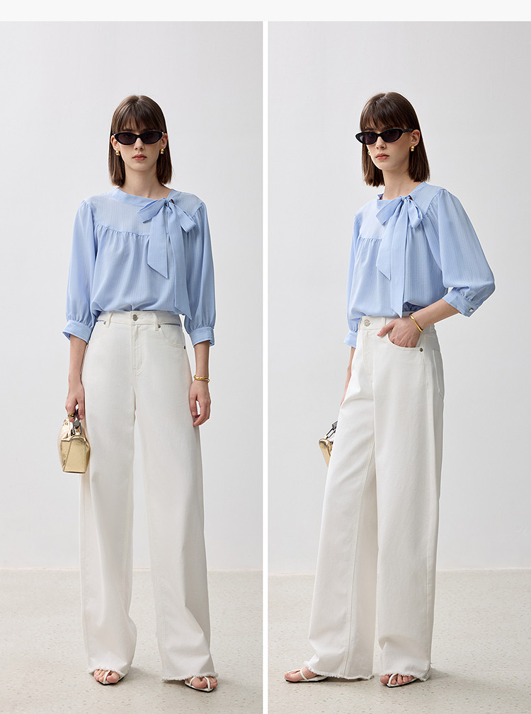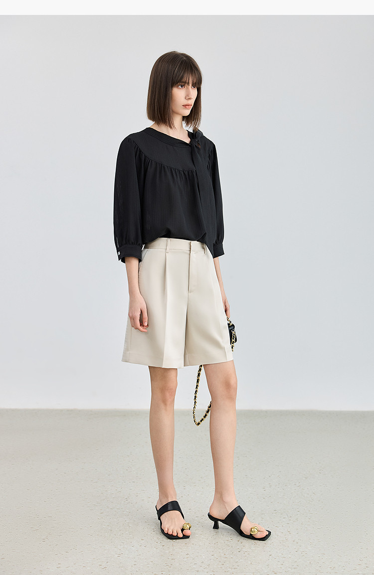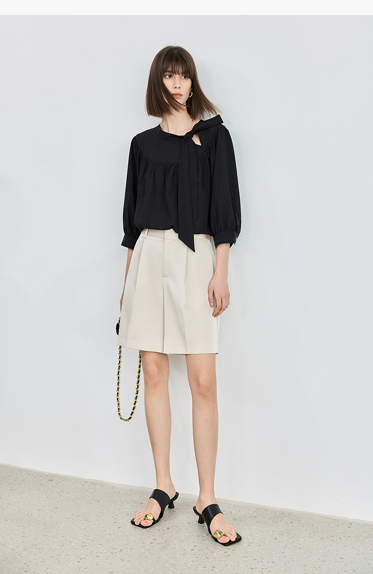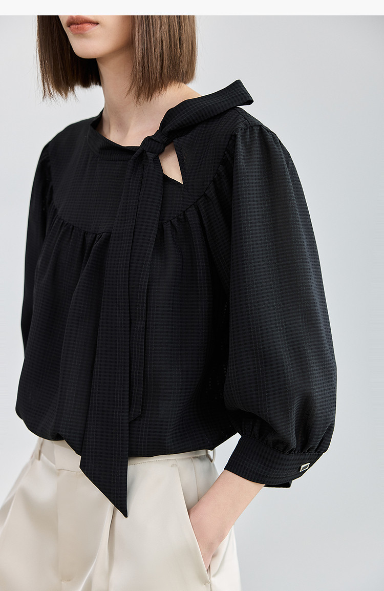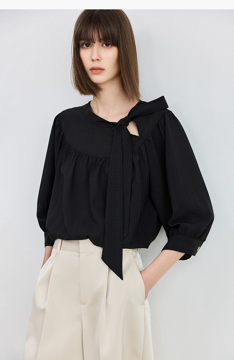春季衬衫抽褶法式飘带领海边度假风上衣泡泡袖宽松雪纺衫 577307