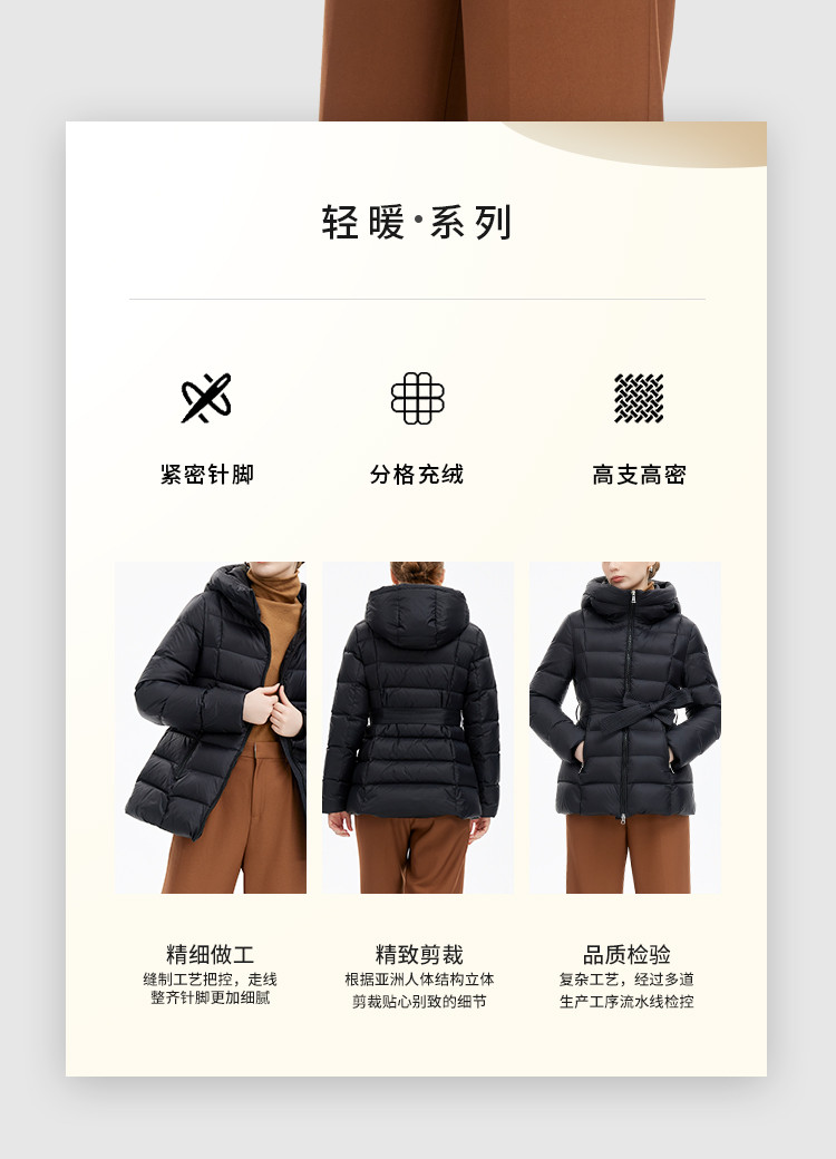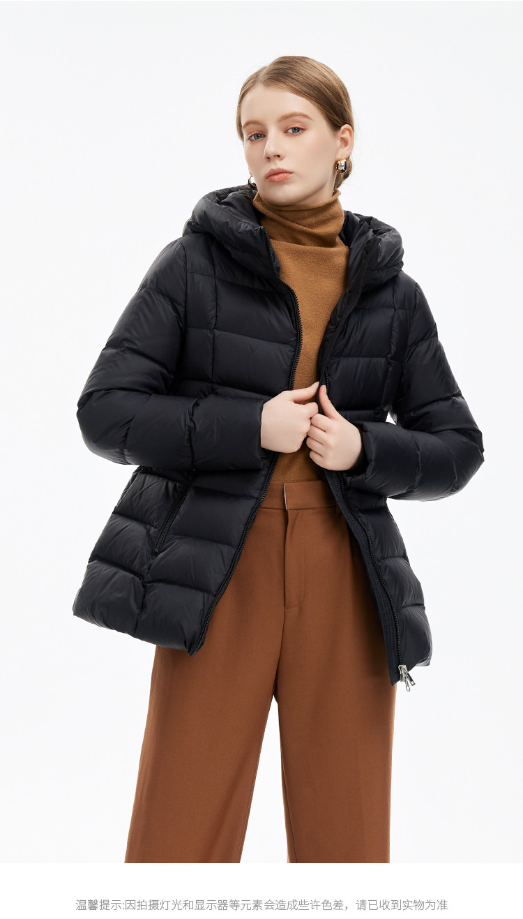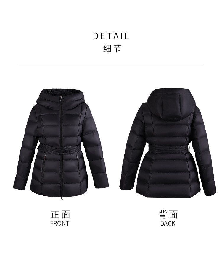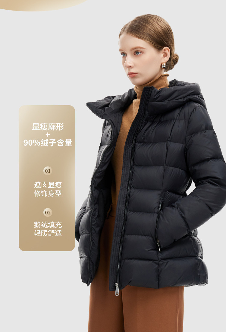 商品名称:【鹅绒】百搭极简淑女风修身显瘦加厚连帽常规羽绒服 689759