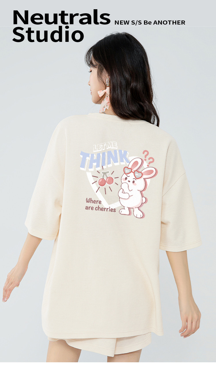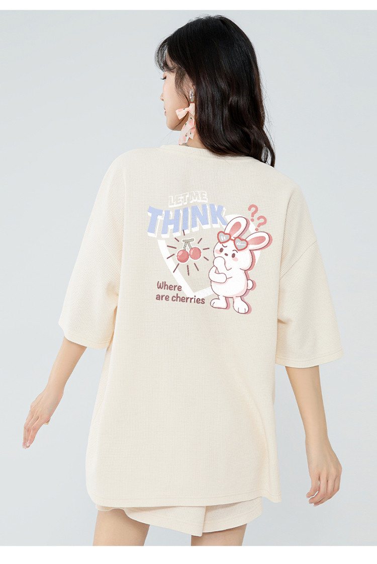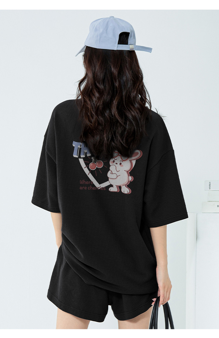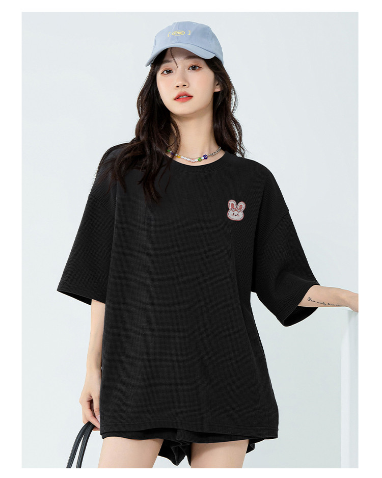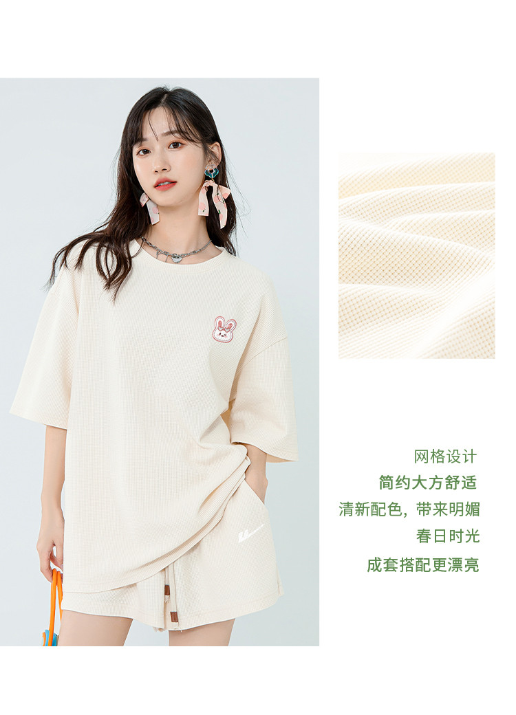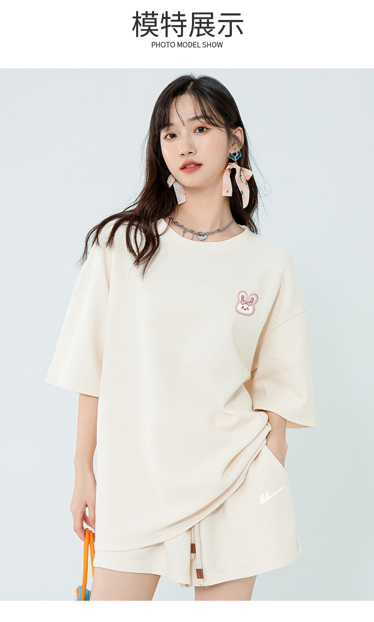 商品名称:【女装】华夫格运动套装女夏季宽松重磅中长T三分短裤两件套 741587