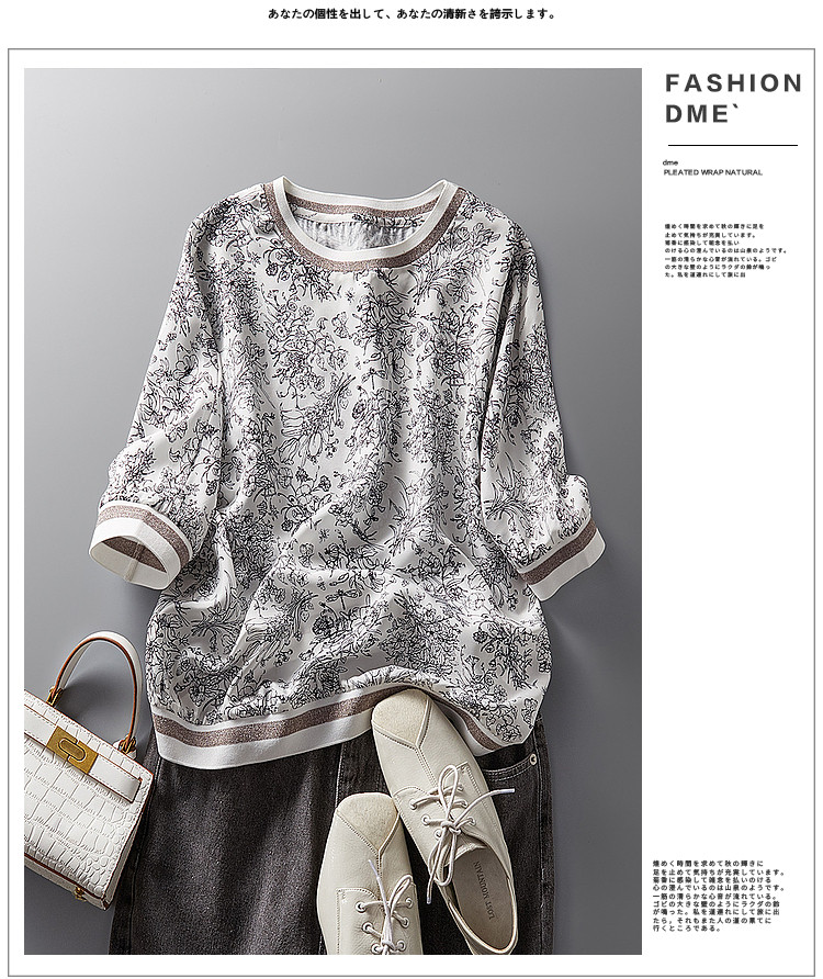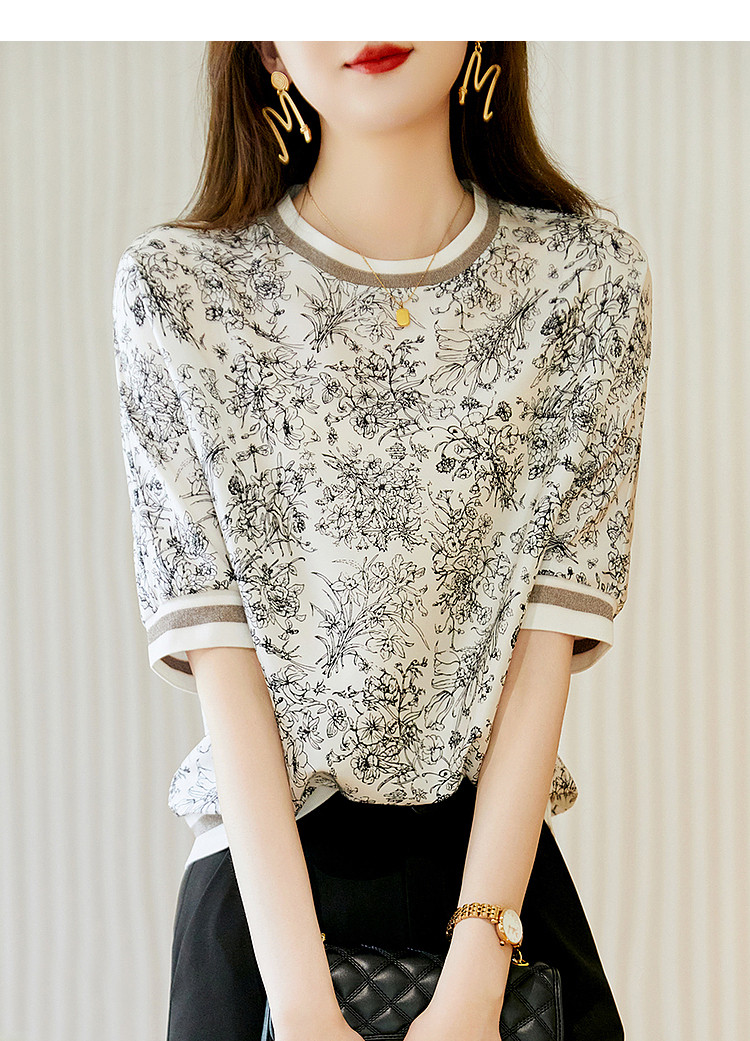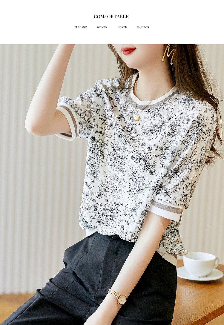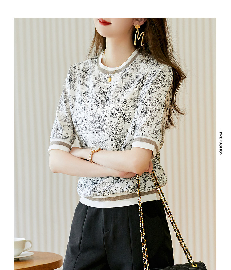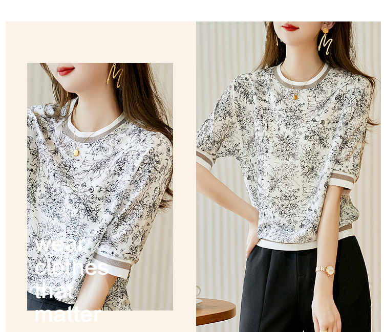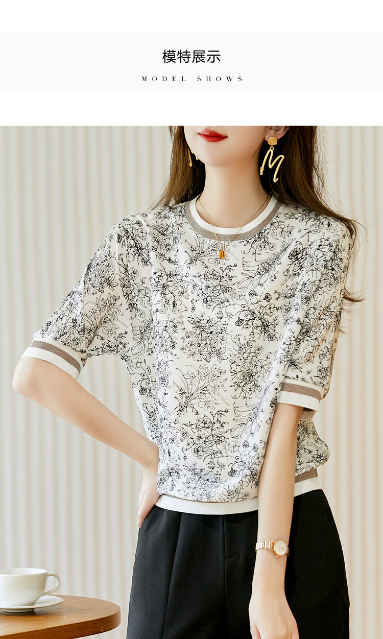 【水墨印花】夏金银丝圆领连肩袖五分袖衬衣女式上衣 078913