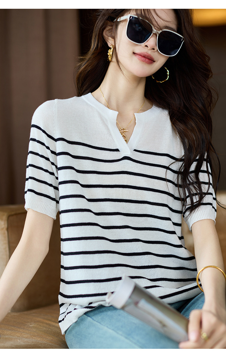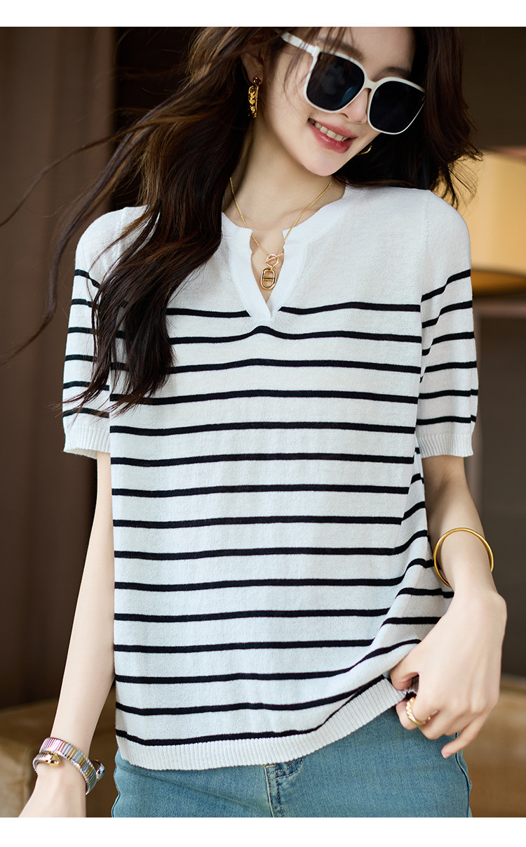 经典条纹针织T恤女2025春夏新款简约休闲V领显瘦短袖T恤女 994057