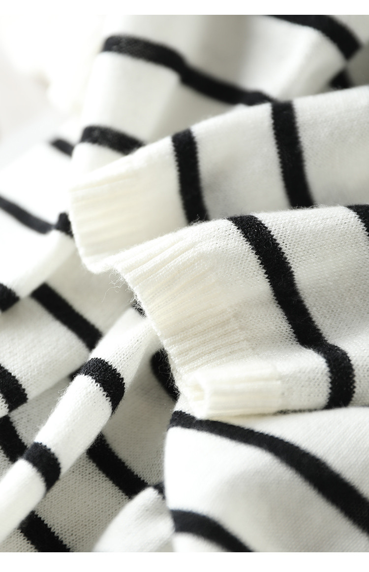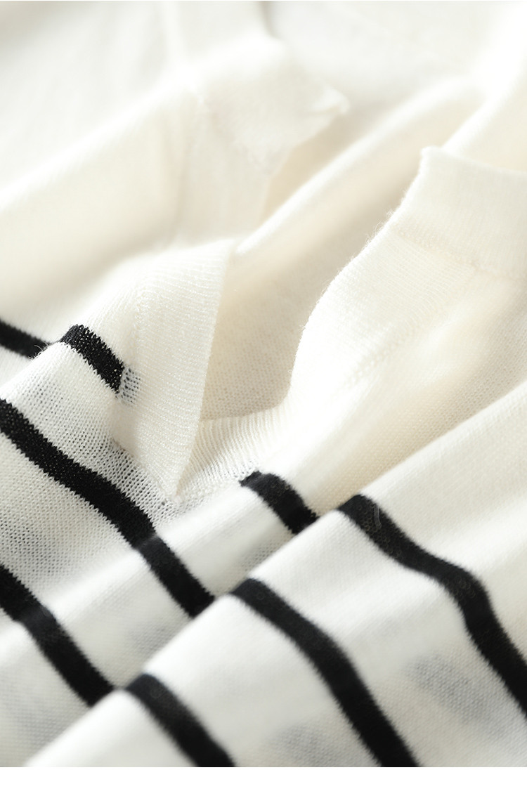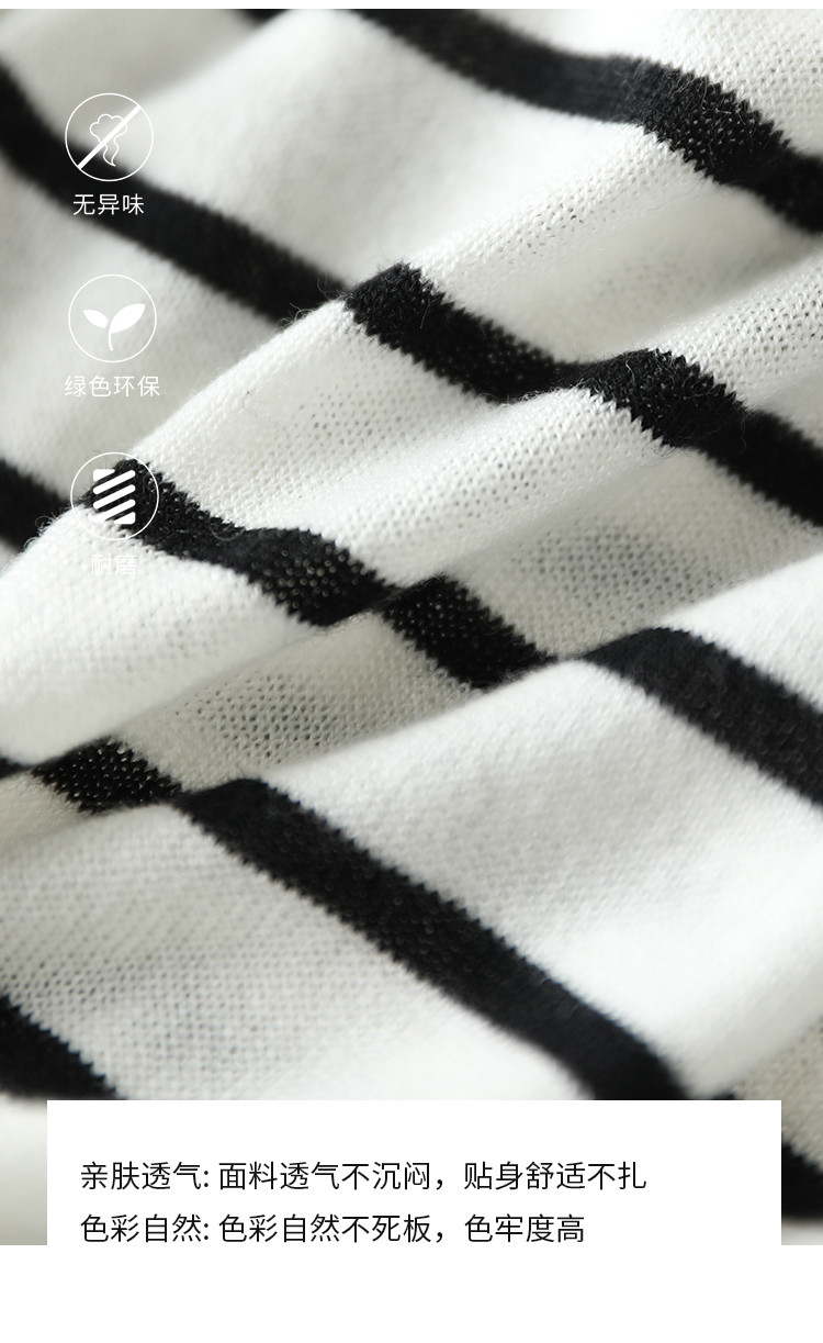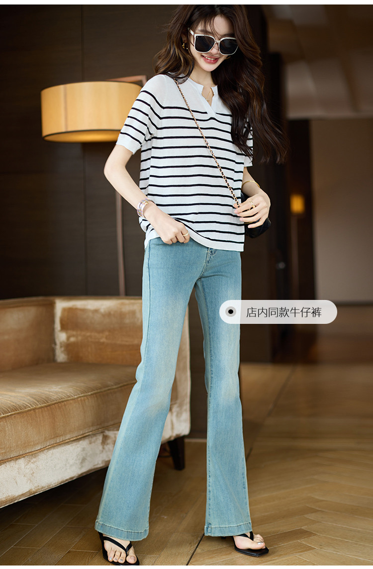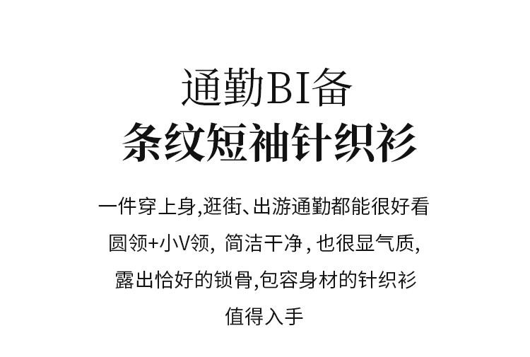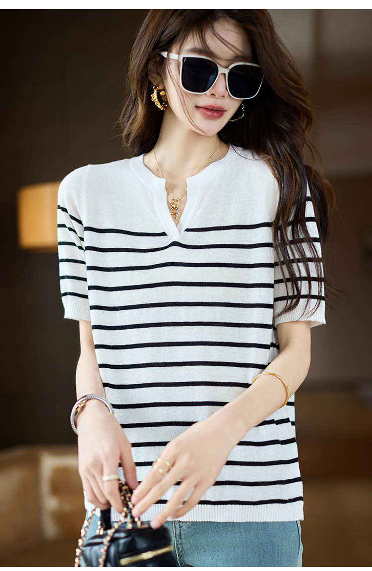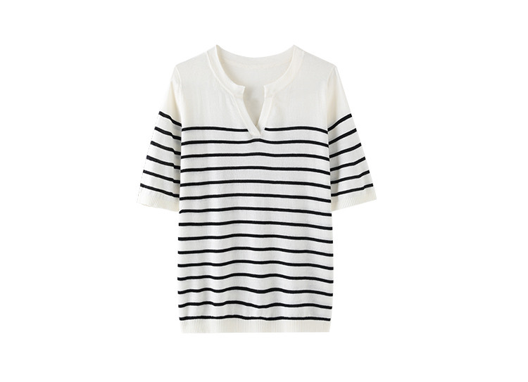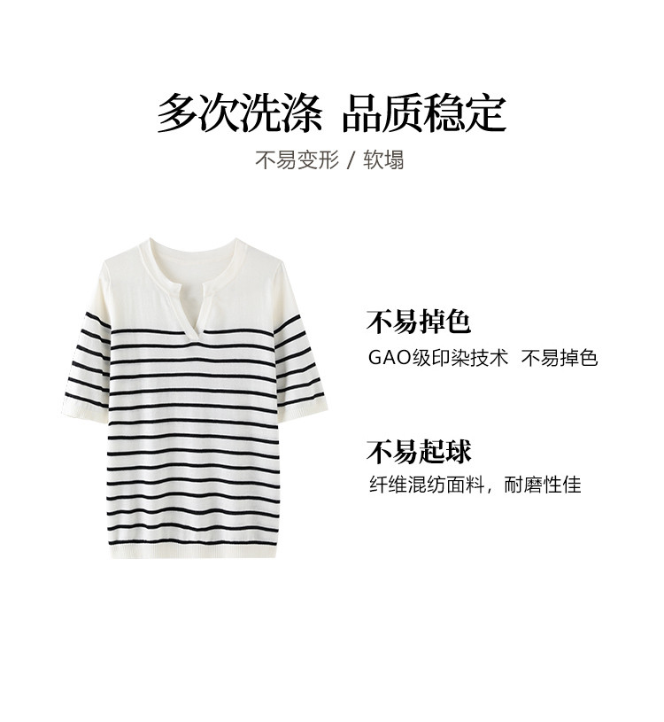 商品名称:经典条纹针织T恤女2025春夏新款简约休闲V领显瘦短袖T恤女 994057
