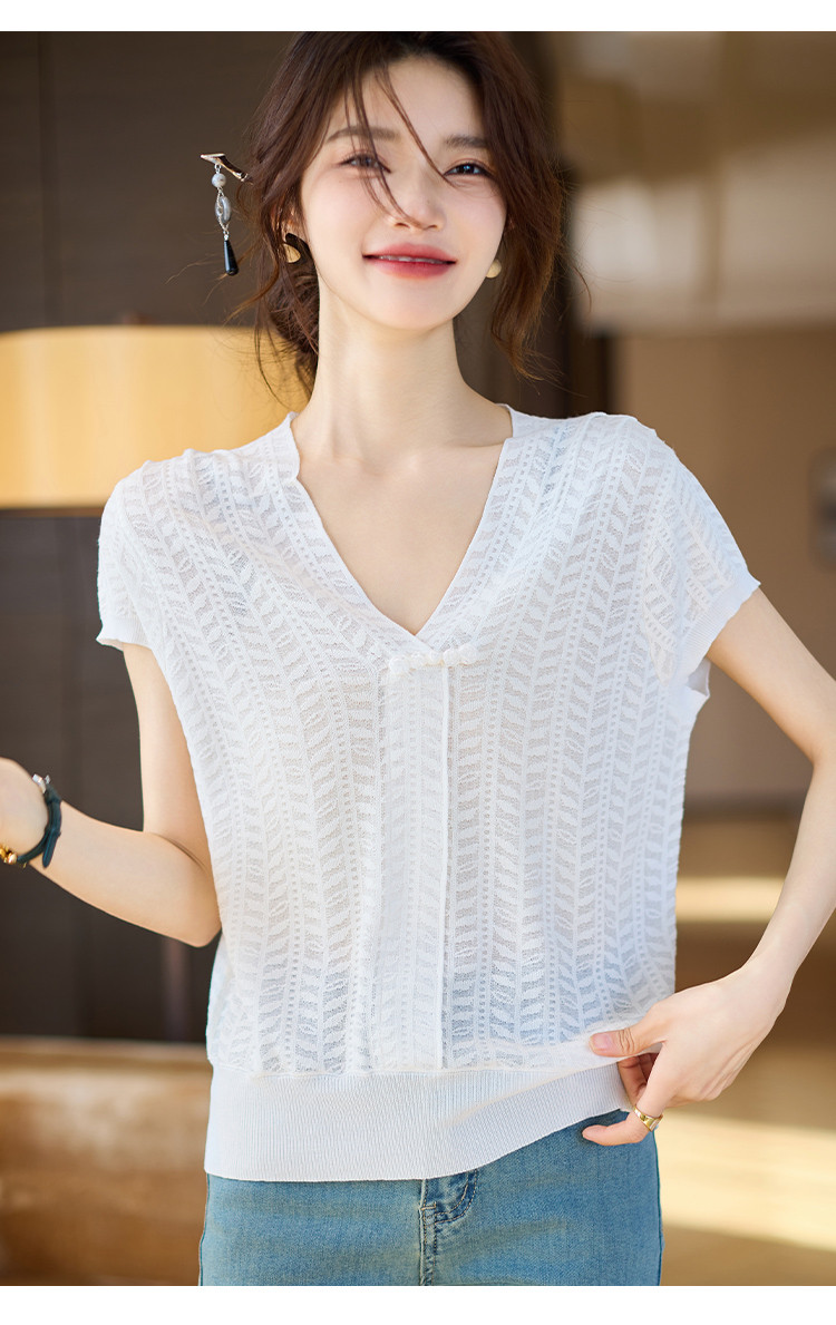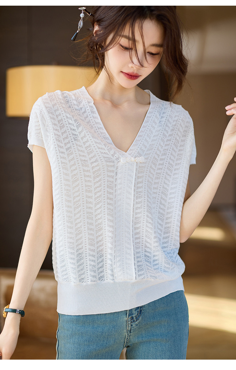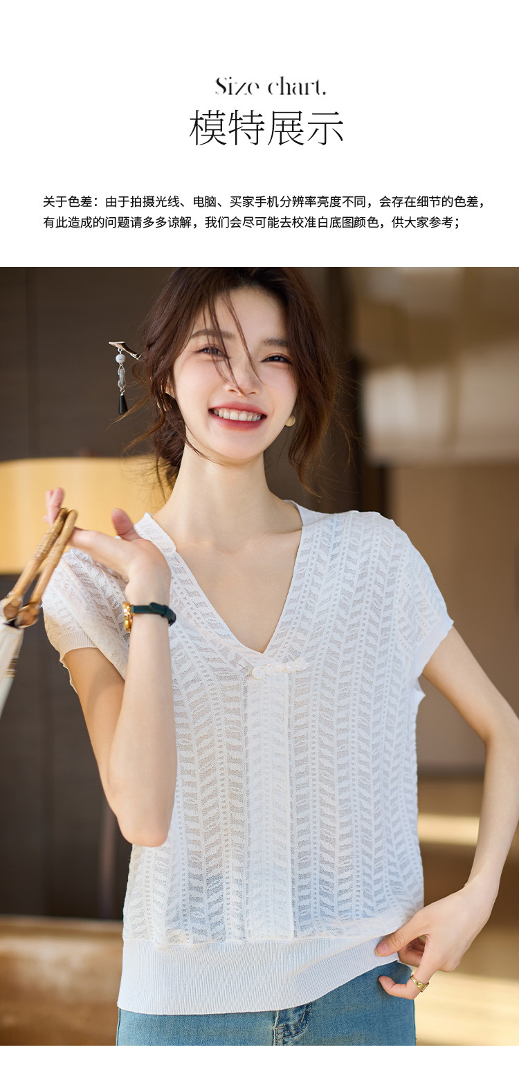 商品名称:短袖T恤2025夏季新款提花蕾丝肌理V领盘扣女式针织衫 673033