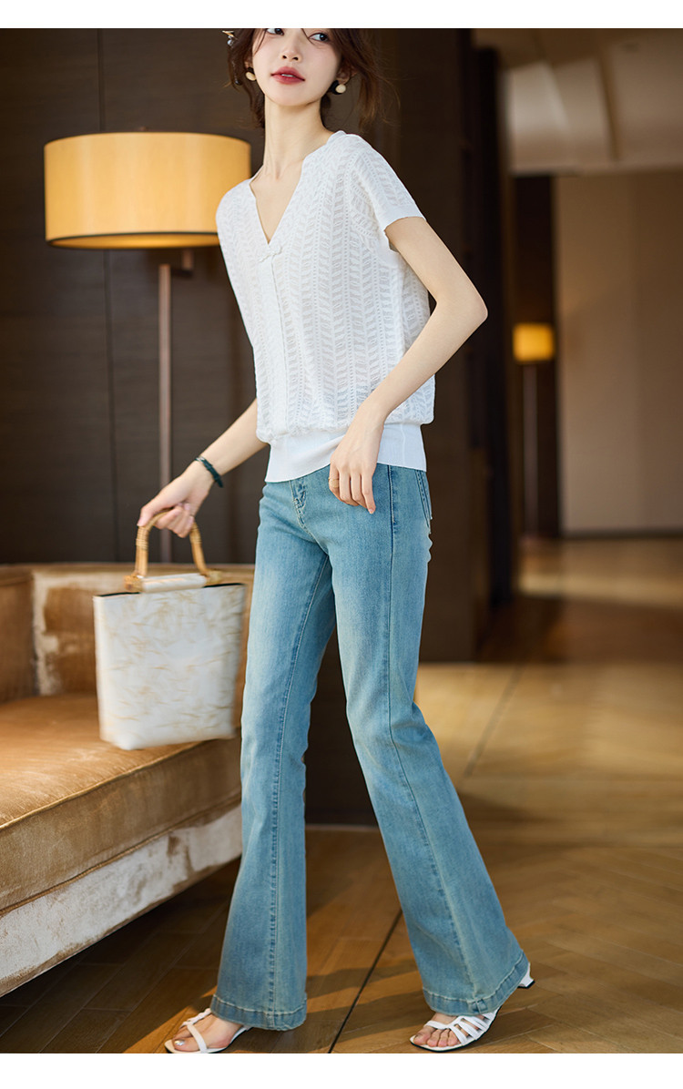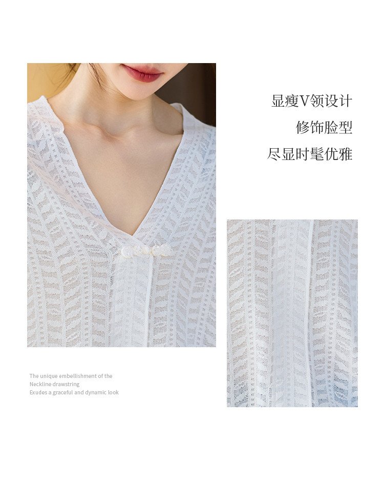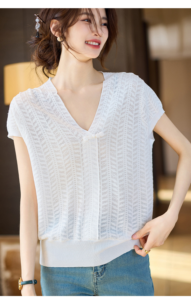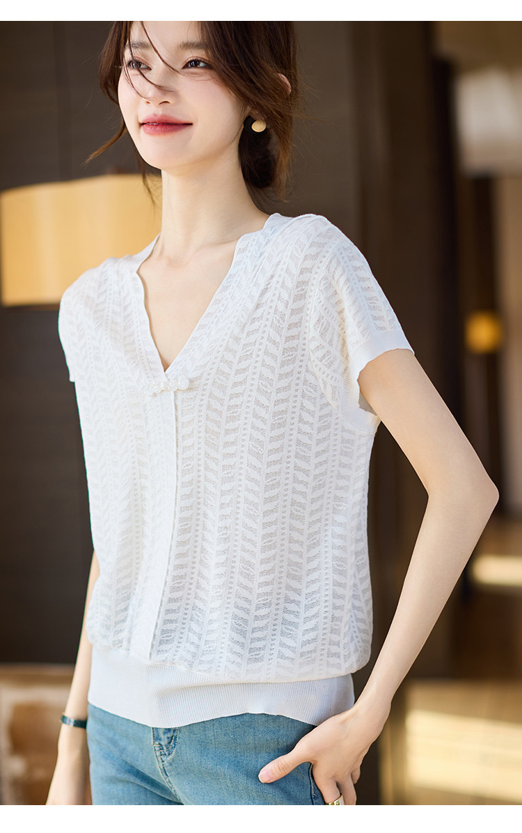 商品名称:短袖T恤2025夏季新款提花蕾丝肌理V领盘扣女式针织衫 673033