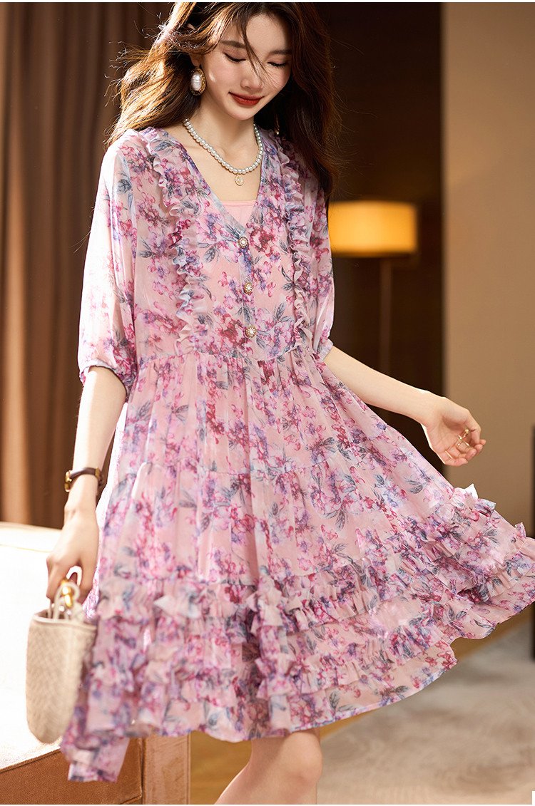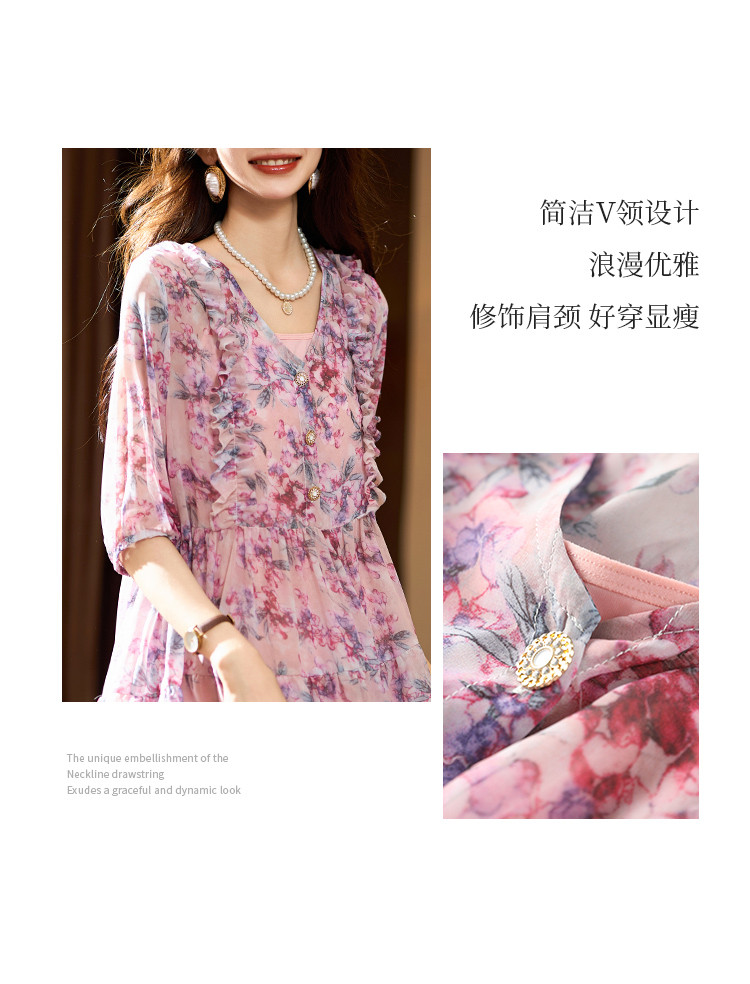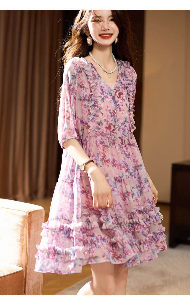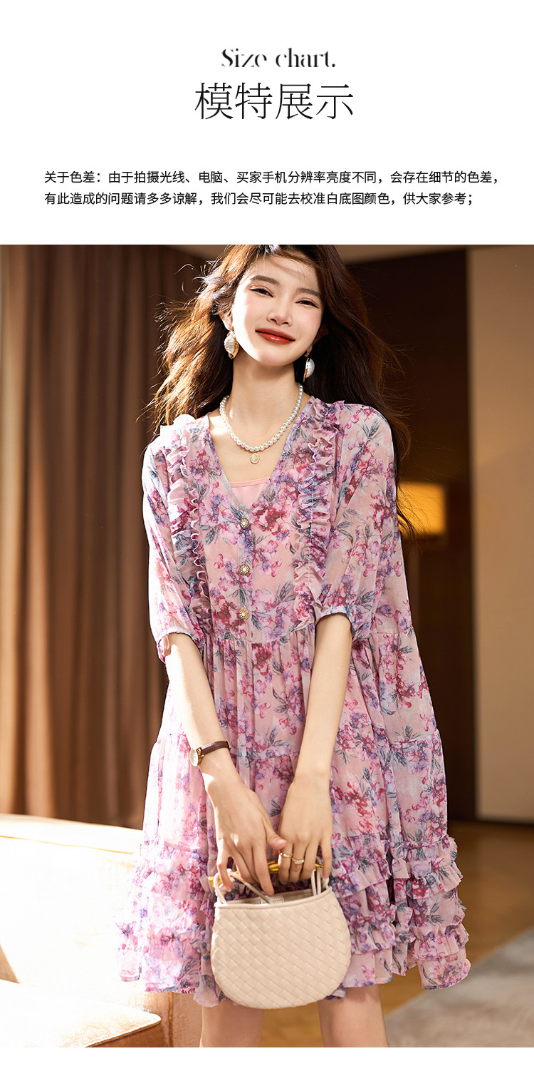 2025夏季新款荷叶边雪纺印花连衣裙女装飘逸灵动中长裙子女装 274633