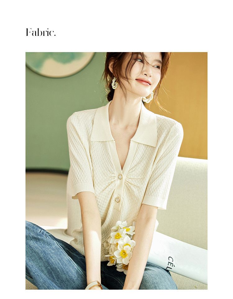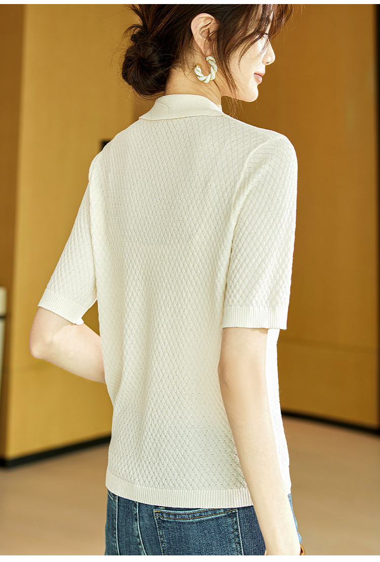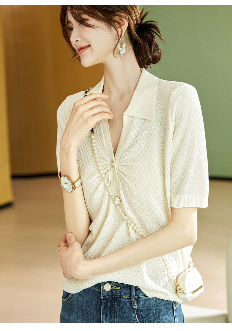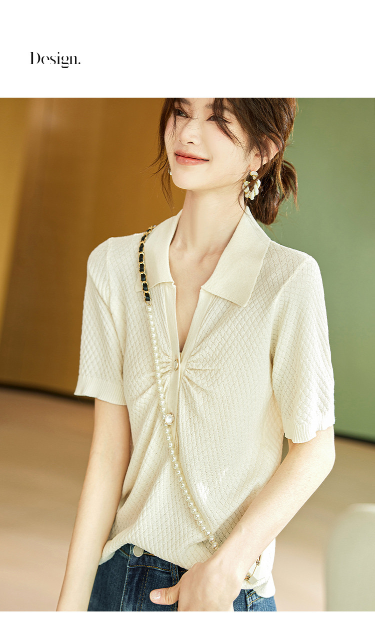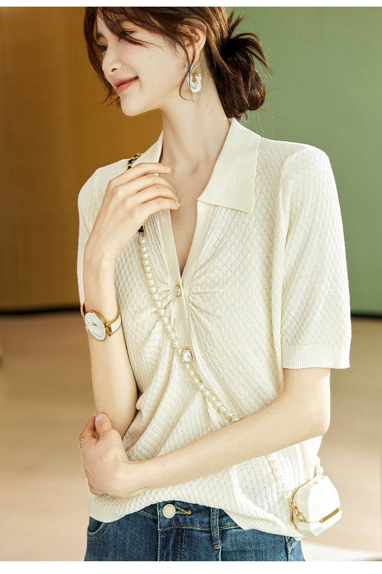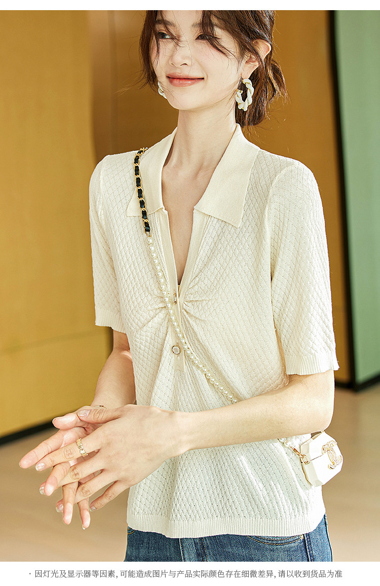 商品名称:甜美短袖T恤2025夏季新款通勤休闲上衣翻领设计感休闲针织衫 713033