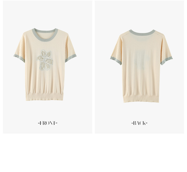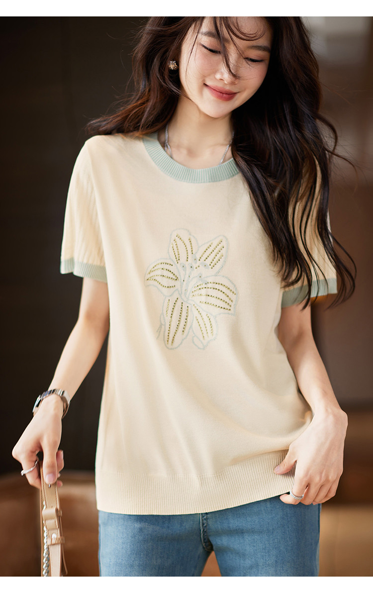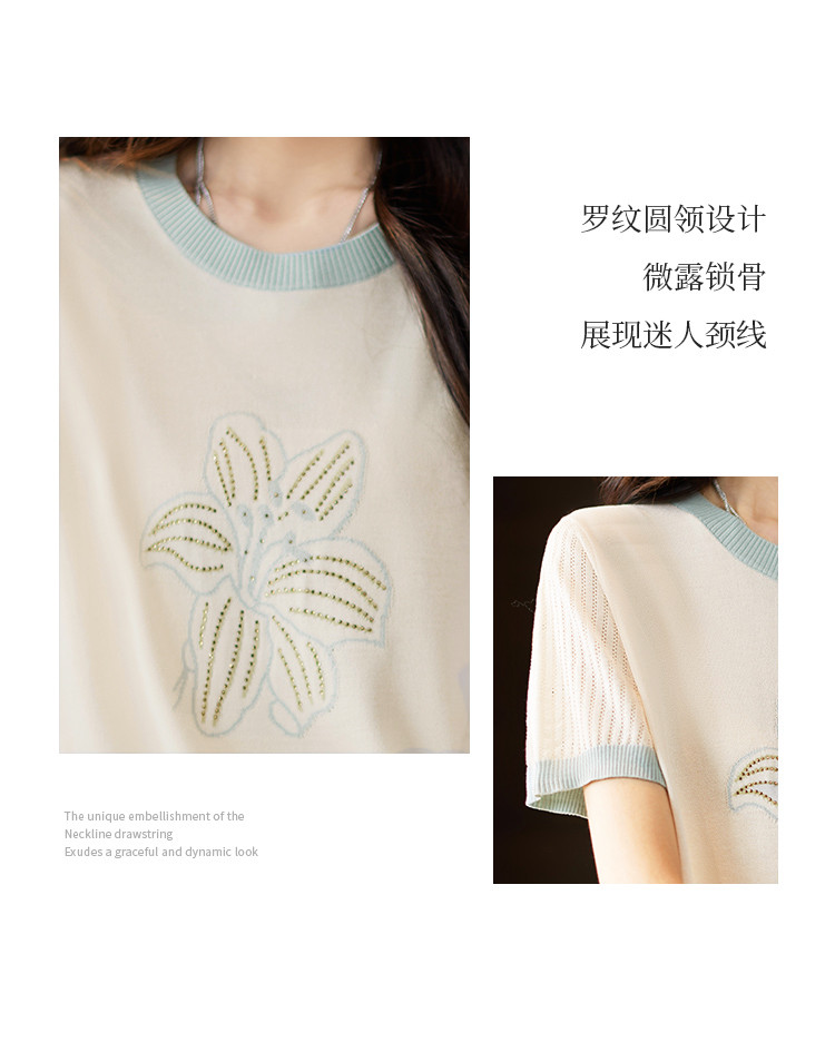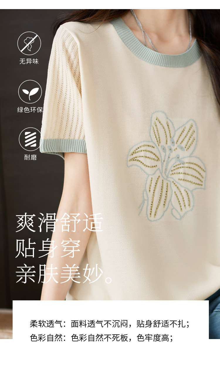 商品名称:清新撞色短袖T恤女夏季新款轻薄舒适烫钻提花显瘦洋气短袖针织衫 241609