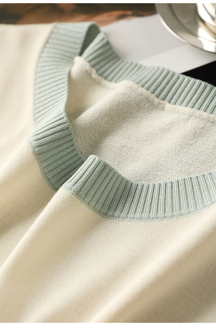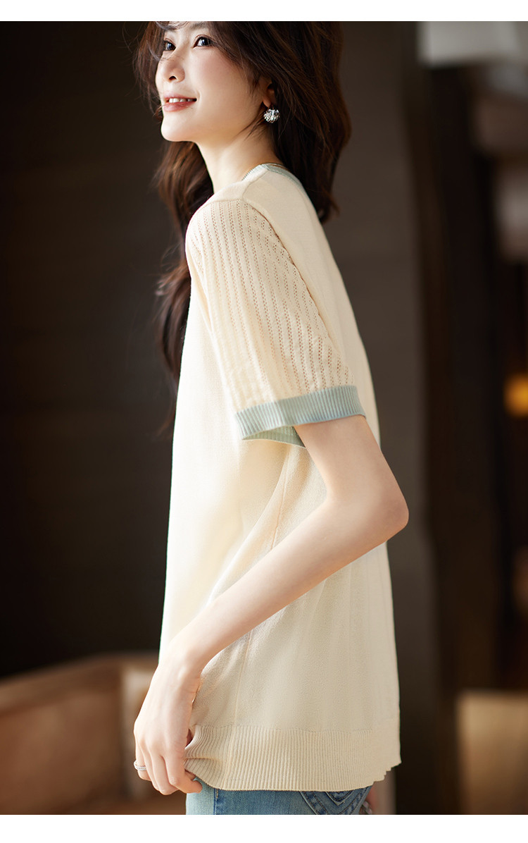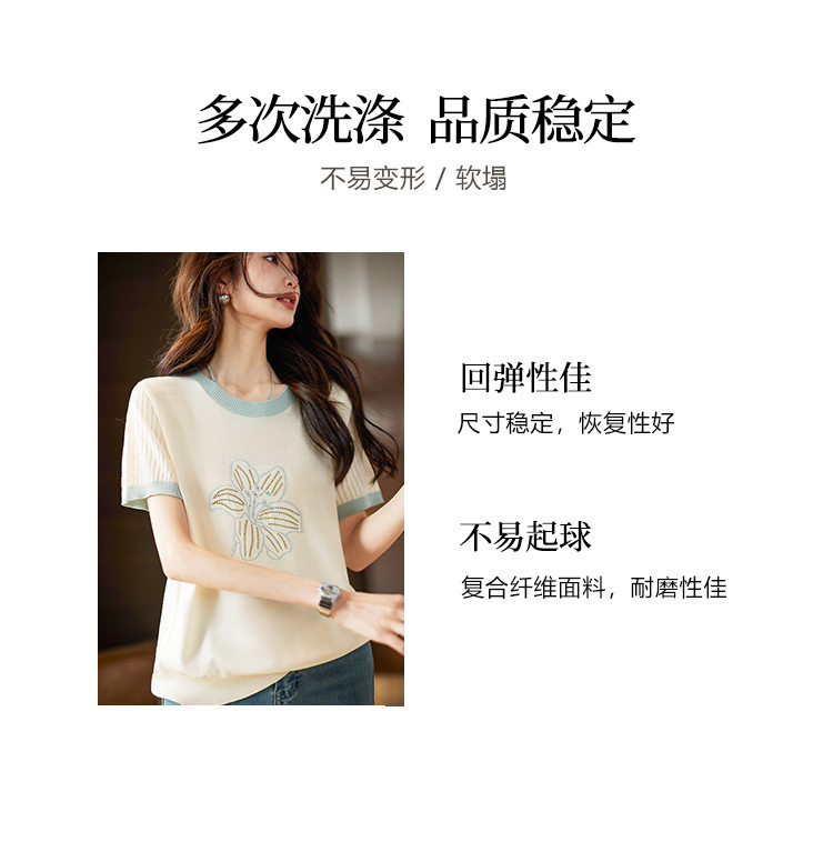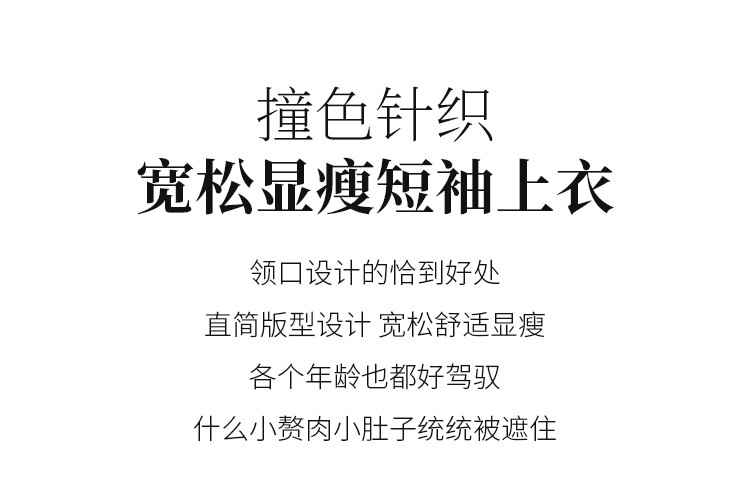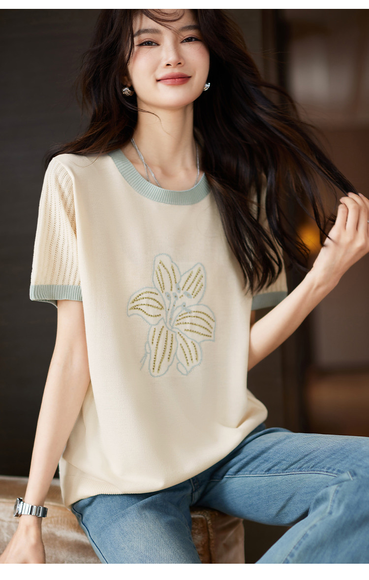 商品名称:清新撞色短袖T恤女夏季新款轻薄舒适烫钻提花显瘦洋气短袖针织衫 241609