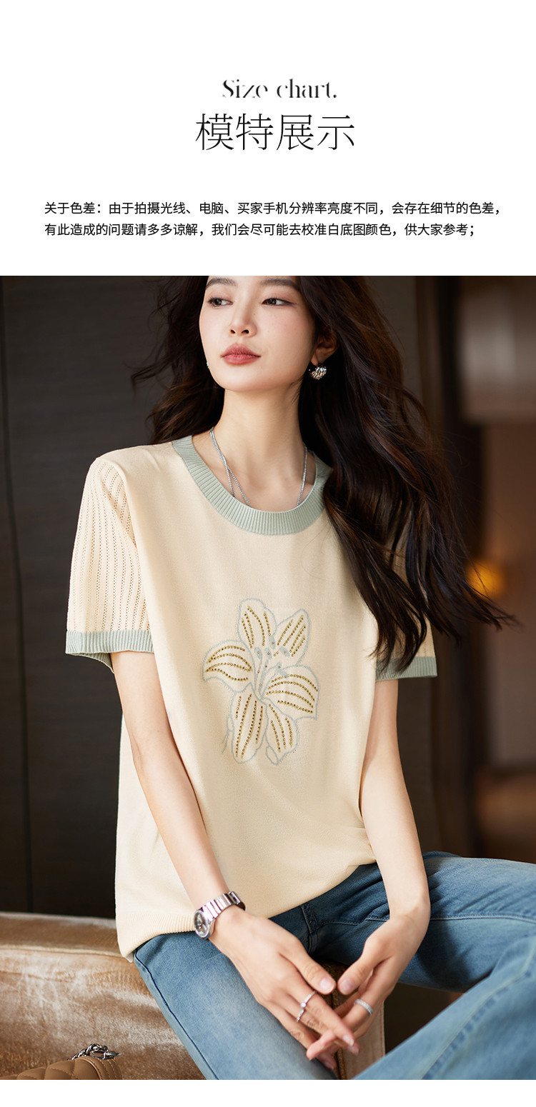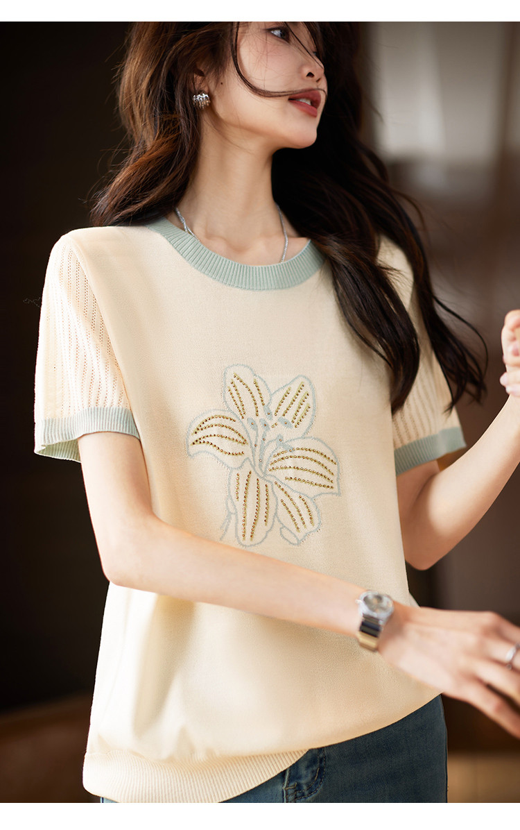 清新撞色短袖T恤女夏季新款轻薄舒适烫钻提花显瘦洋气短袖针织衫 241609