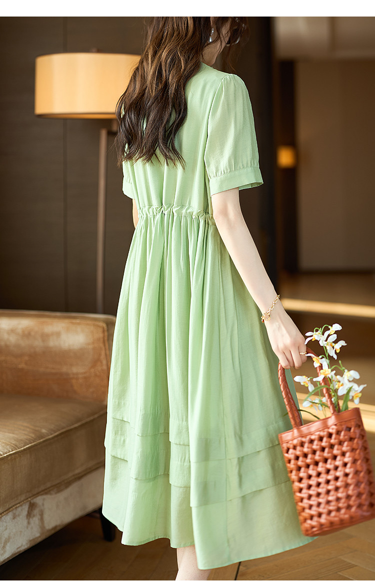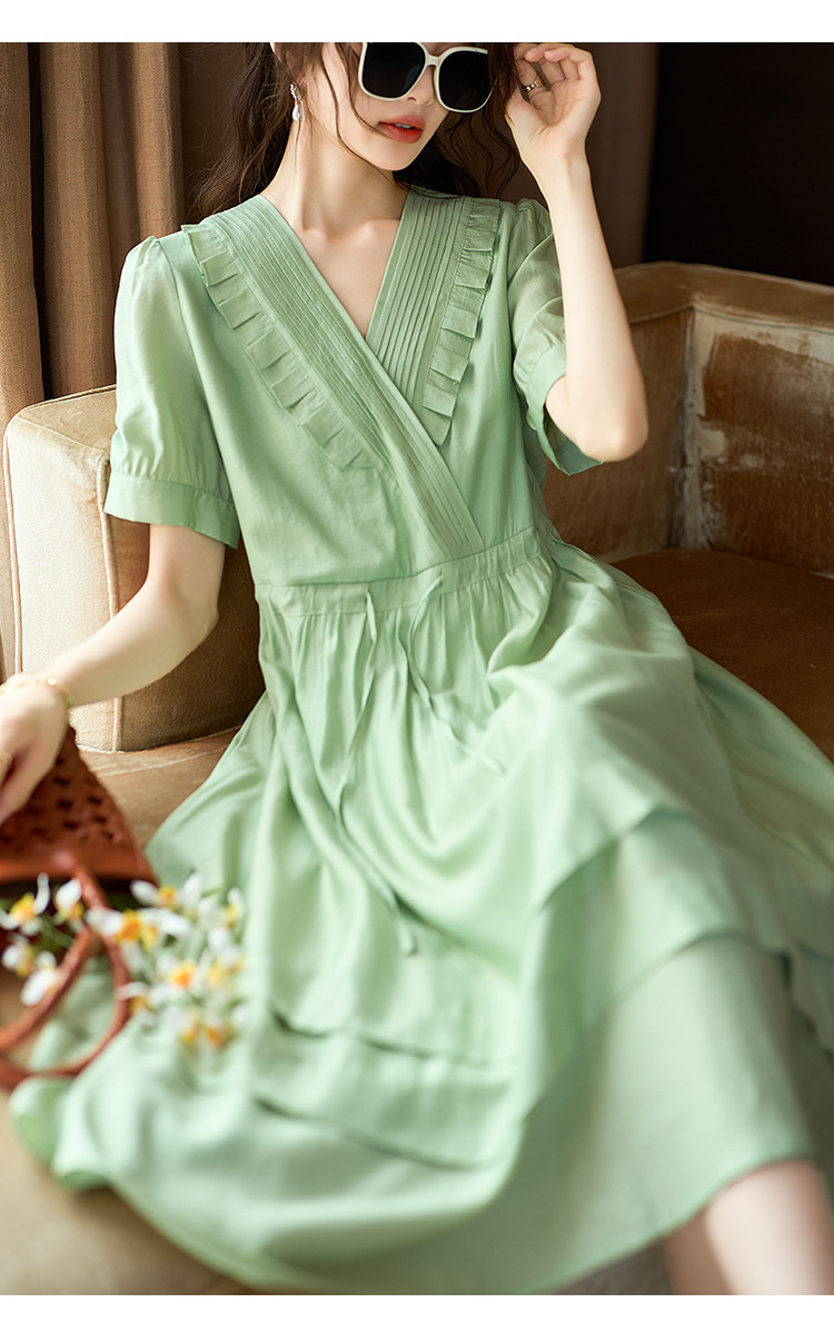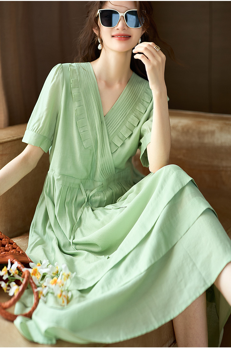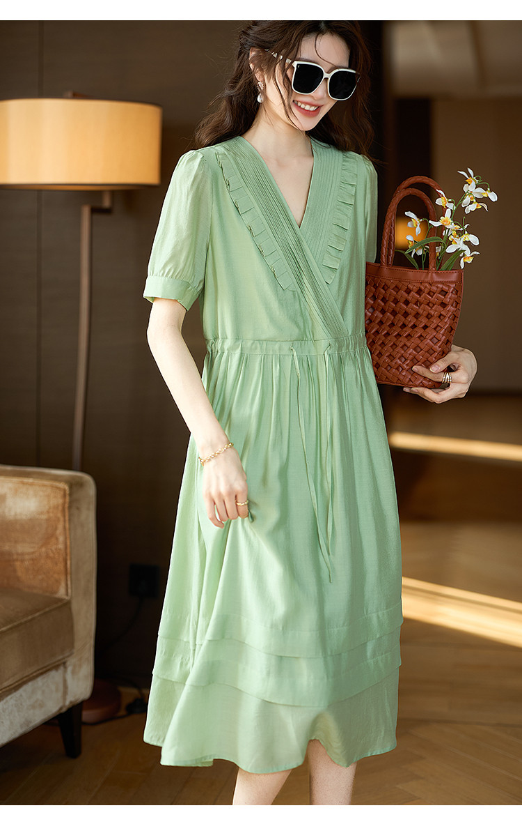 商品名称:清新荷叶领连衣裙2025夏季新款优雅文艺V领收腰显瘦连衣裙女 602121