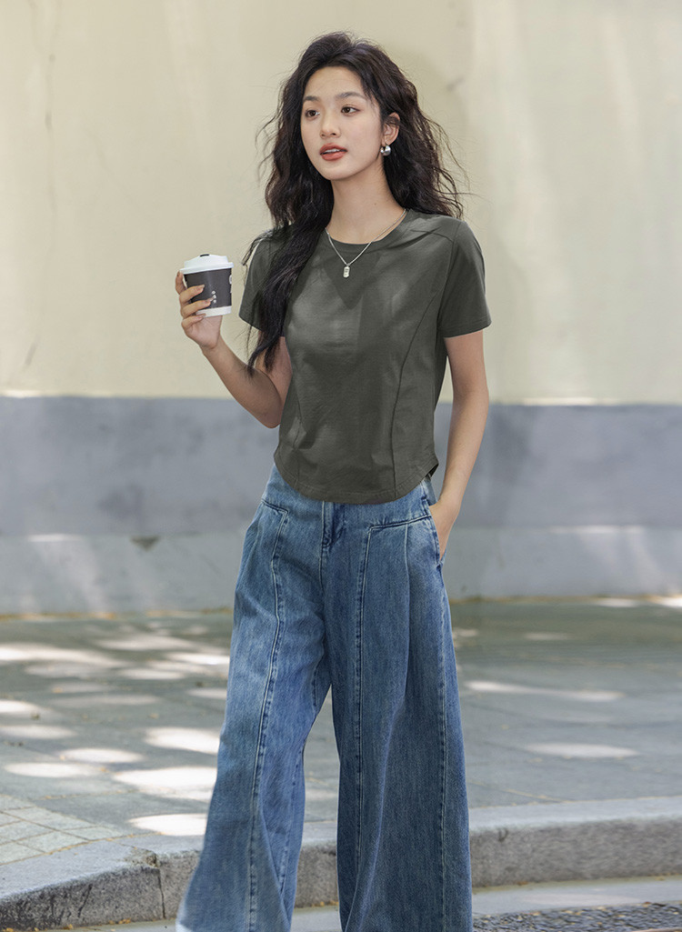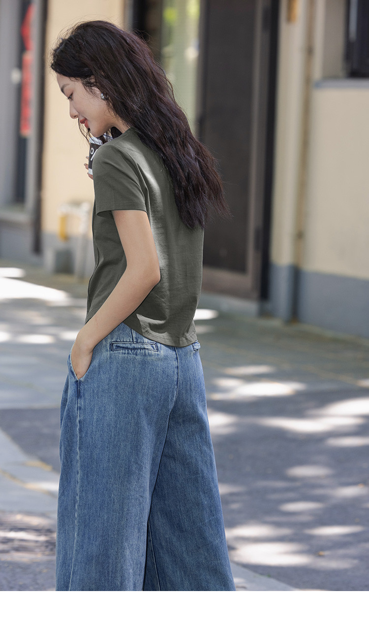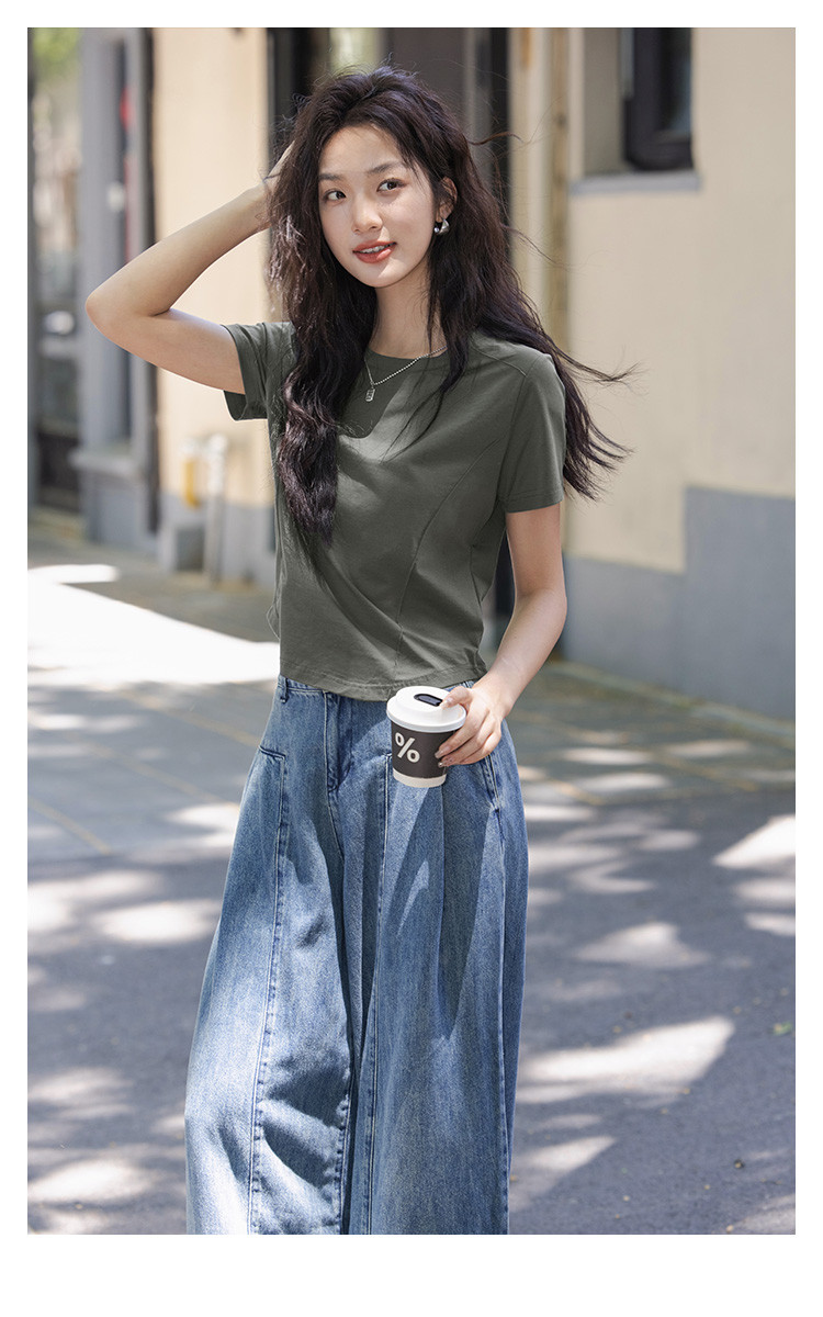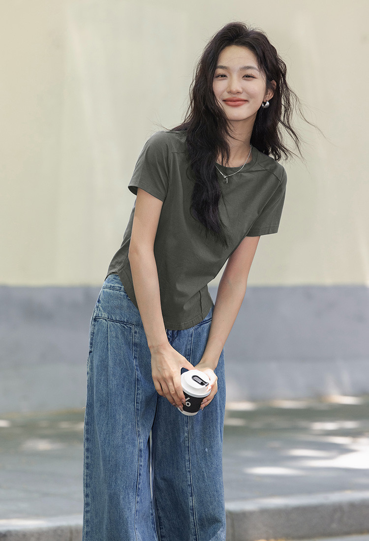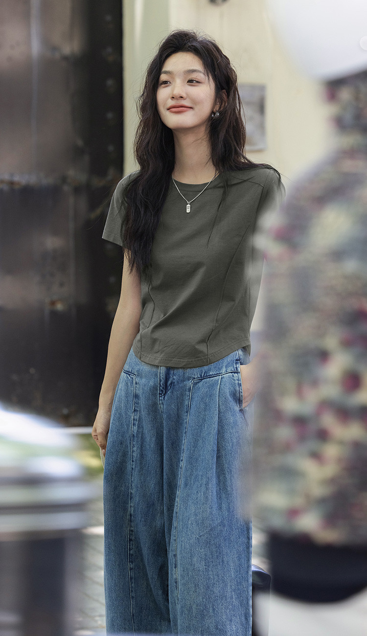 【炭灰正肩短袖】夏圆领舒适感立体压线装饰短袖T恤女 693762
