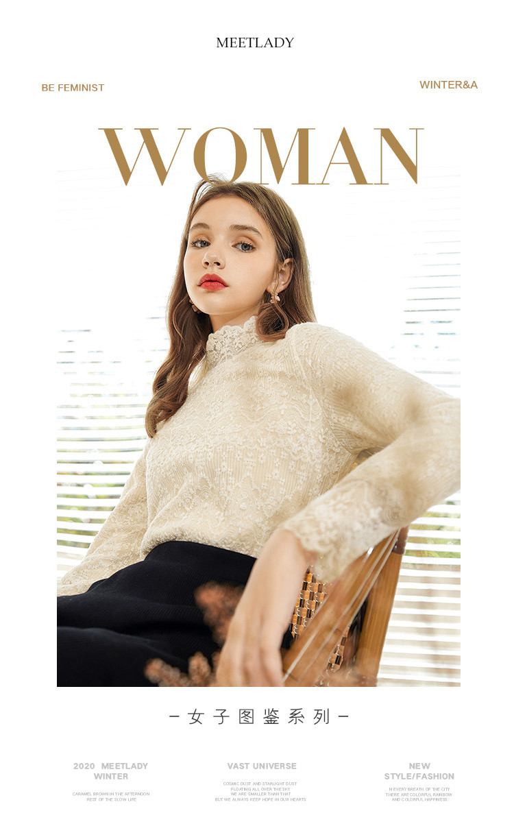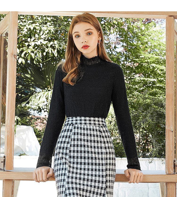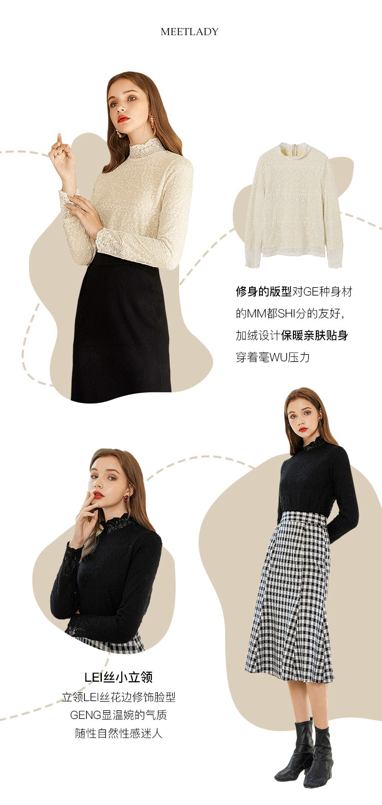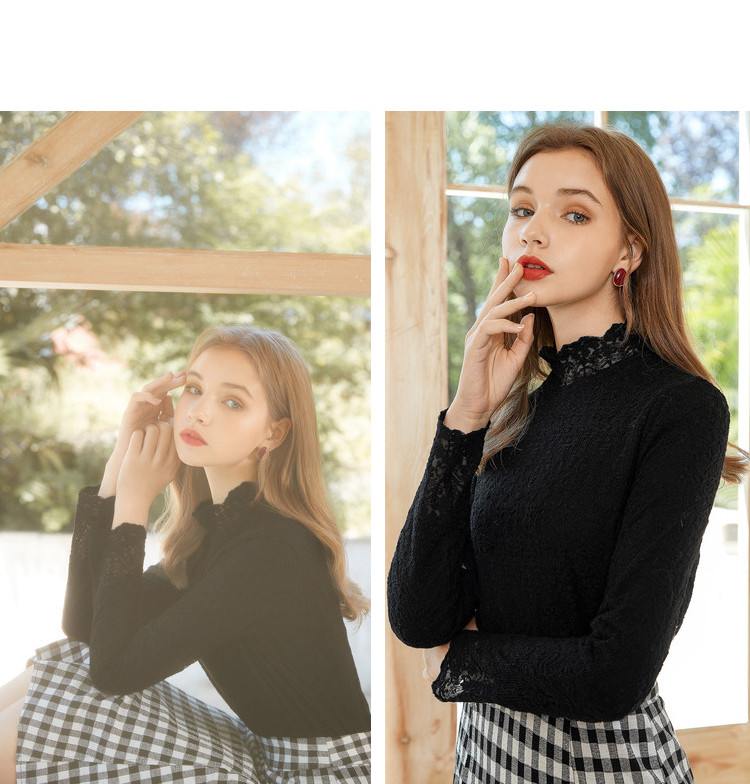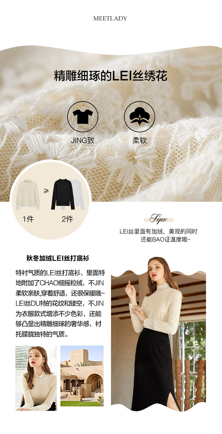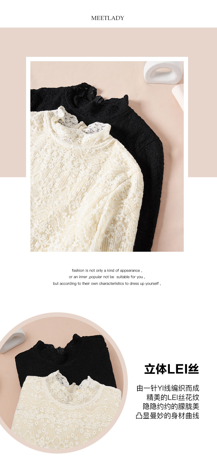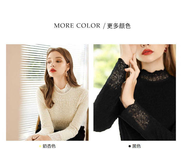 商品名称:【女子图鉴】冬装半高领打底衫女蕾丝绣花网纱内搭上衣 002260